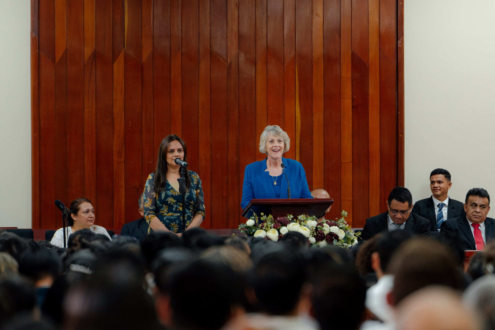 El élder Renlund y su esposa, la hermana Ruth Renlund, estuvieron acompañados por el élder Patricio M. Giuffra, Setenta Autoridad General y miembro de la presidencia del Área Centroamérica, y su esposa, la hermana María Eugenia Giuffra, así como por el élder Favio M. Durán, Setenta de Área, y su esposa, la hermana Nusly Durán.