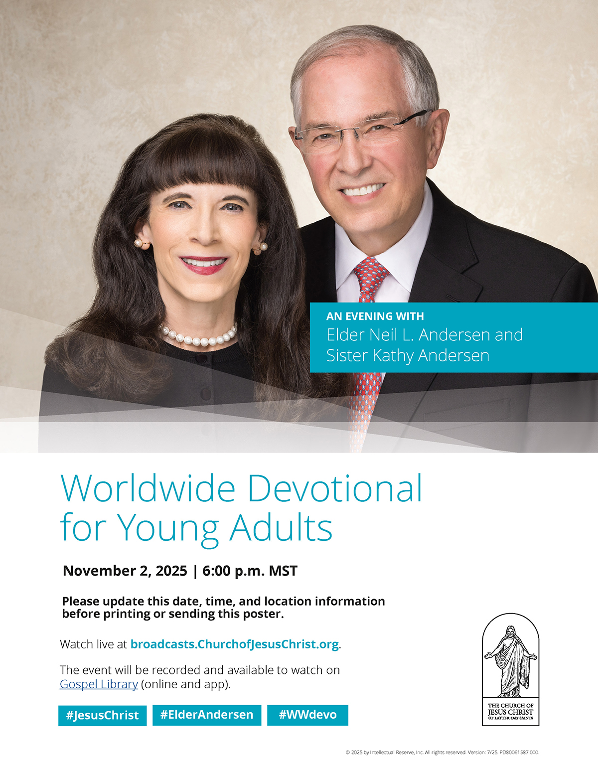 Elder Neil L. Andersen of the Quorum of the Twelve Apostles of The Church of Jesus Christ of Latter-day Saints, and his wife, Kathy, speak during a Worldwide Devotional for Young Adults. The broadcast was filmed in Washington, D.C., on October 18, 2025, for availability on November 2 in the Americas and on November 9 elsewhere.2025 by Intellectual Reserve, Inc. All rights reserved.Elder Neil L. Andersen and his wife, Sister Kathy Andersen, speaking from the grounds of the Washington D.C. Temple, will share messages specifically for young adults during a Worldwide Devotional for Young Adults broadcast titled “The Prophet and the Temple Point Us to Jesus Christ.”