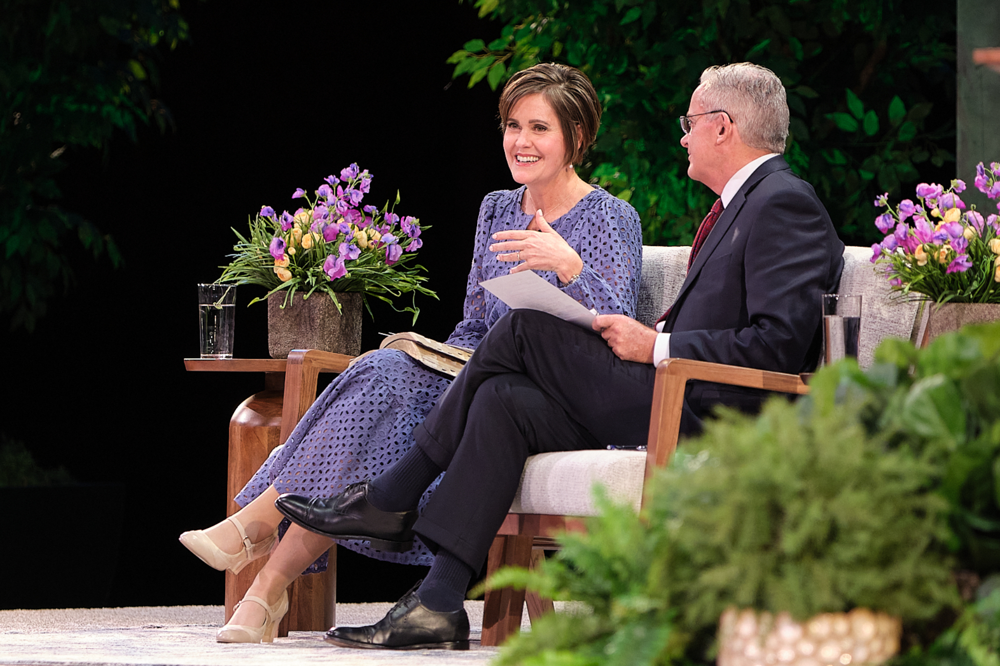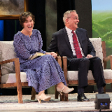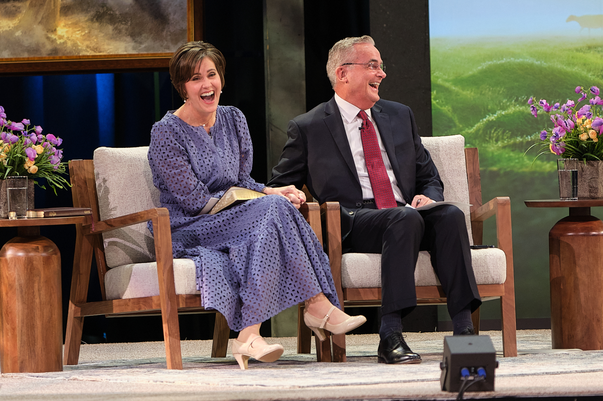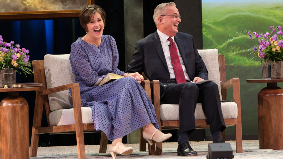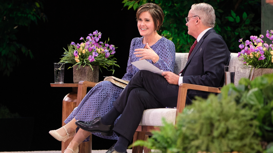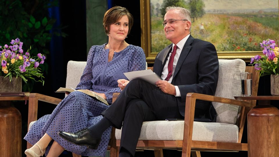 Elder Patrick Kearon of the Quorum of the Twelve Apostles of The Church of Jesus Christ of Latter-day Saints and his wife, Jennifer, laugh during the Worldwide Devotional for Young Adults on Sunday, February 1, 2026, at the Conference Center in Salt Lake City.2026 by Intellectual Reserve, Inc. All rights reserved.