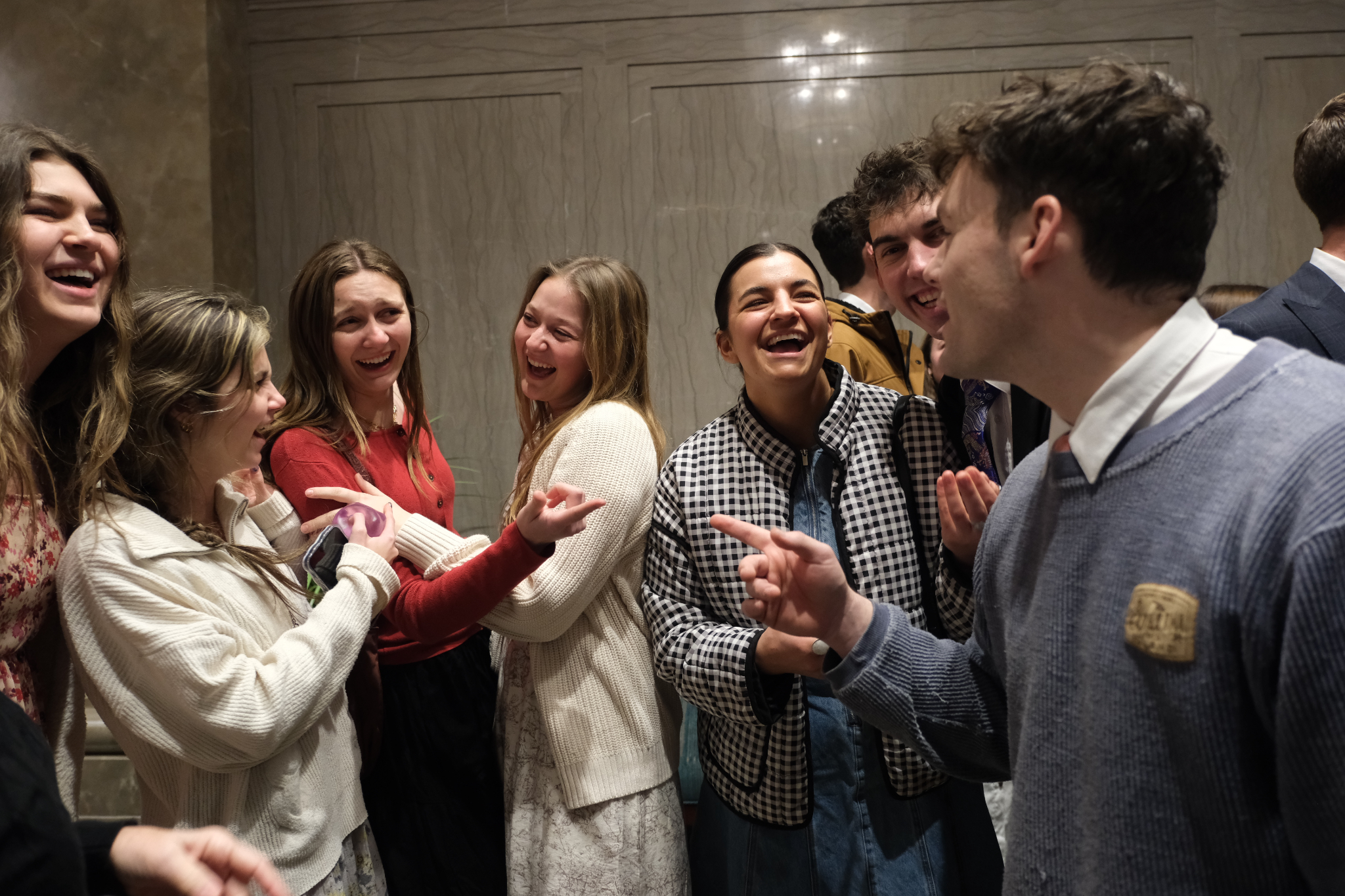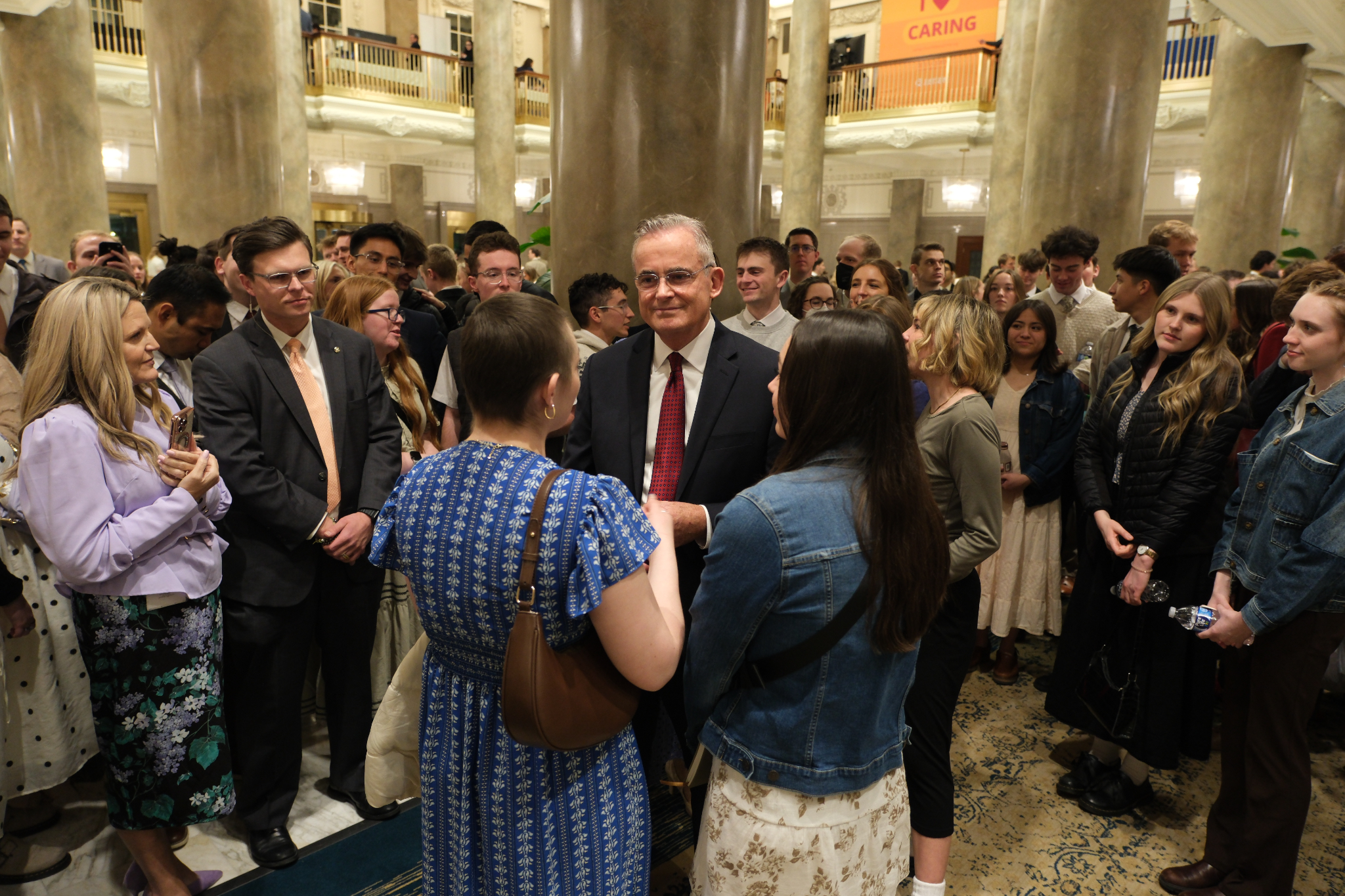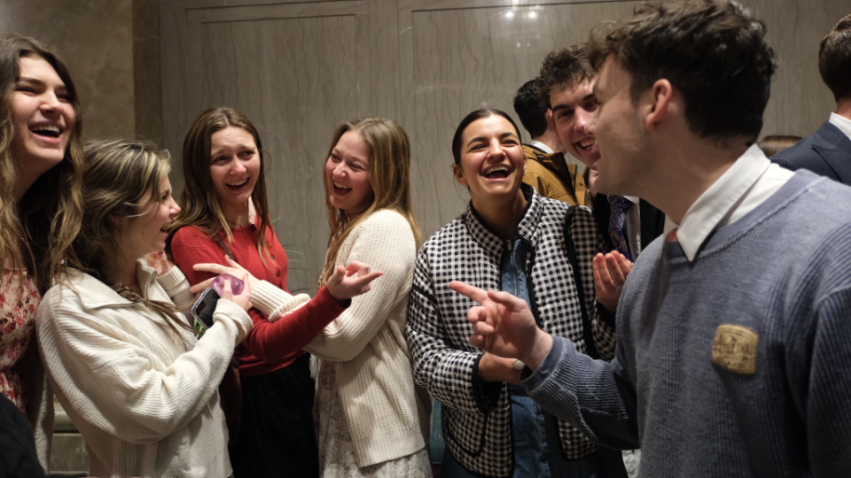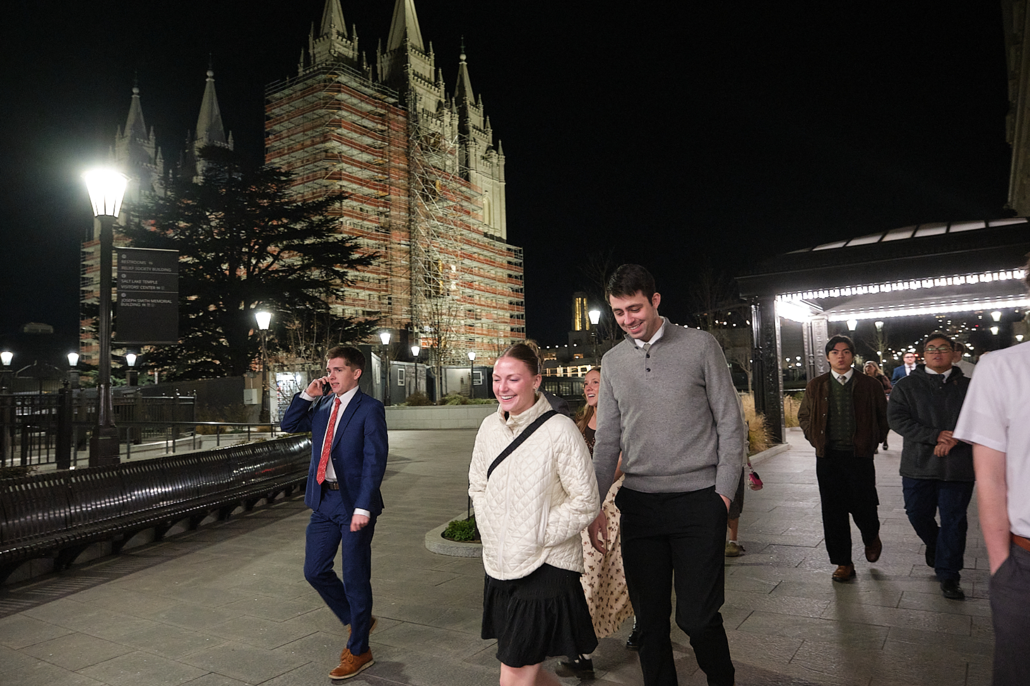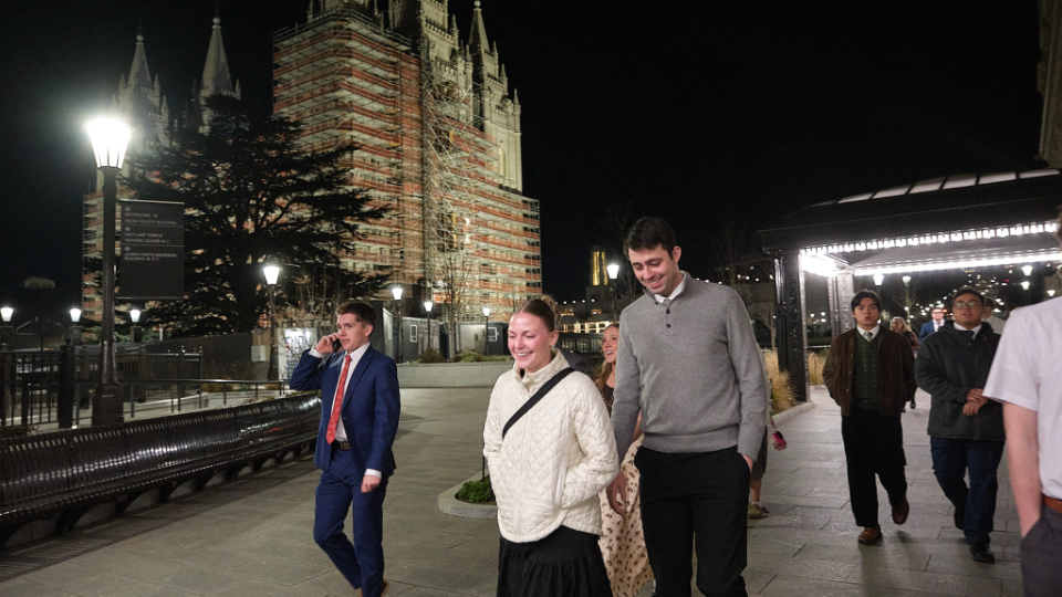 Young adults of The Church of Jesus Christ of Latter-day Saints visit in the Joseph Smith Memorial Building on Temple Square following the Worldwide Devotional broadcast on Sunday, February 1, 2026.2026 by Intellectual Reserve, Inc. All rights reserved.