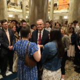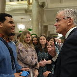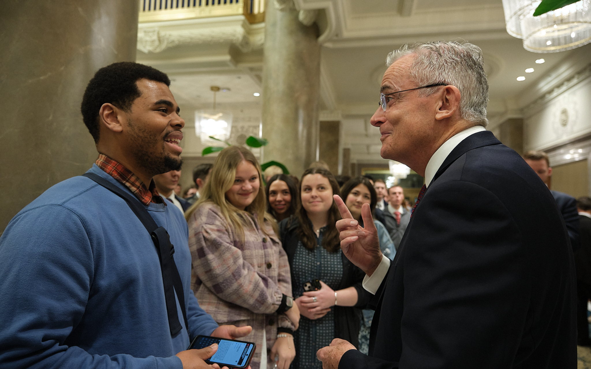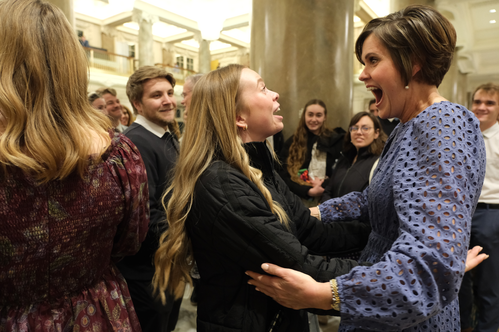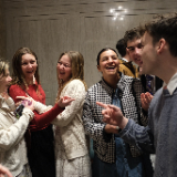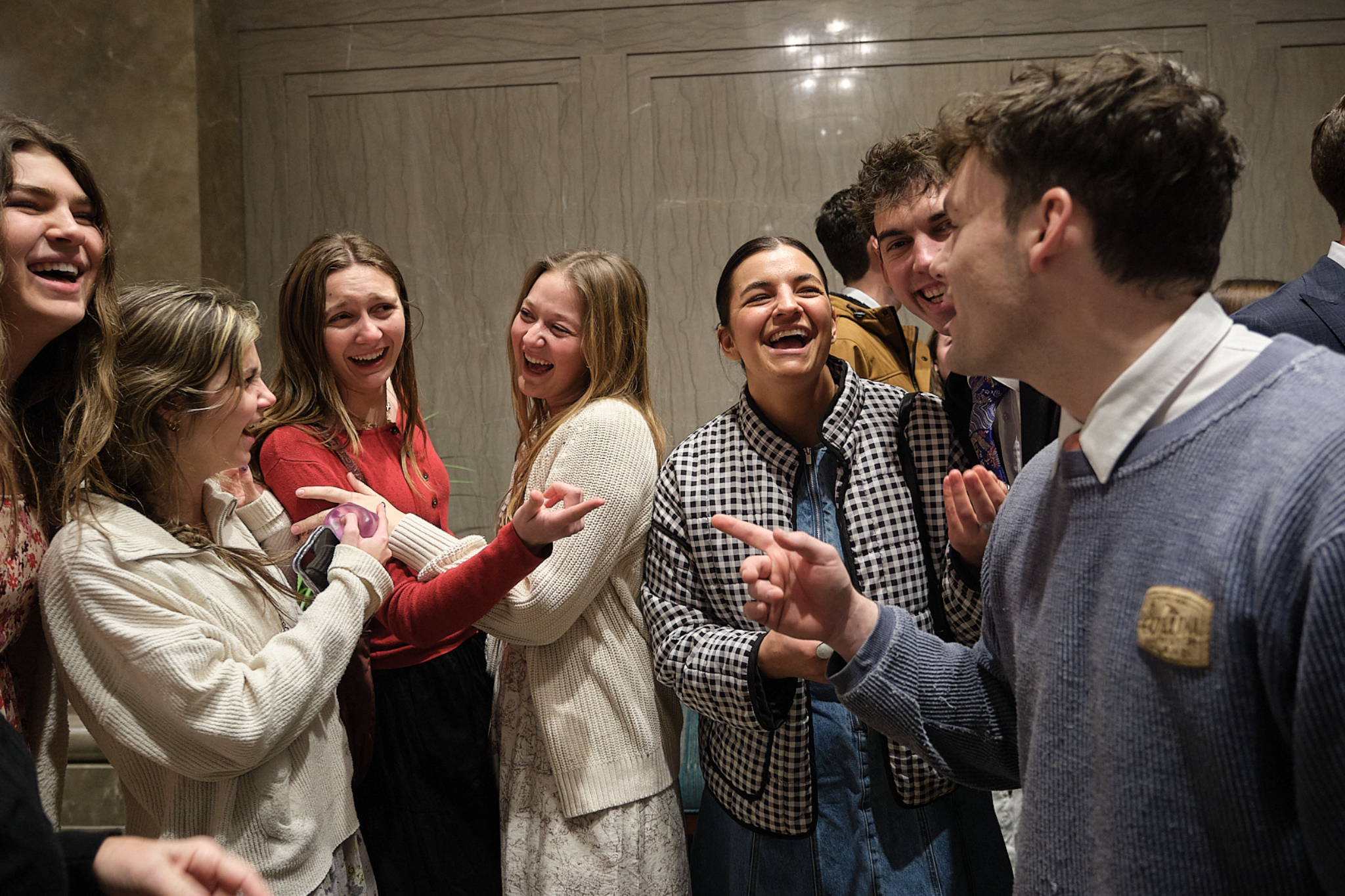 Young adults of The Church of Jesus Christ of Latter-day Saints visit in the Joseph Smith Memorial Building on Temple Square following the Worldwide Devotional broadcast on Sunday, February 1, 2026.2026 by Intellectual Reserve, Inc. All rights reserved.