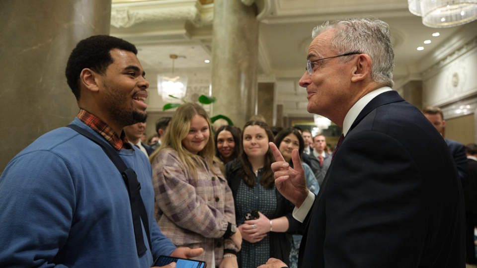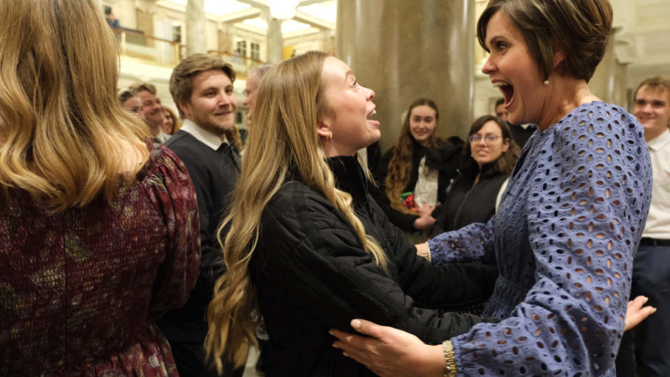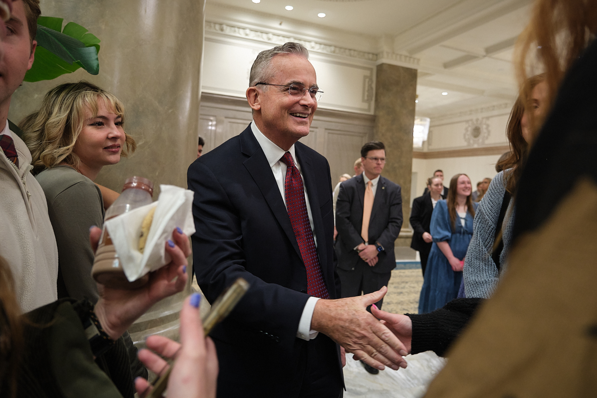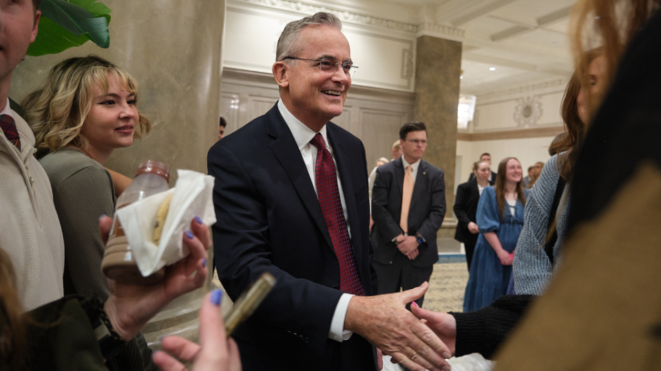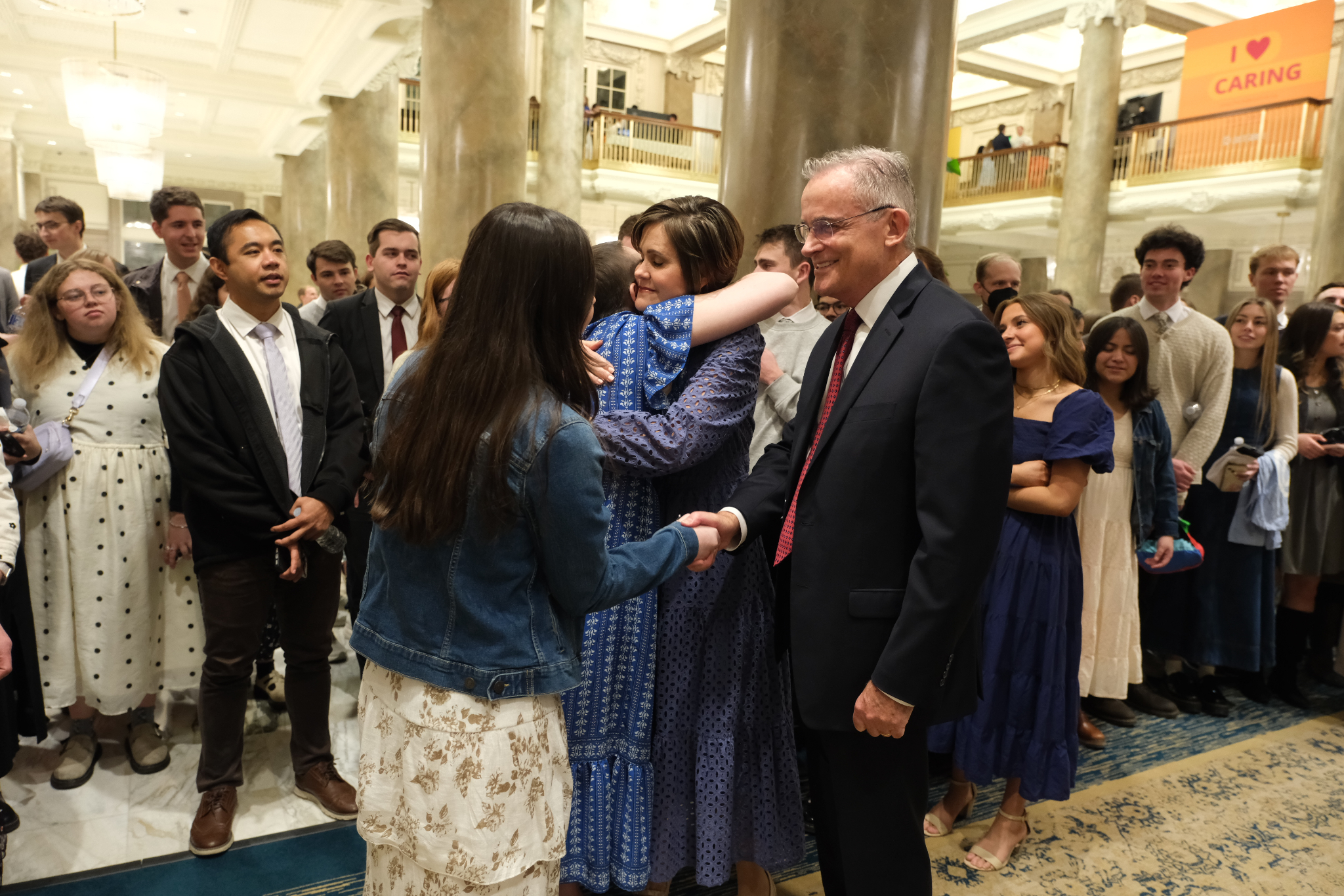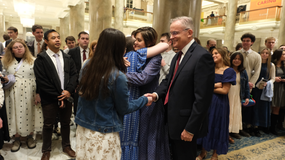 Elder Patrick Kearon of the Quorum of the Twelve Apostles of The Church of Jesus Christ of Latter-day Saints and his wife, Jennifer, greet young adults attending the Worldwide Devotional for Young Adults on Sunday, February 1, 2026, at the Conference Center in Salt Lake City.2026 by Intellectual Reserve, Inc. All rights reserved.