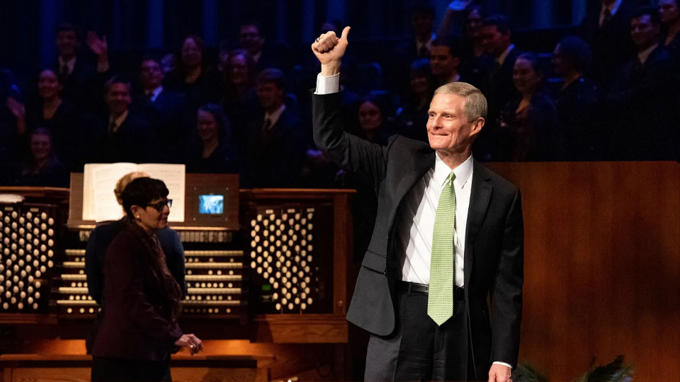 Elder David A. Bednar of the Quorum of the Twelve Apostles acknowledges the BYU–I center attendees with a thumbs-up gesture following the October 30, 2022, devotional in Rexburg, Idaho. Photo by Carrin Nelson, courtesy of BYU–Idaho.All rights reserved.