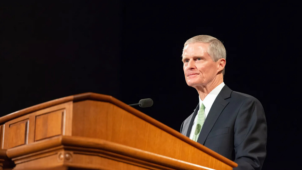 Elder David A. Bednar of the Quorum of the Twelve Apostles speaks at a devotional at the BYU–I Center on the Brigham Young Univeristy–Idaho campus in Rexburg on October 30, 2022. Photo by Natalia Lopez, courtesy of BYU–Idaho.All rights reserved.