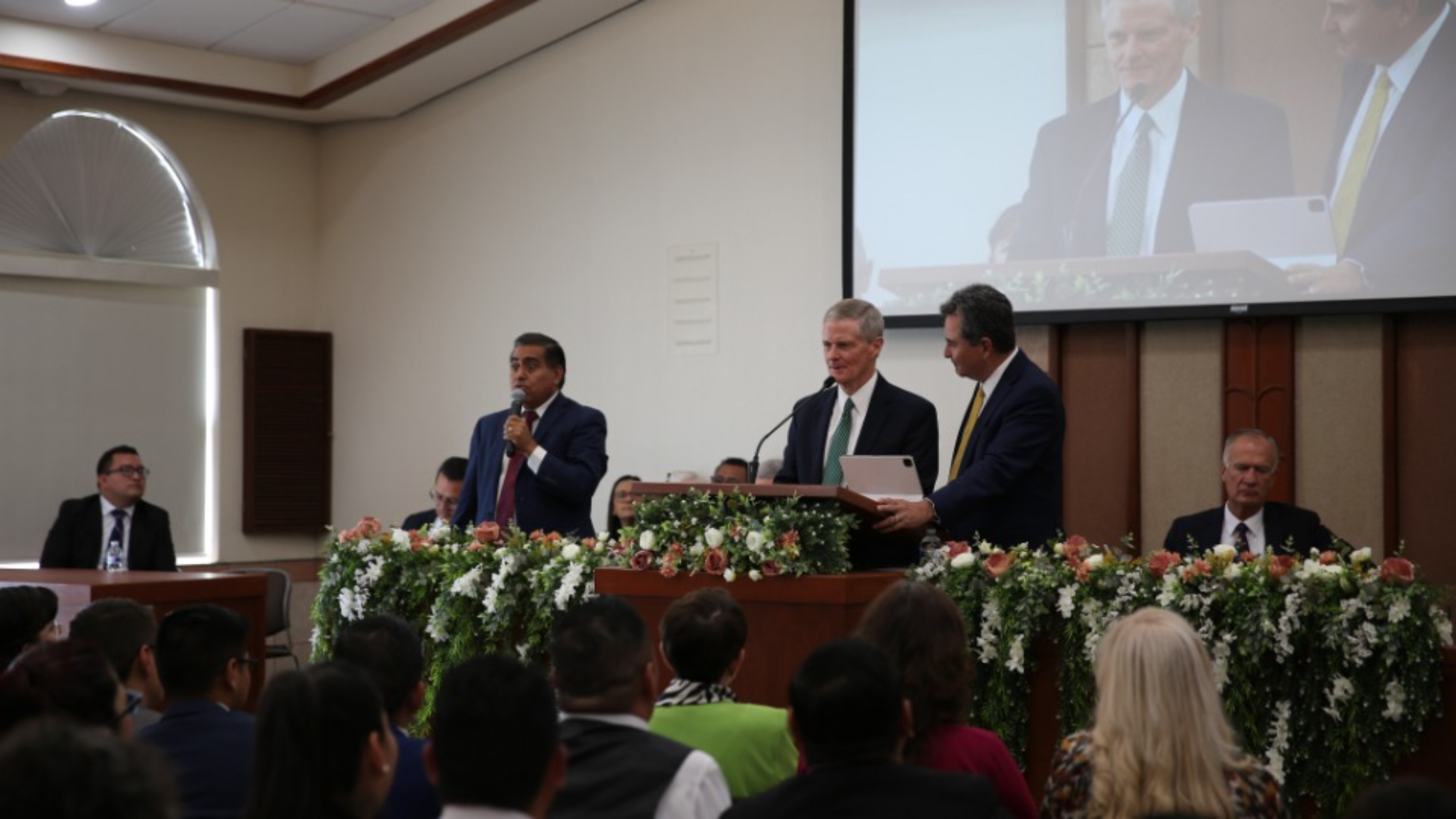 Before the start of the conference, Elder Bednar greeted Oscar Ibáñez, representative of Governor Maru Campos in the northern part of the state of Chihuahua, as well as the municipal president of Ciudad Juárez, Cruz Pérez Cuéllar, with whom he spoke about the Church’s humanitarian aid projects and how members of the Church can join initiatives that aim to improve their communities.
