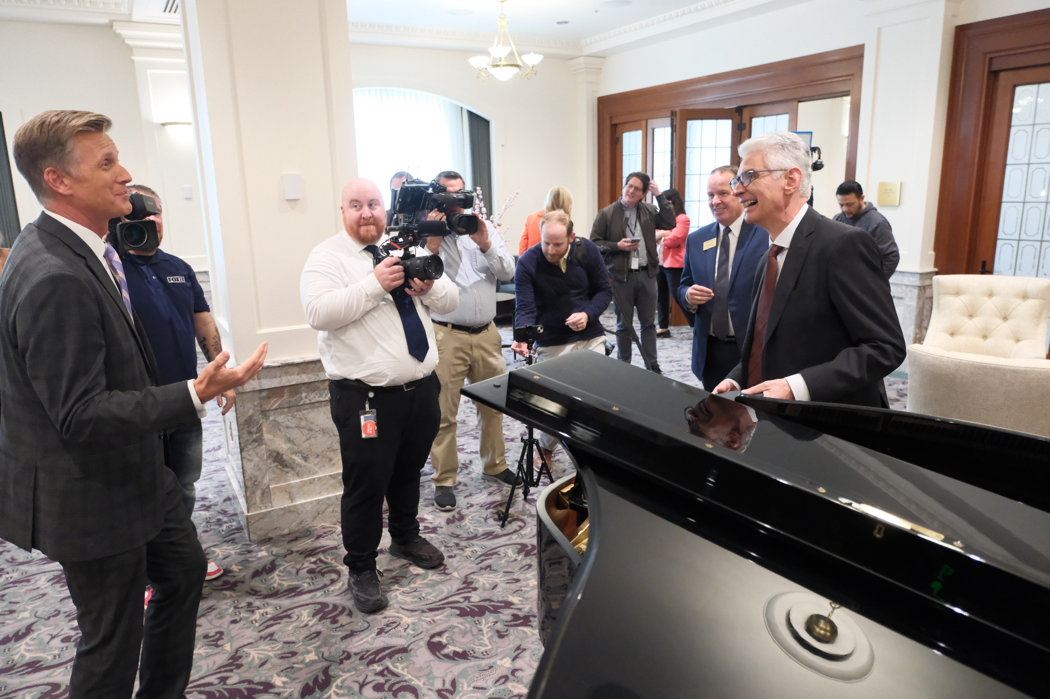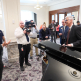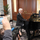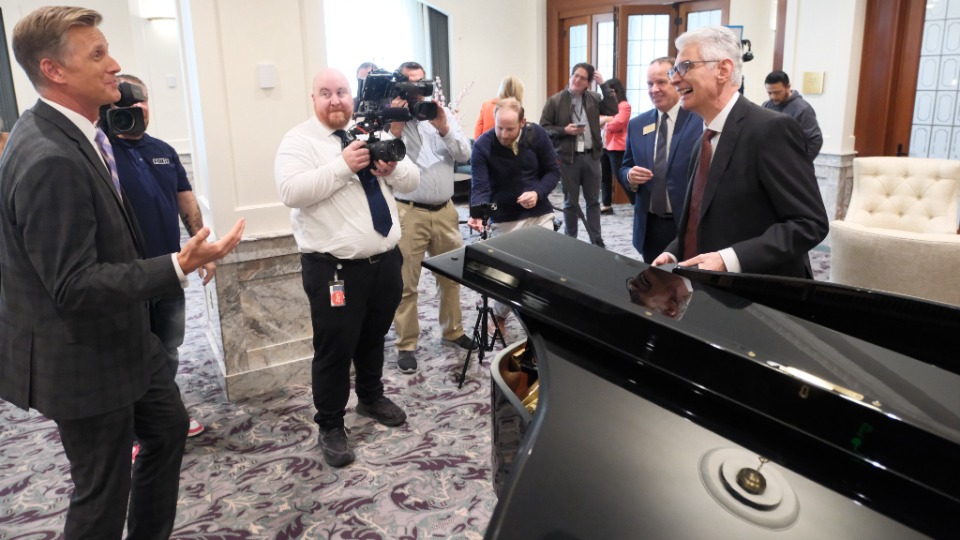 Elder Caussé took a few minutes Friday to play “Come, Come, Ye Saints” on the piano for news media.