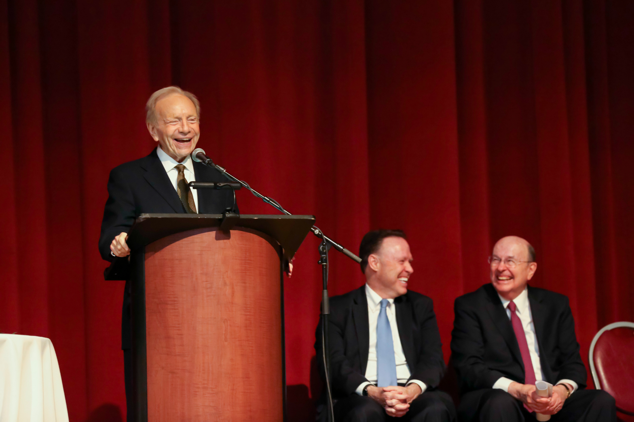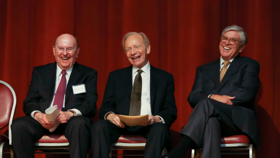 The bulk of Sen. Lieberman’s 28 minutes of remarks focused on the interplay of religion and public policy. He quoted a 2014 general conference talk by President Dallin H. Oaks, First Counselor in the Church’s First Presidency: “The Savior taught that contention is a tool of the devil. That surely teaches against some of the current language and practices of politics. … When our positions do not prevail, we should accept unfavorable results graciously and practice civility with our adversaries.” To which Sen. Lieberman responded, “Oh, how right you are Elder Oaks.” The senator also read the line from 2 Nephi 31:20 that teaches us to have “a love of God and of all men.”