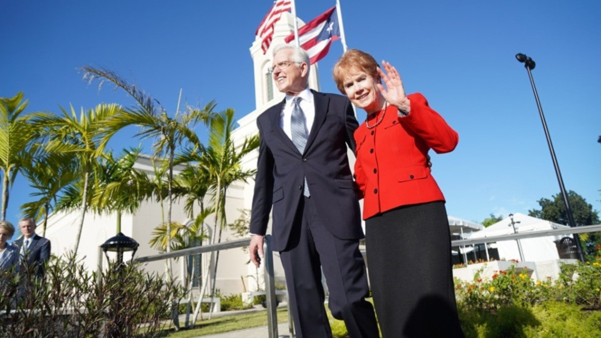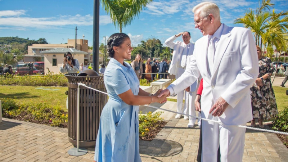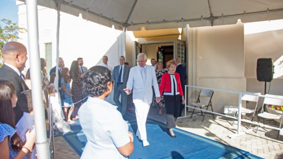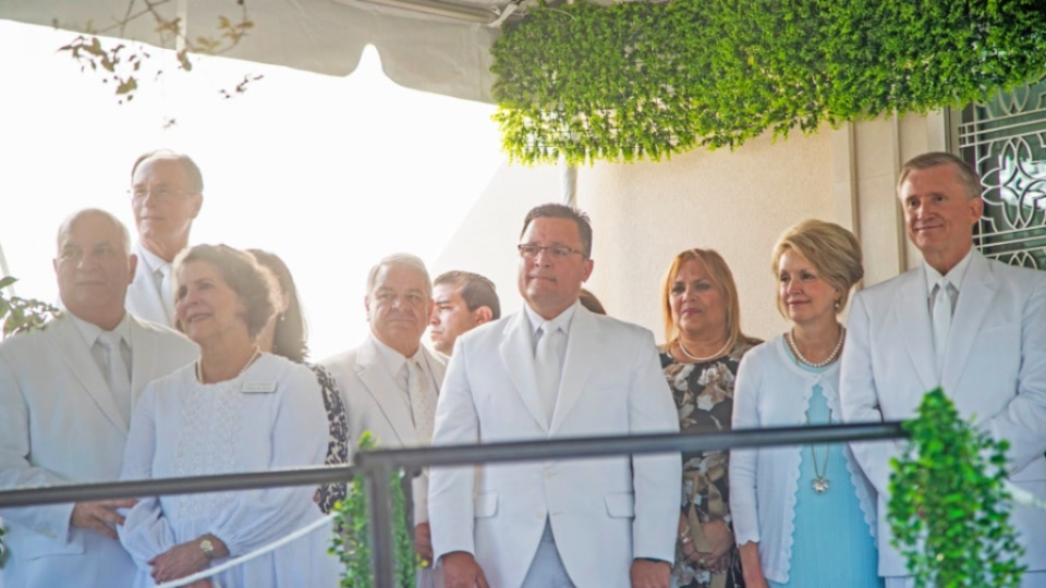 Accompanying Elder Christofferson were his wife, Katherine; Elder Benjamin De Hoyos and his wife, Evelia; Elder Kevin R. Duncan, executive director of the Temple Department, and his wife, Nancy; Elder Jorge M. Alvarado, First Counselor in the Caribbean Area Presidency, and his wife, Carilú; and Bishop W. Christopher Waddell of the Presiding Bishopric and his wife, Carol.