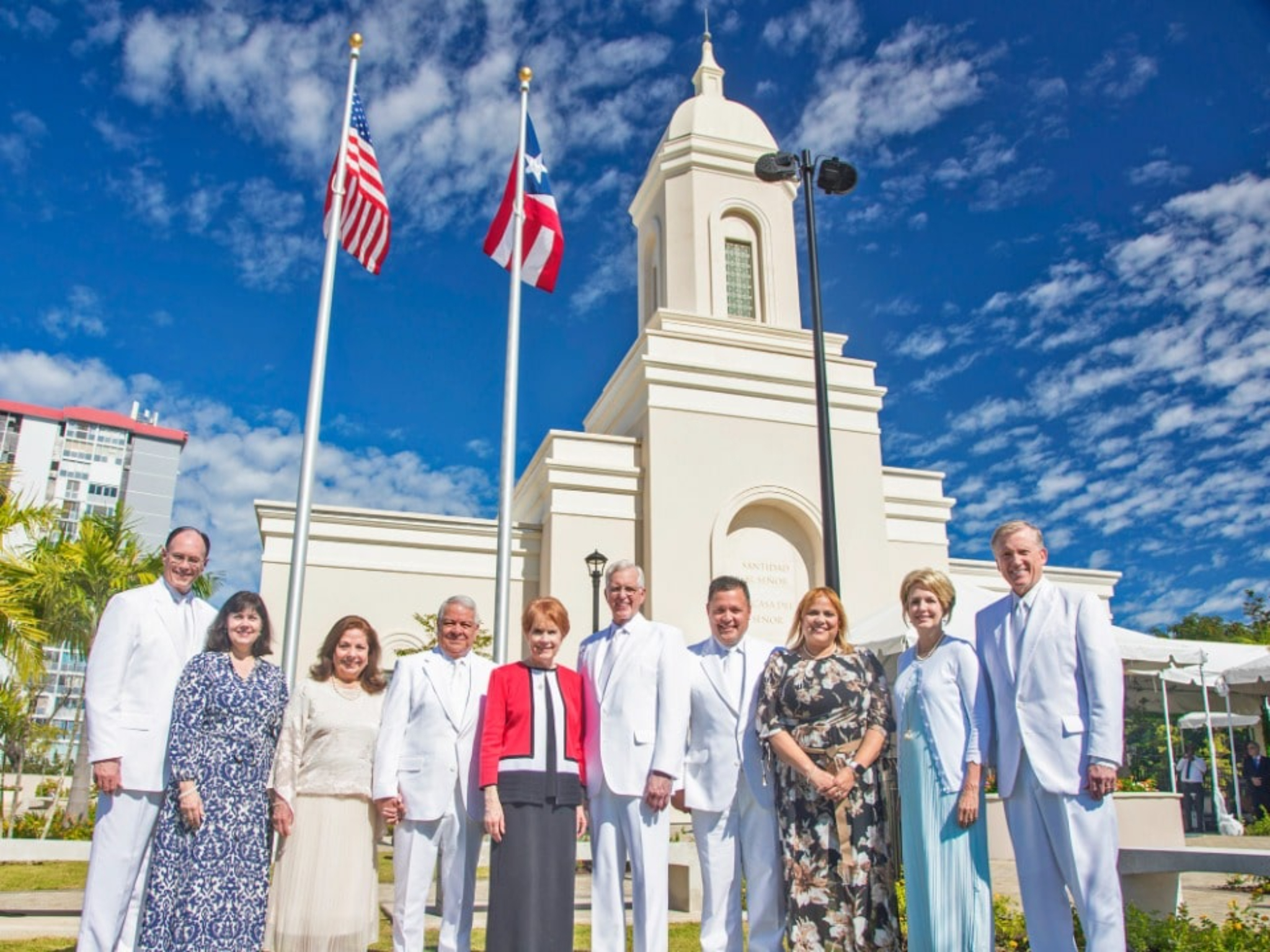 From right to left: Elder Kevin R. Duncan and wife, Nancy; Elder Jorge M. Alvarado and wife, Carilu; Elder D. Todd Christofferson and wife, Katherine; Elder Benjamin De Hoyos and wife, Evelia; and Elder Christopher Waddell and wife, Carol, at the dedication of the San Juan Puerto Rico Temple on January 15, 2023.2023 by Intellectual Reserve, Inc. All rights reserved.