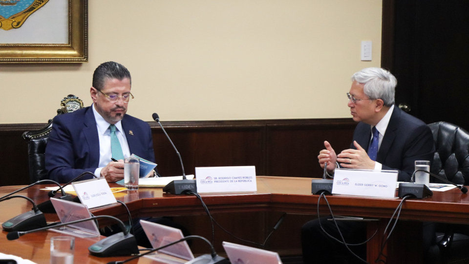 Elder Gerrit W. Gong of the Quorum of the Twelve Apostles was received by the President of the Republic of Costa Rica, Rodrigo Chaves Robles, on Friday, November 18, at the Presidential Palace of Costa Rica.