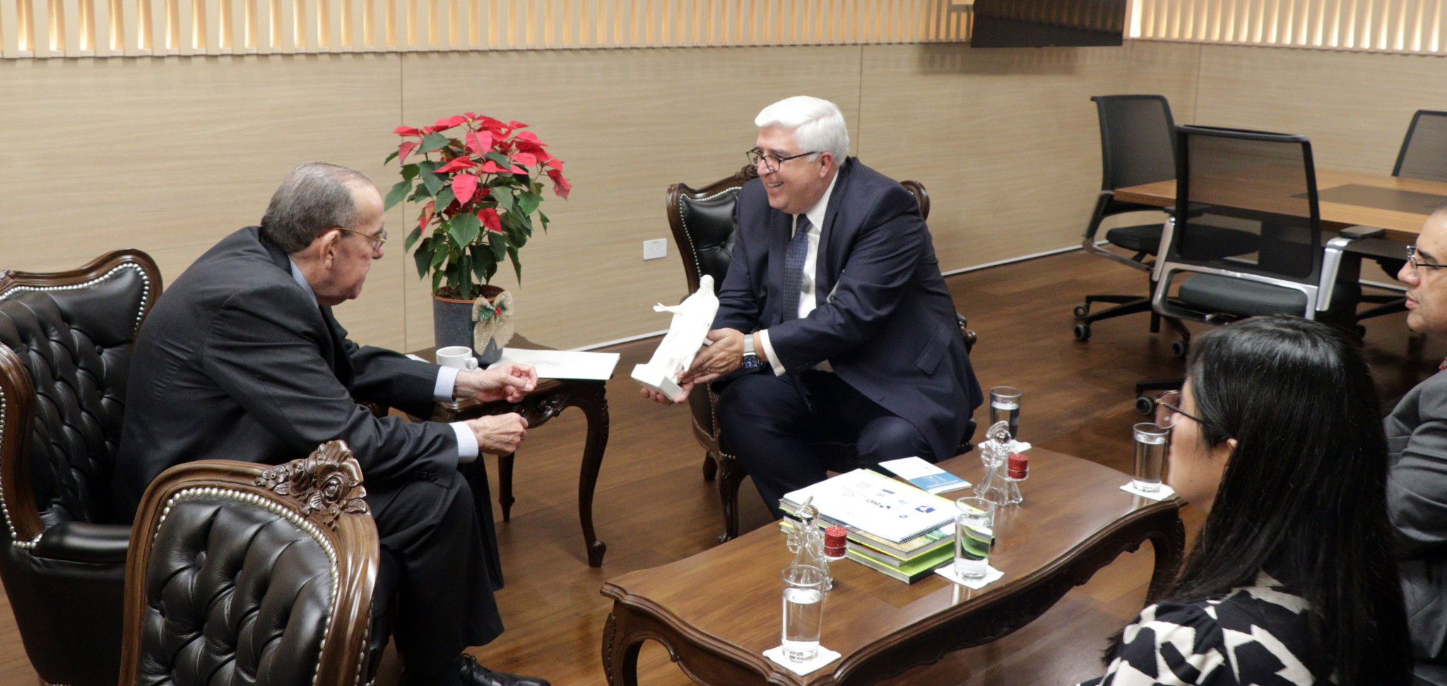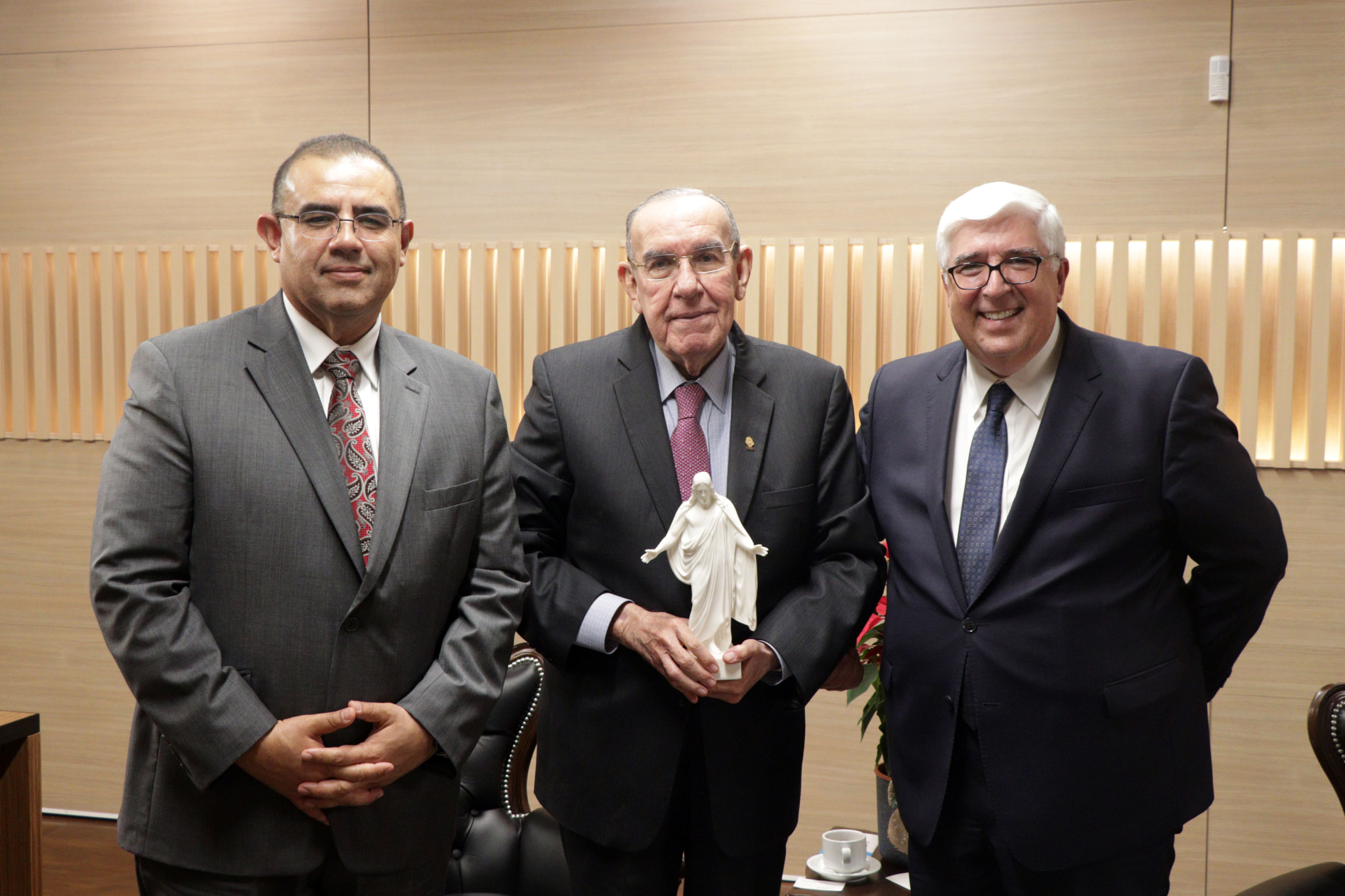 At the end of the meeting, Elder Gong presented President Chaves with a statuette of Thorvaldsen's Christus and a copy of The Book of Mormon, a book of scripture and witness of Jesus Christ that is sacred to Latter-day Saints.