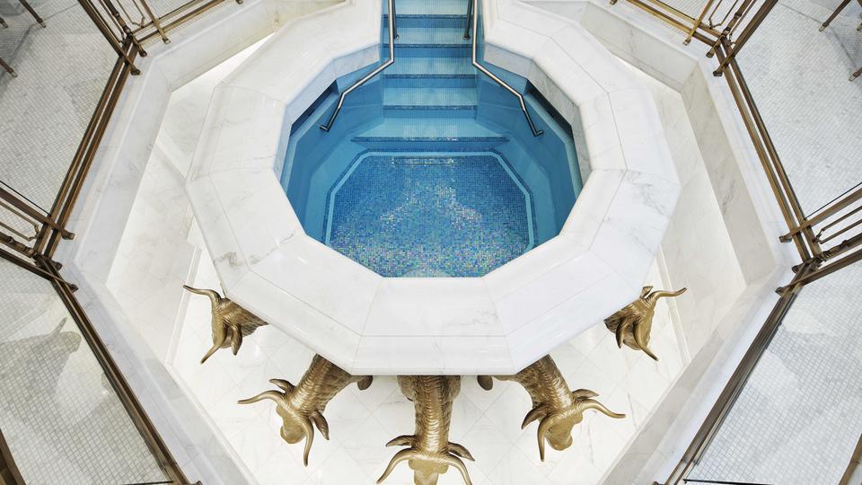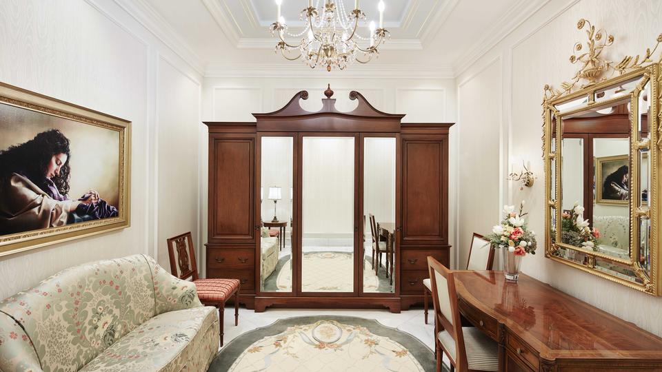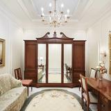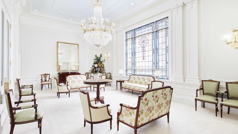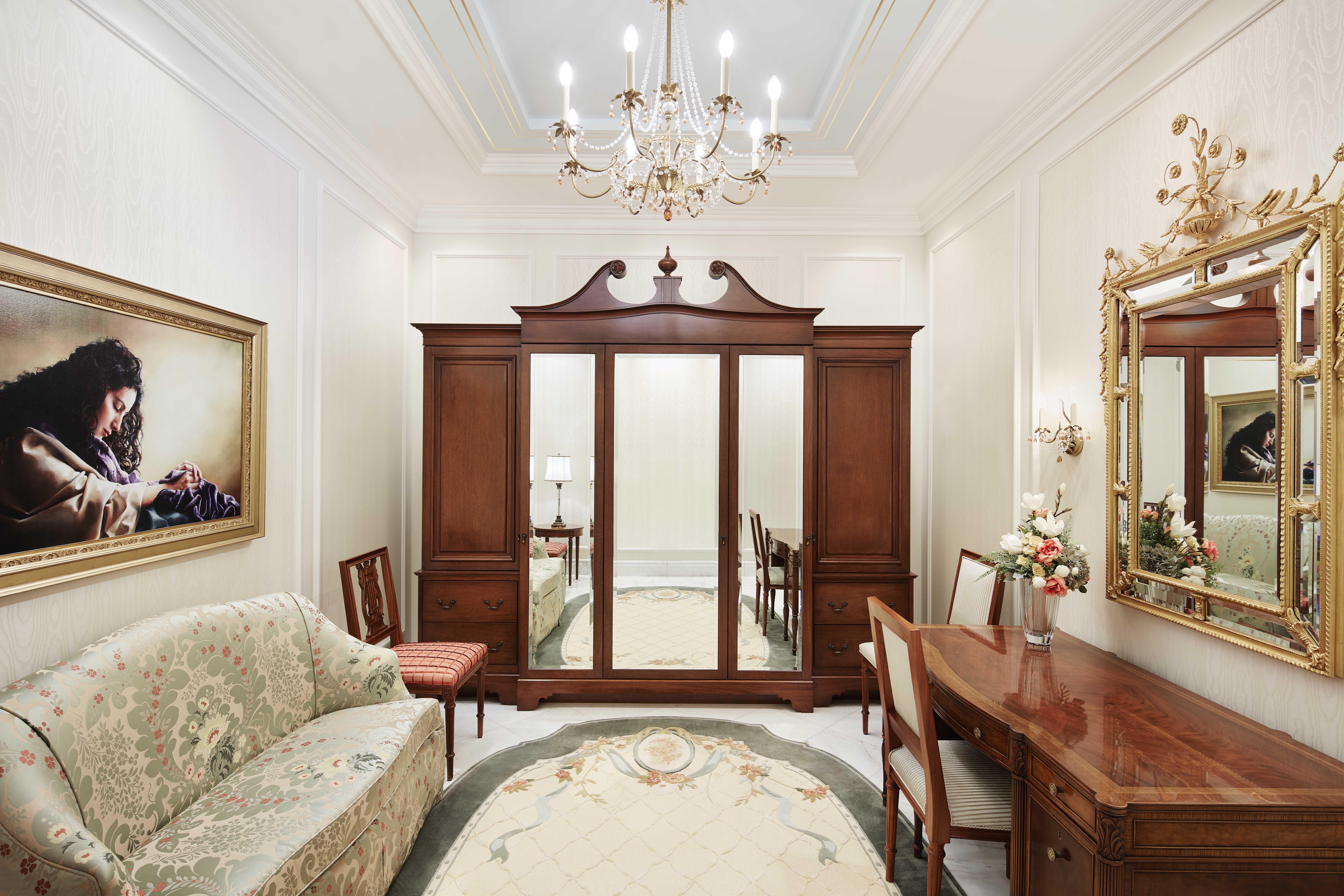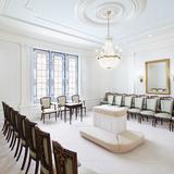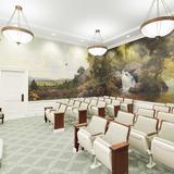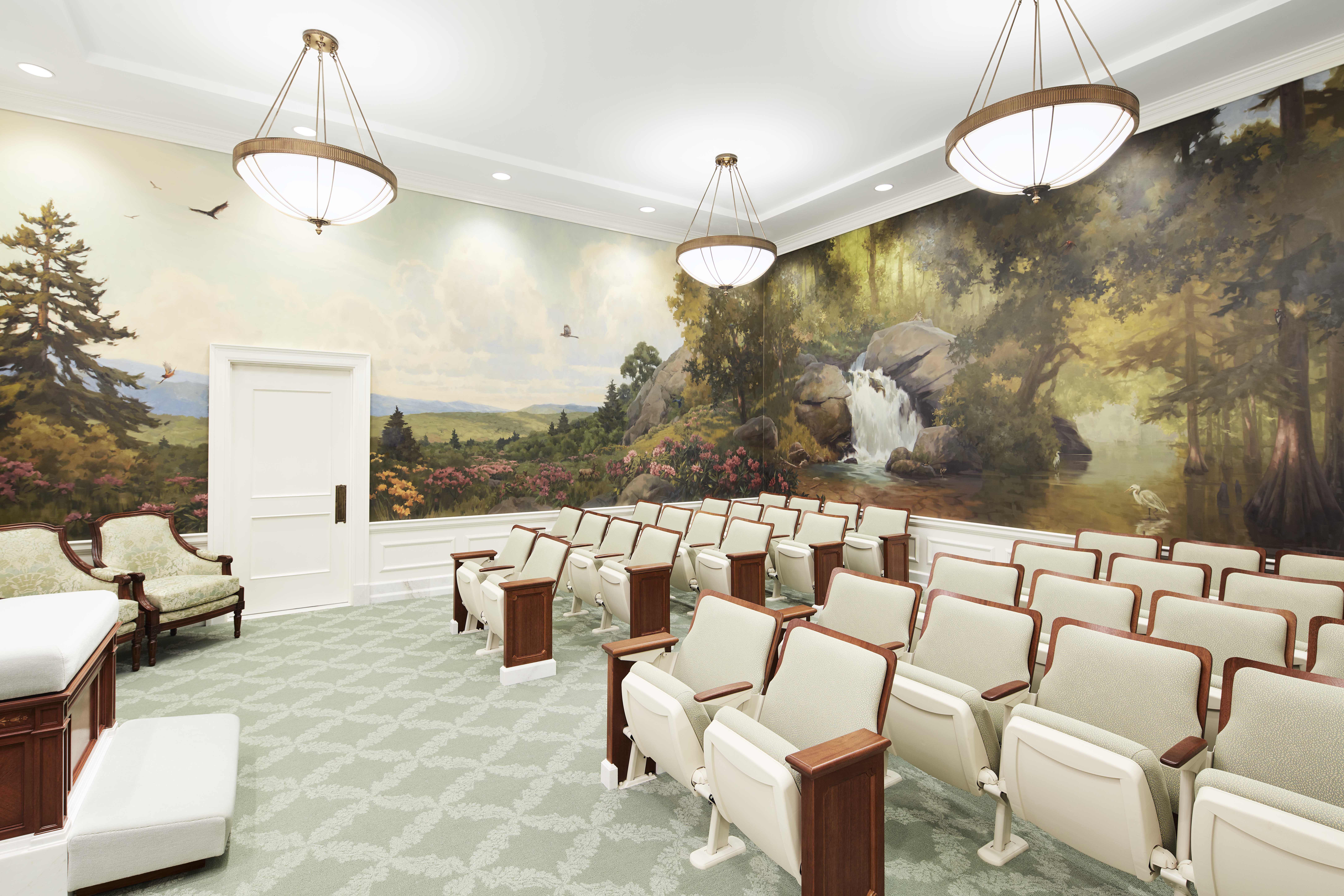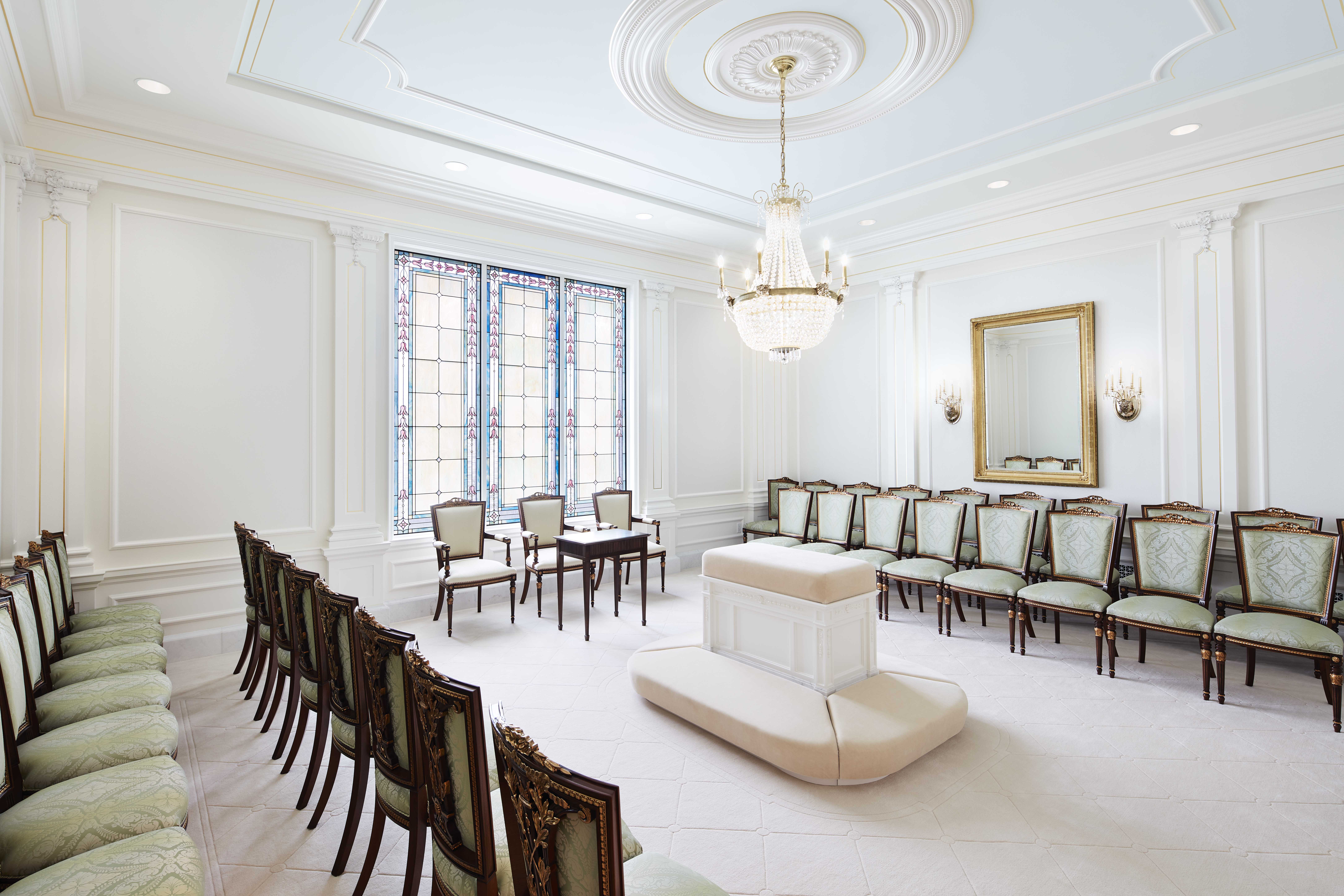 Antiqued bronze pendant lighting is featured throughout much of the temple. The neoclassic crystal and brass chandelier highlights the celestial and sealing rooms.