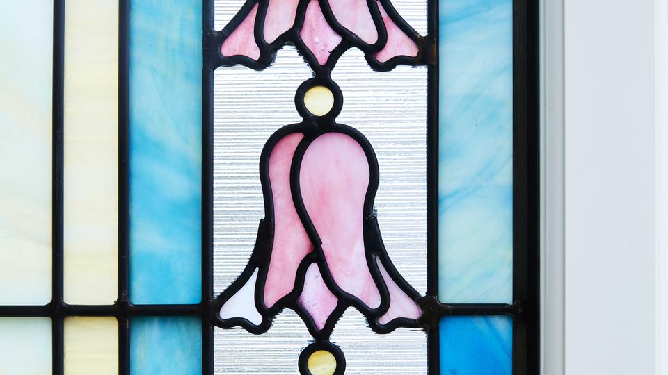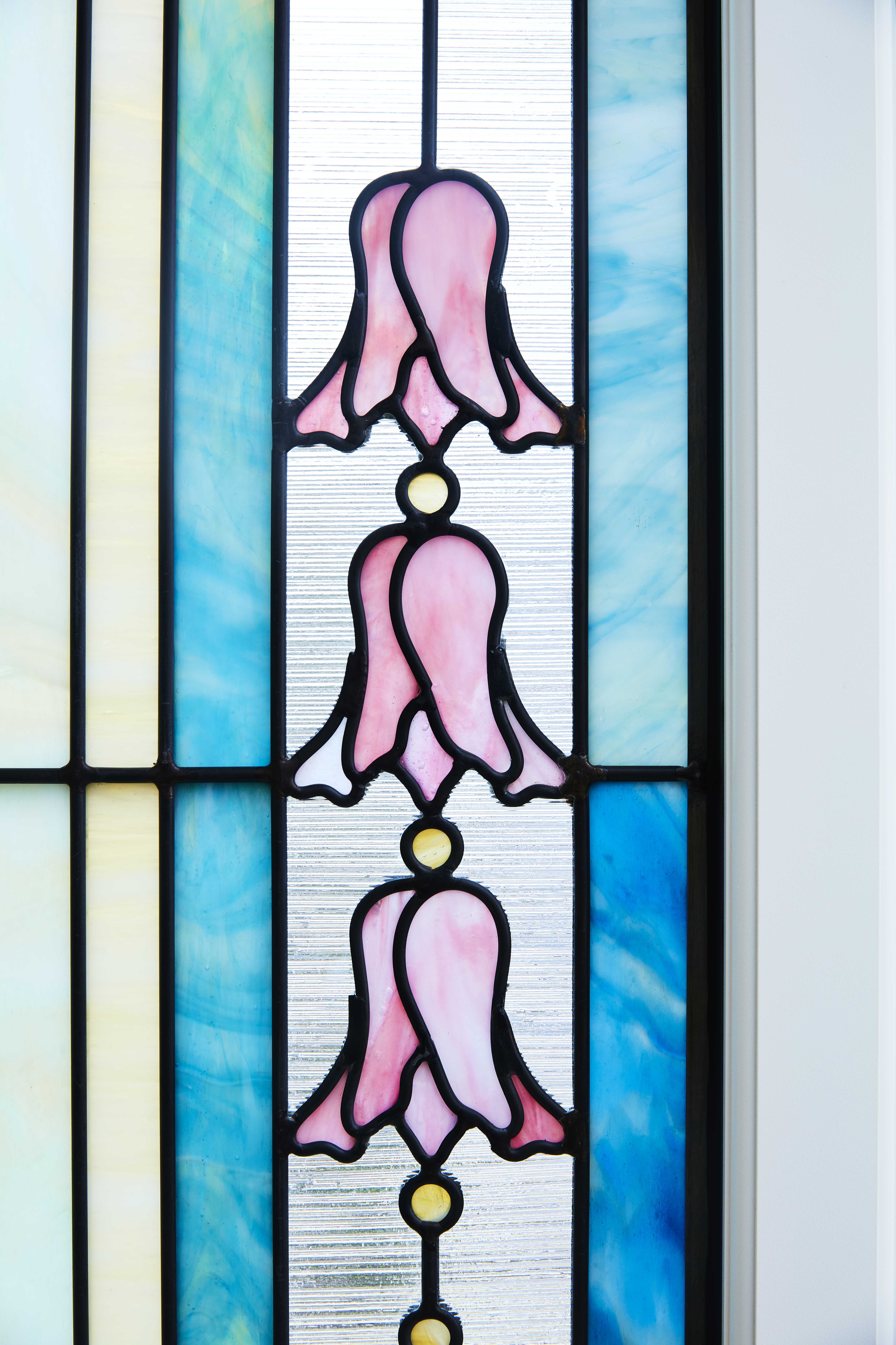 Gold leaf pinstriping is seen in the instruction, celestial and sealing rooms. Art glass throughout the temple incorporates the infinity bell flower and lazy eight motif and is created in blues, greens and corals.