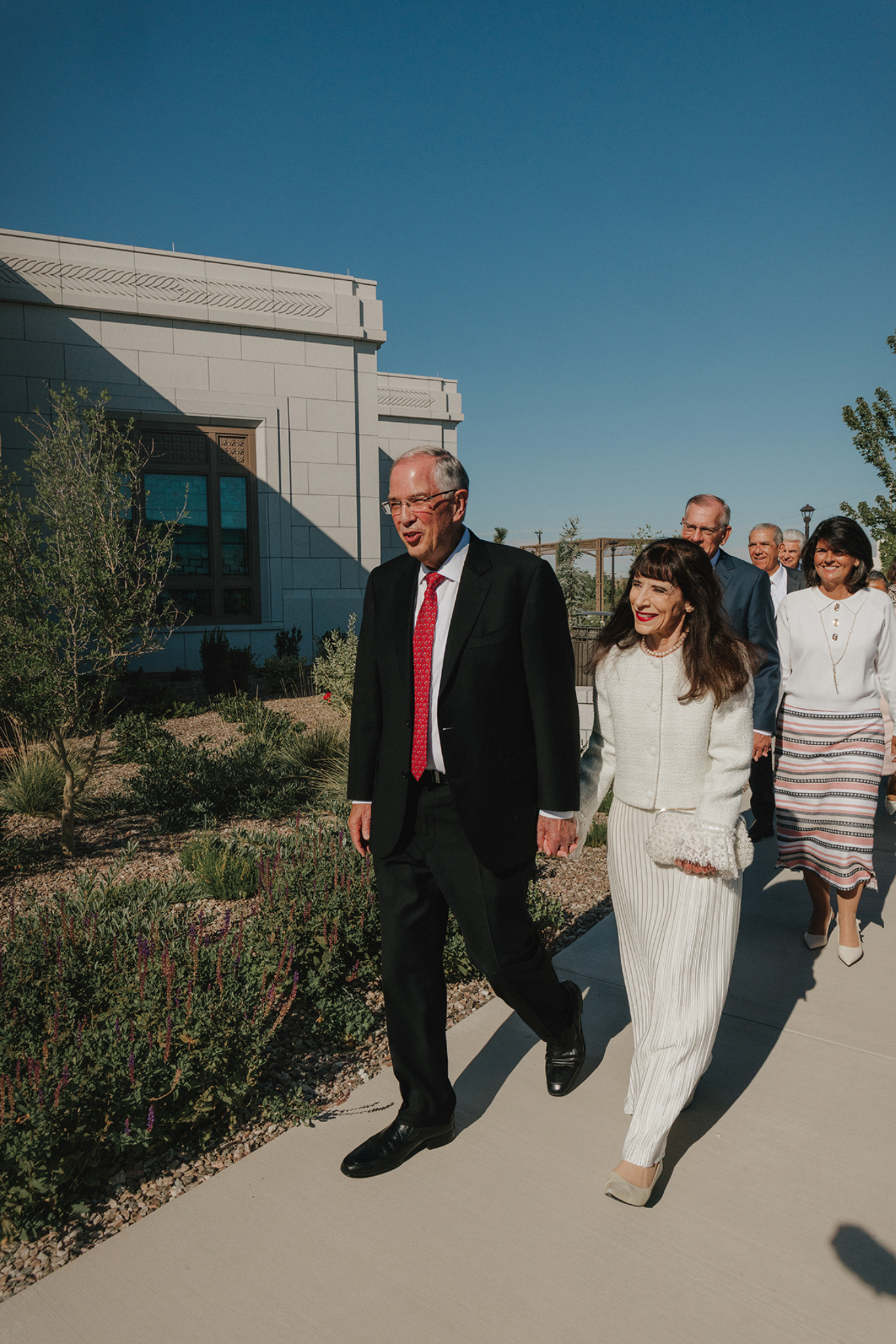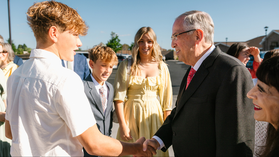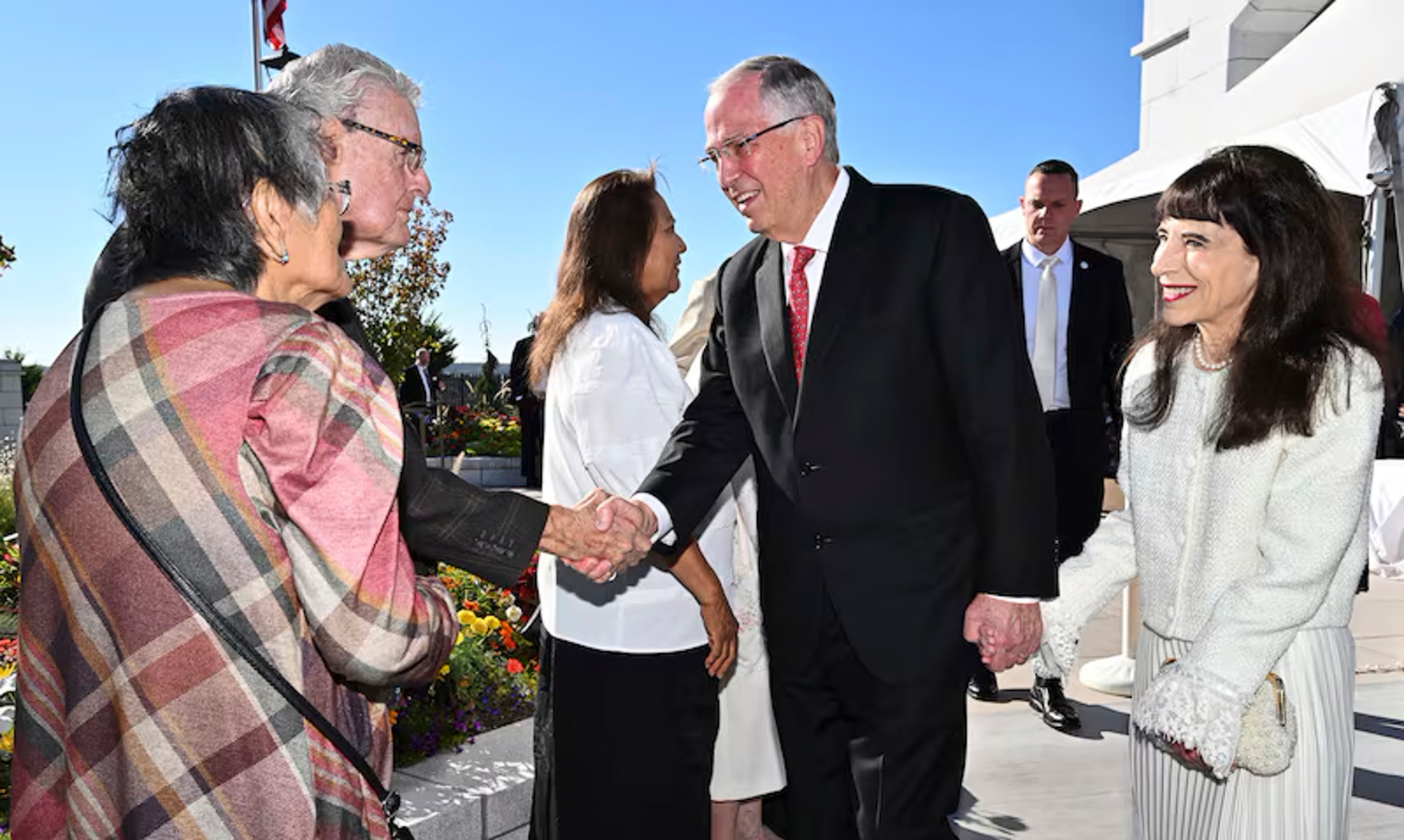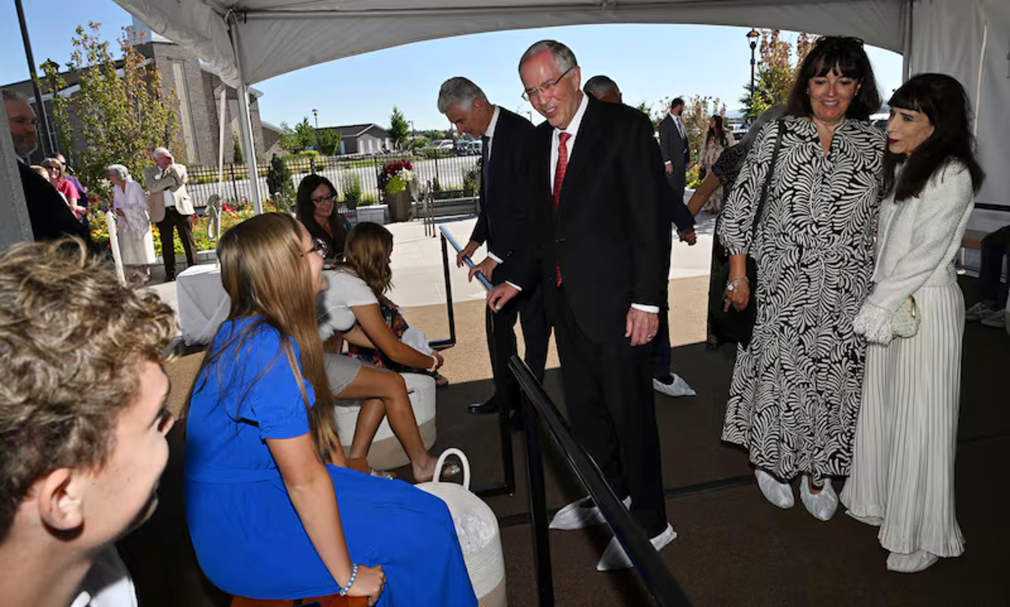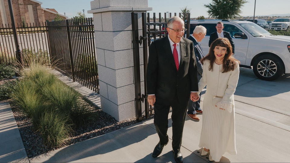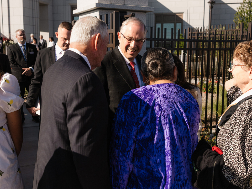 Elder Neil L. Andersen of the Quorum of the Twelve Apostles and his wife, Kathy, greet Latter-day Saints waiting in line for the dedication of the Farmington New Mexico Temple on Sunday, August 17, 2025.In his dedicatory prayer on the Farmington temple, Elder Andersen said: “Let this, Thy house, be a sanctuary of peace, a refuge from the distractions of the world. We pray that here in this holy temple the incomparable value of each individual, each son or daughter of God, will be counted greater than all the treasures of the world, allowing the goodness of each disciple to shine in splendor beyond any consideration of cultural identity, personal prosperity or worldly notoriety.”