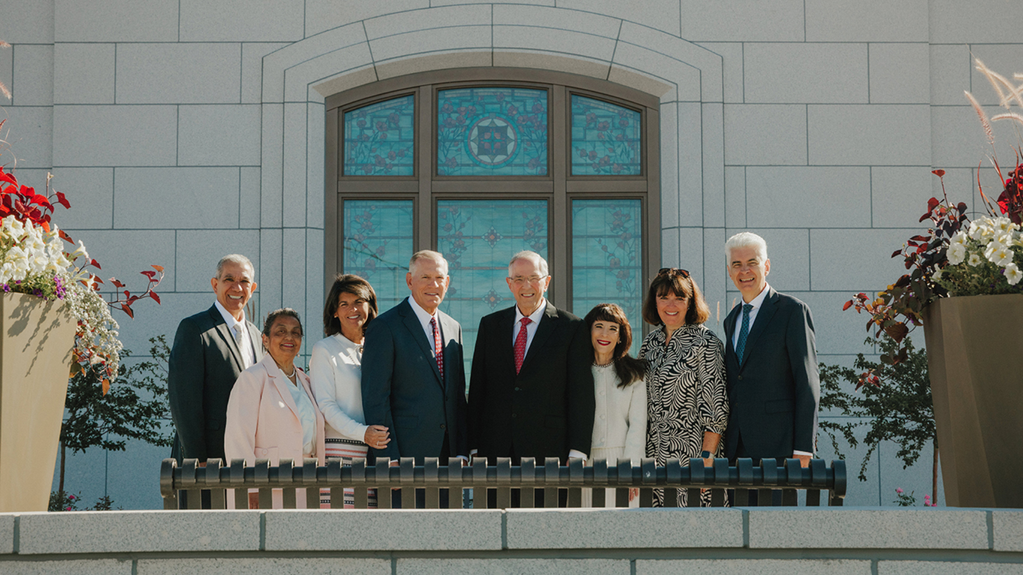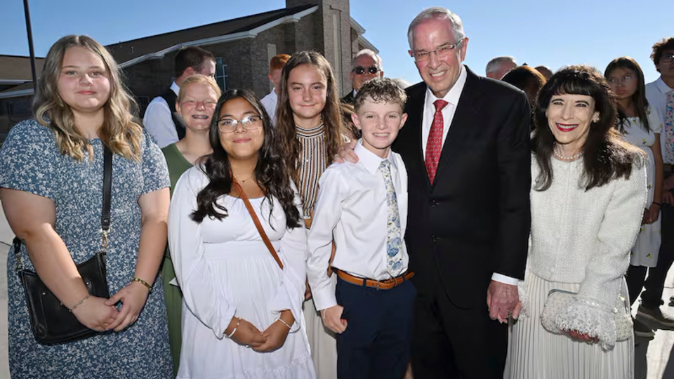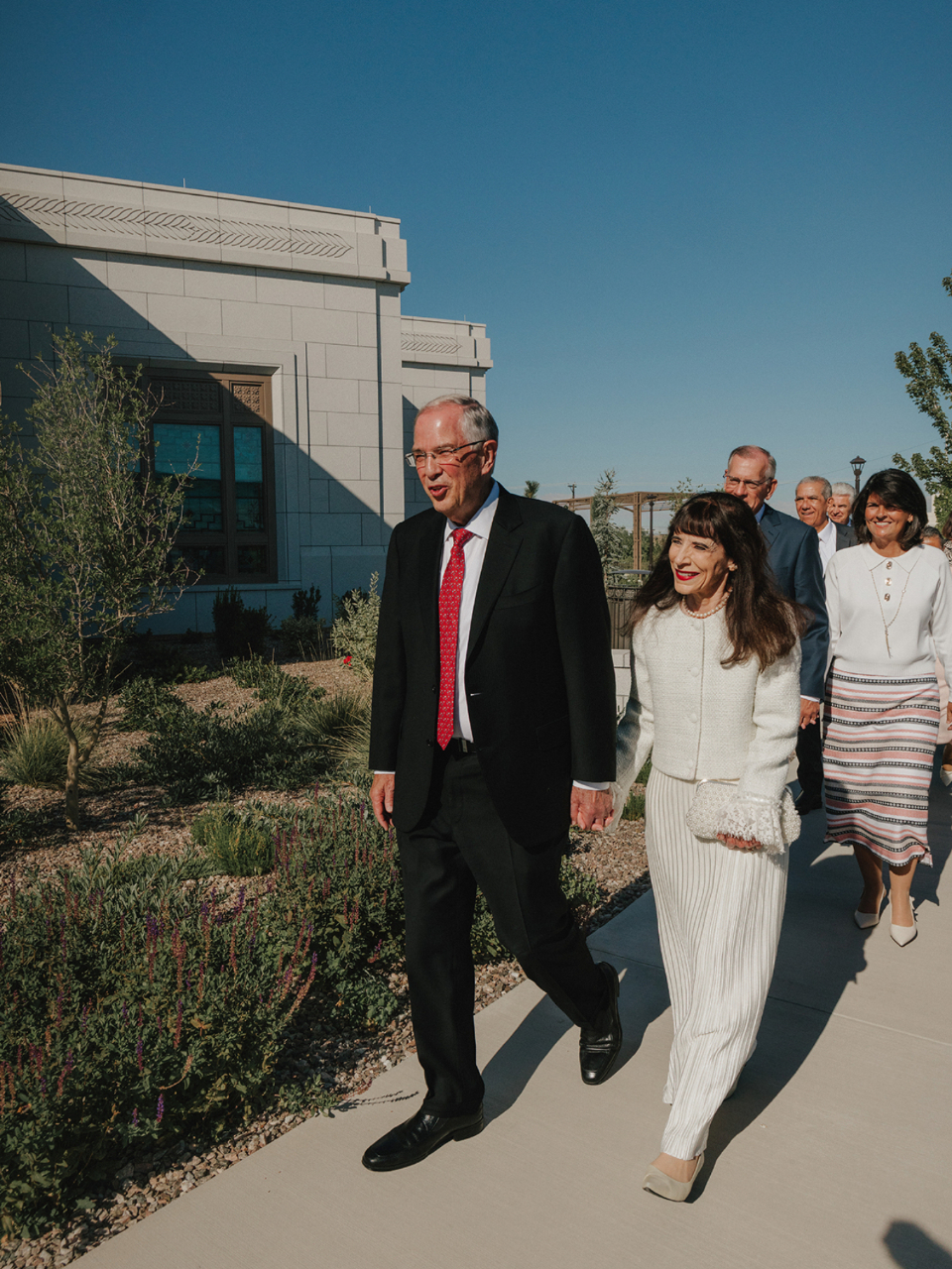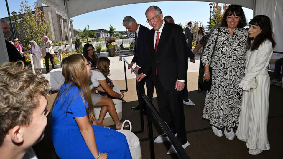From left: Elder José L. Alonso, a General Authority Seventy and President of the Church’s United States Southwest Area, and his wife, Rebeca; Elder Steven R. Bangerter, a General Authority Seventy and Executive Director of the Temple Department, and his wife, Susan; Elder Neil L. Andersen of the Quorum of the Twelve Apostles and his wife, Kathy; and Presiding Bishop Gérald Caussé and his wife, Valérie at the Farmington New Mexico Temple on Sunday, August 17, 2025.After arriving at the site, Elder Andersen shook hands with Latter-day Saints and expressed his love for them and his appreciation for their attendance.