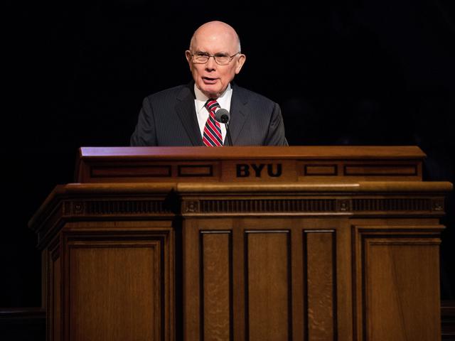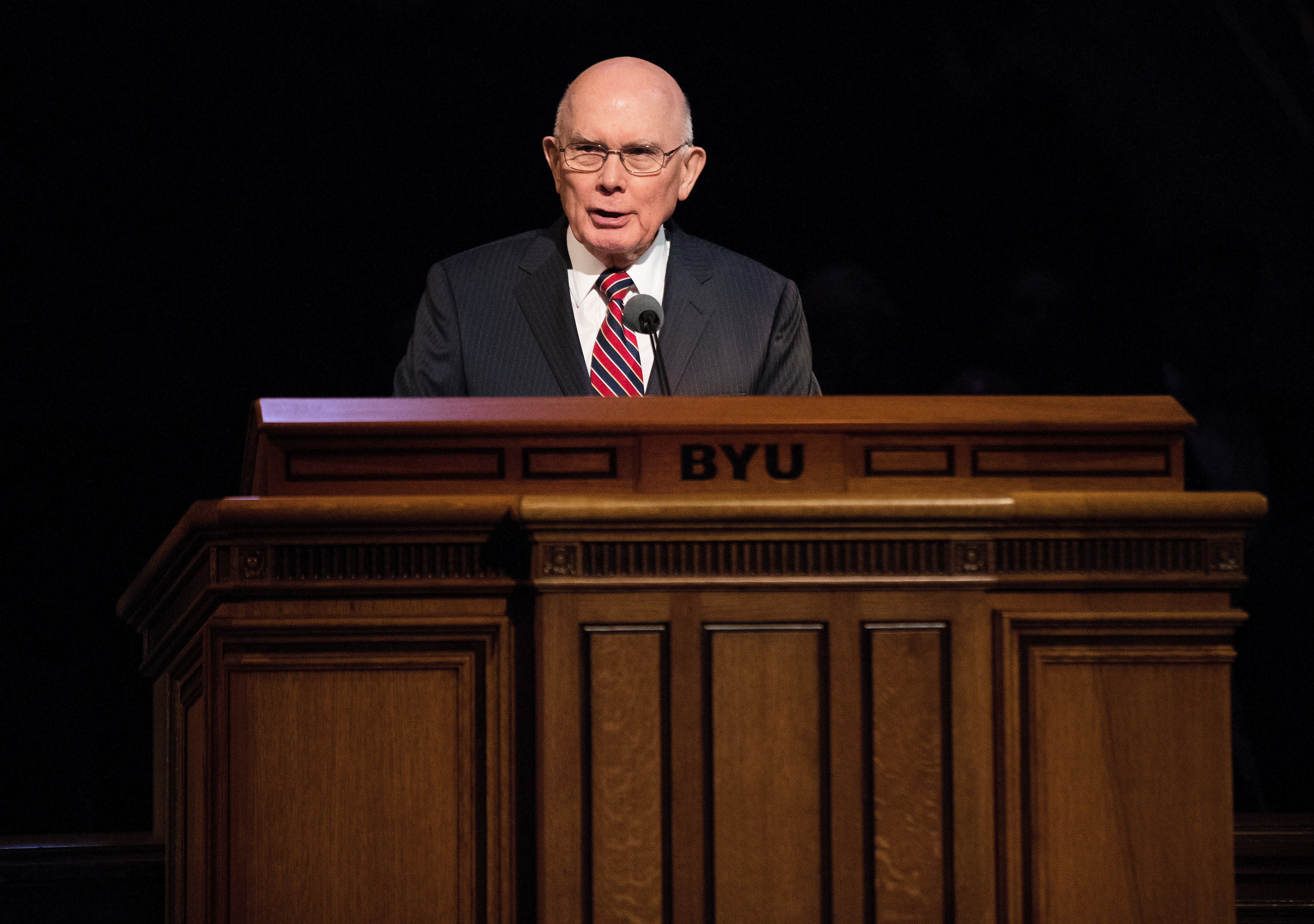“Today, I say that if the Church or its doctrines are attacked in blogs and other social media, contentious responses are not helpful. They disappoint our friends and provoke our adversaries,” said Elder Dallin H. Oaks of the Quorum of the Twelve Apostles of The Church of Jesus Christ of Latter-day Saints during an address to students at Brigham Young University. The Mormon apostle was the devotional speaker in the Marriott Center on the Provo, Utah, campus Tuesday, September 13, 2016.