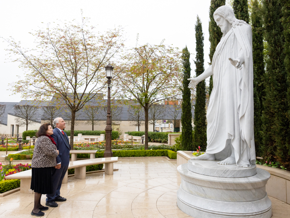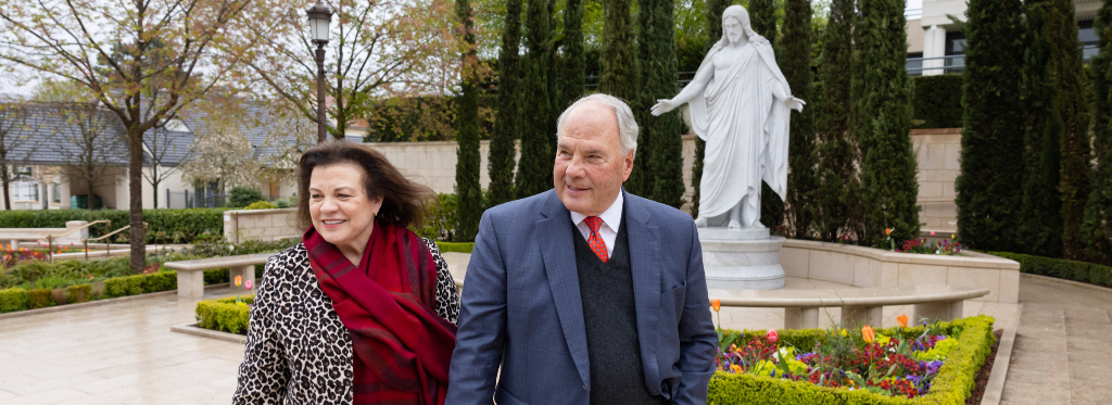 Elder Rasband and his wife, Melanie, were taking advantage of a break in the rainy skies to walk the grounds of the Paris France Temple on Friday, April 14, in Le Chesnay-Rocquencourt, France.