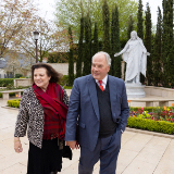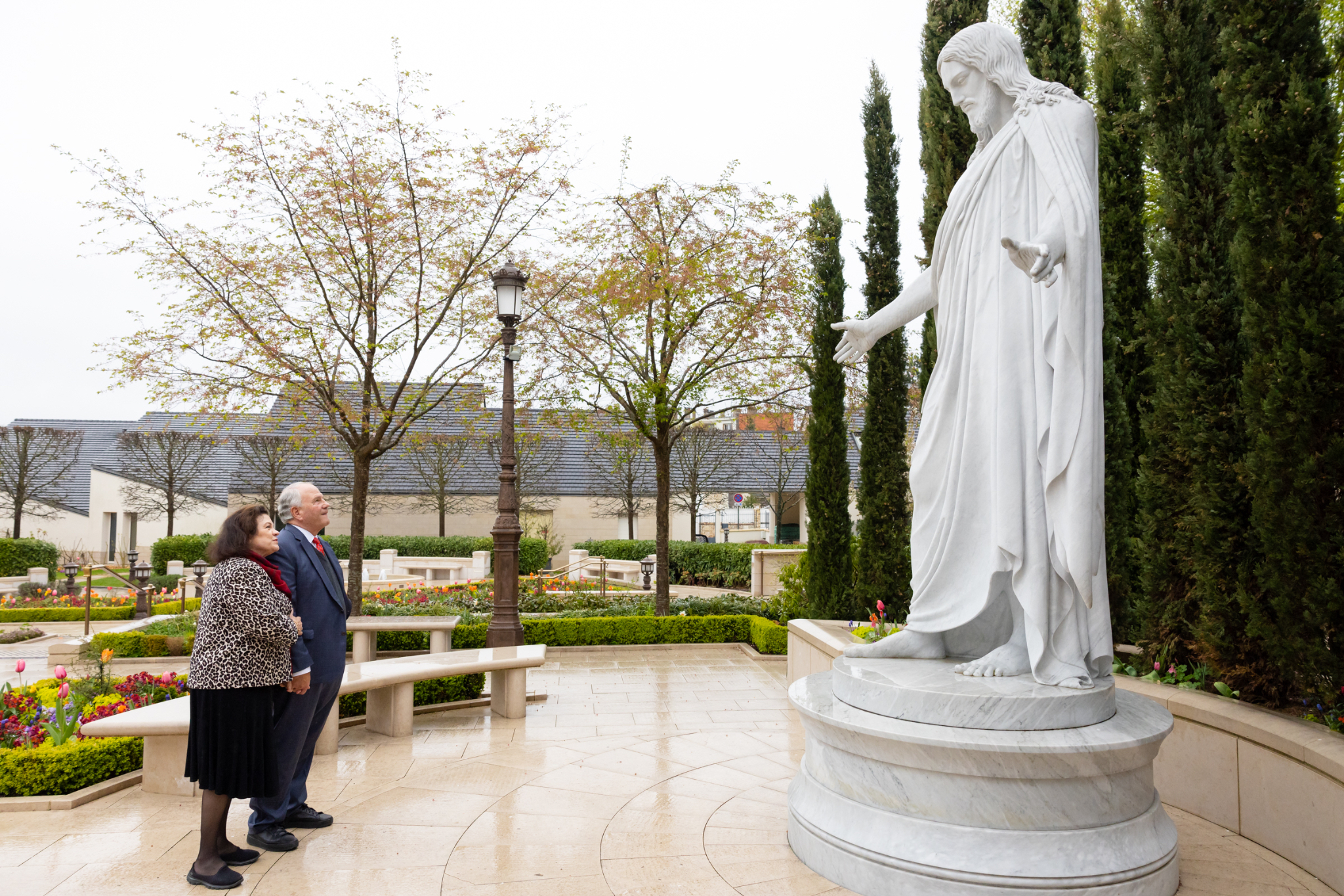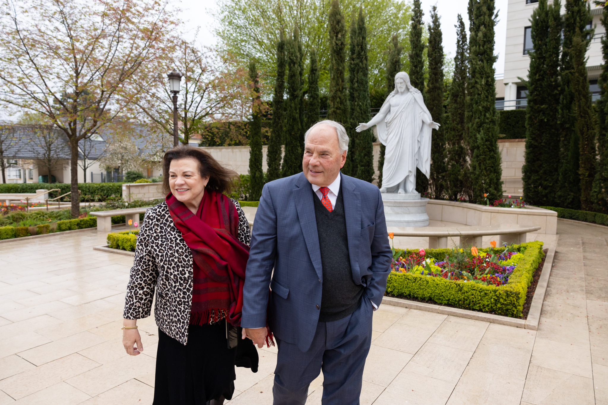 “Look at those colors,” Elder Rasband’s wife, Melanie, exclaimed as she pointed to a tapestry of tulips and spring flower beds welcoming visitors. Toward the center of the gardens, the Apostle and his wife stopped to ponder the purpose of their visit in front of the marble arms of a replica Christus statue.