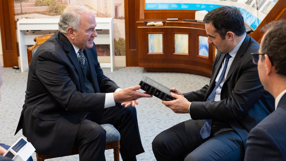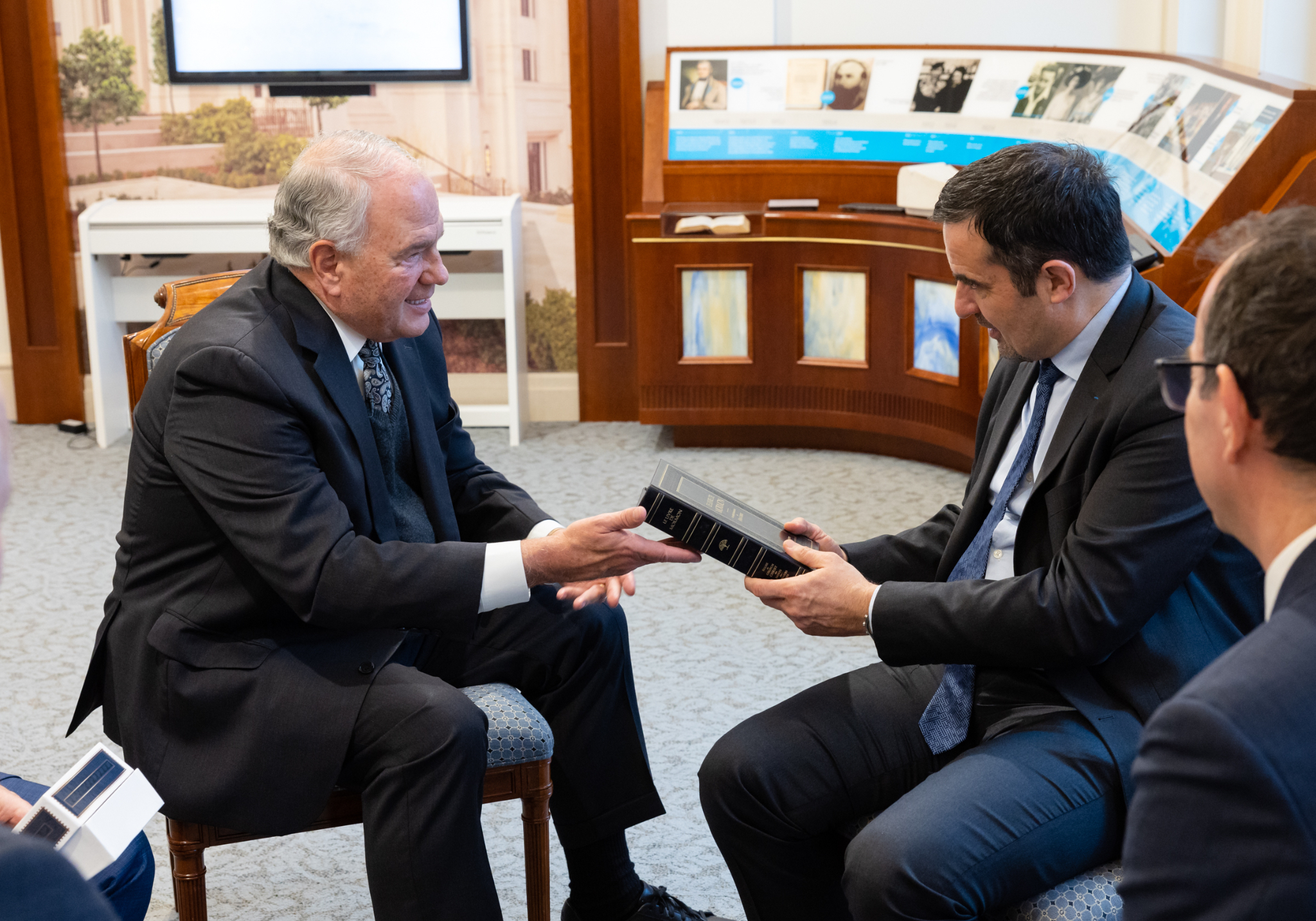 Elder Ronald A. Rasband of the Quorum of the Twelve Apostles shares a copy of the Book of Mormon with Richard Delepierre, mayor of Le Chesnay-Rocquencourt, on Saturday, April 15, 2023. Their meeting was held at the visitors’ center of the Paris France Temple.2023 by Intellectual Reserve, Inc. All rights reserved.“I think now is also the time to symbolically reopen the [temple’s] doors to explain the Church’s teachings, which helps avoid misunderstandings that are unfortunately common in today’s world,” Delepierre said.