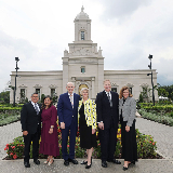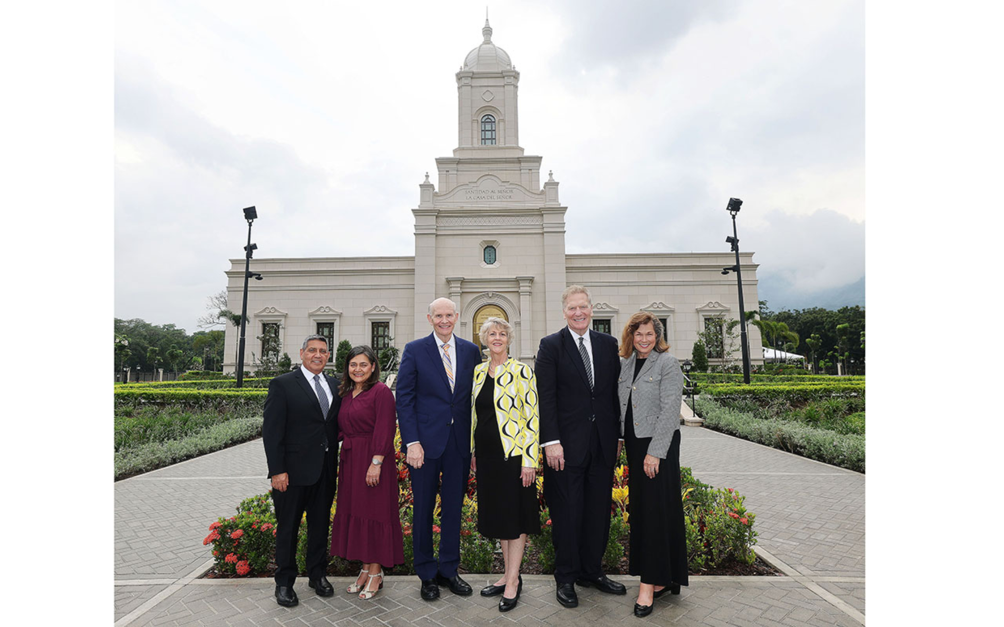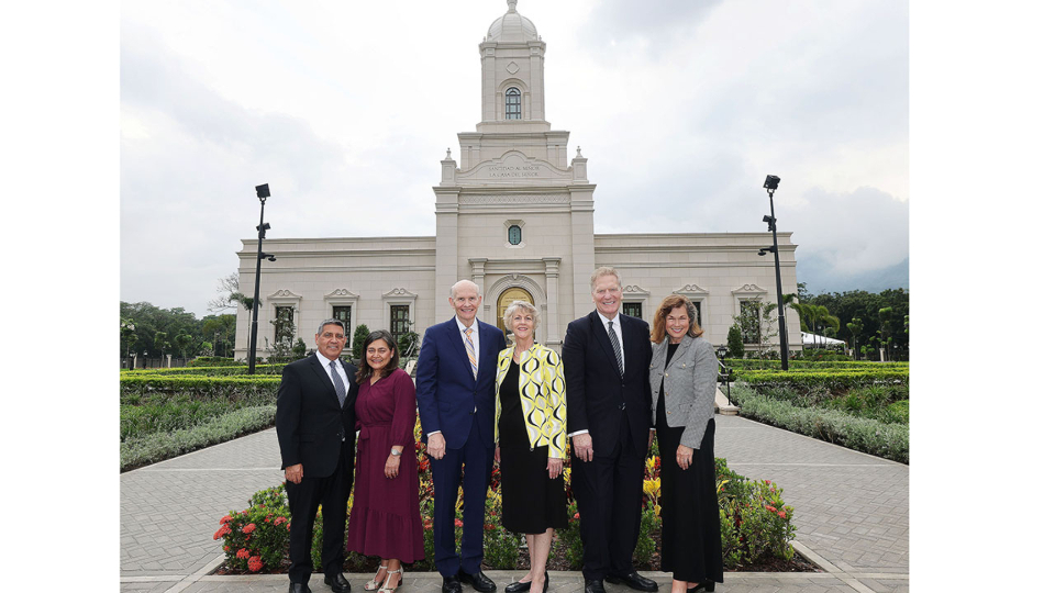 From left are Elder Patricio M. Giuffra, a General Authority Seventy and First Counselor in the Central America Area Presidency, and his wife, Maria; Elder Dale G. Renlund and his wife, Ruth; and Elder Craig C. Christensen, a General Authority Seventy and assistant executive director of the Church’s Temple Department, and his wife, Debbie, at the dedication of the San Pedro Sula Honduras Temple on Sunday, October 13, 2024.Both dedicatory sessions were conducted in Spanish, and speakers delivered messages in Spanish and English with translations offered. Elder Renlund delivered his talks and the dedicatory prayer in Spanish. The sessions were broadcast to meetinghouses in the temple district.