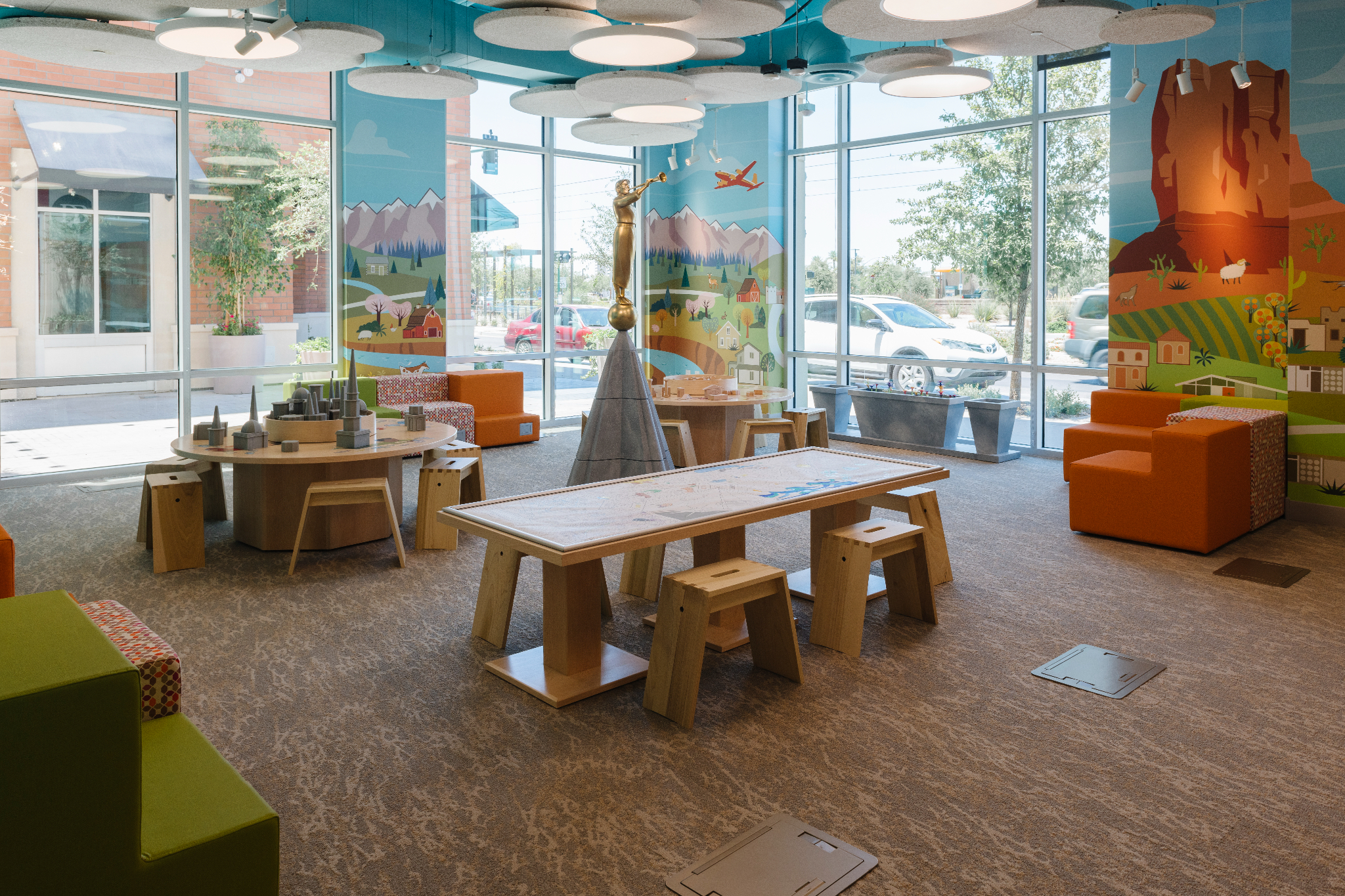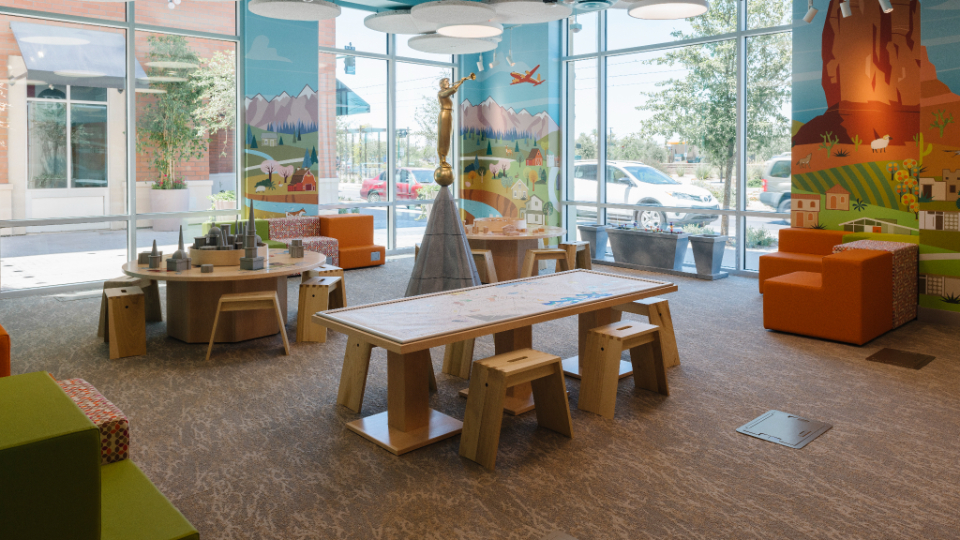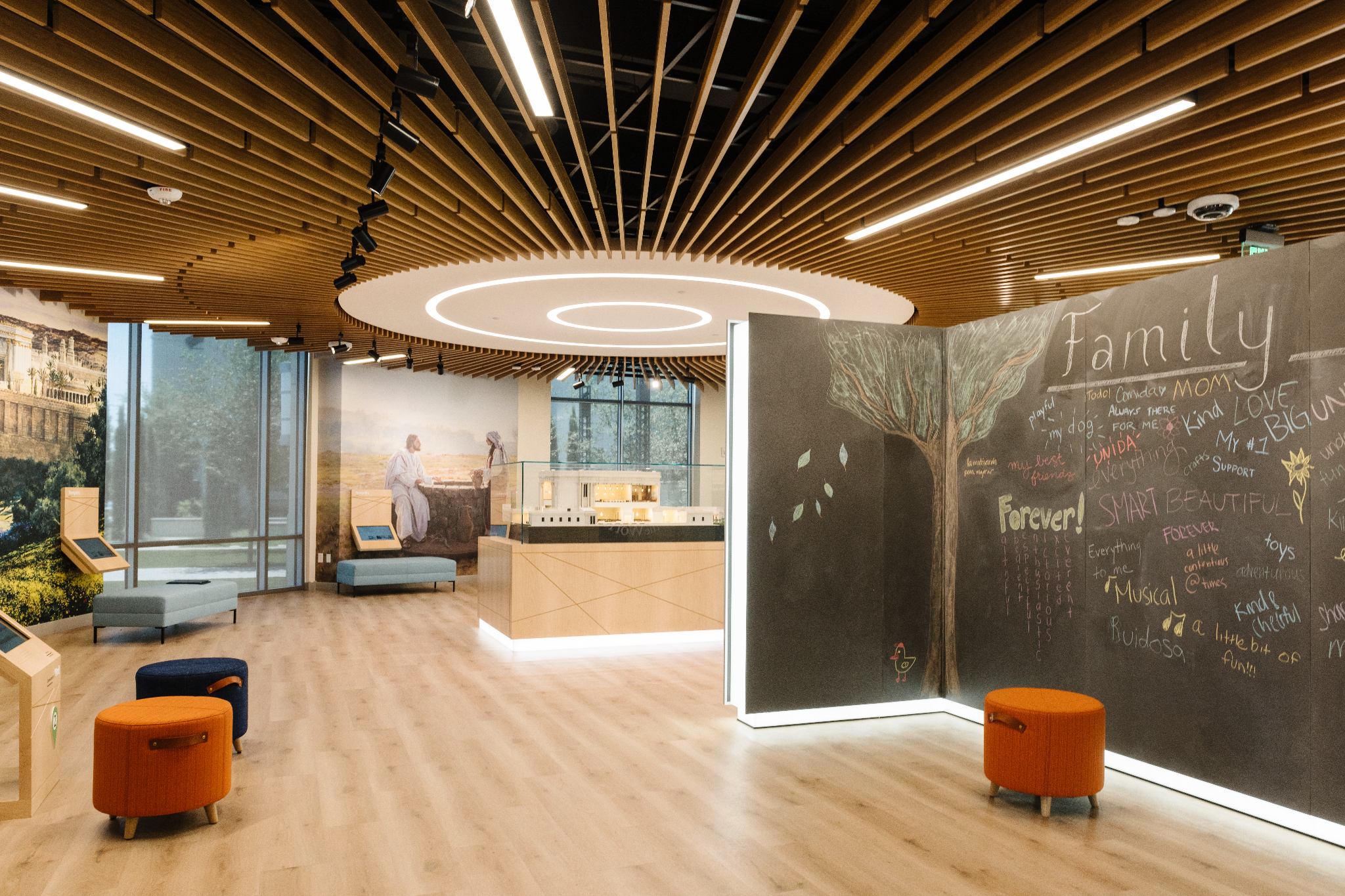 “We spent time with young adults in Mesa to learn how to create a space that works for them,” explained Tanner Kay, the product manager and experience creator for the visitors’ center. “That’s why you see a variety of comfortable spaces here, like a kitchen to share food with friends, and individual quiet pods where you can have a private moment to meditate."