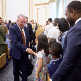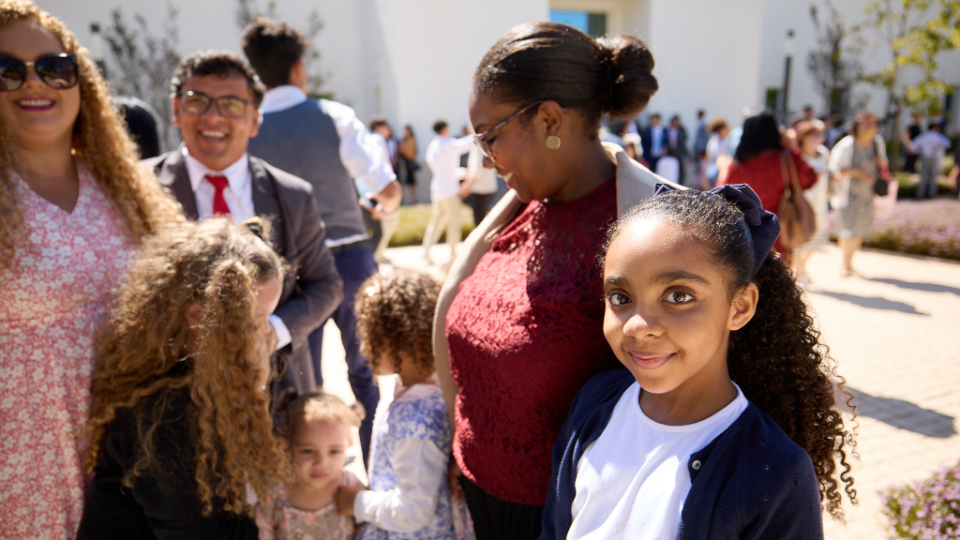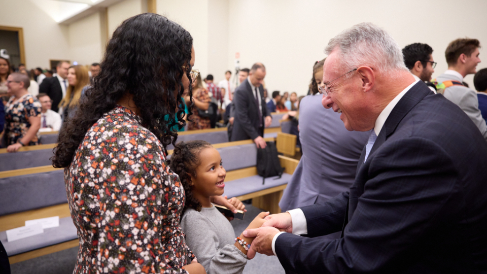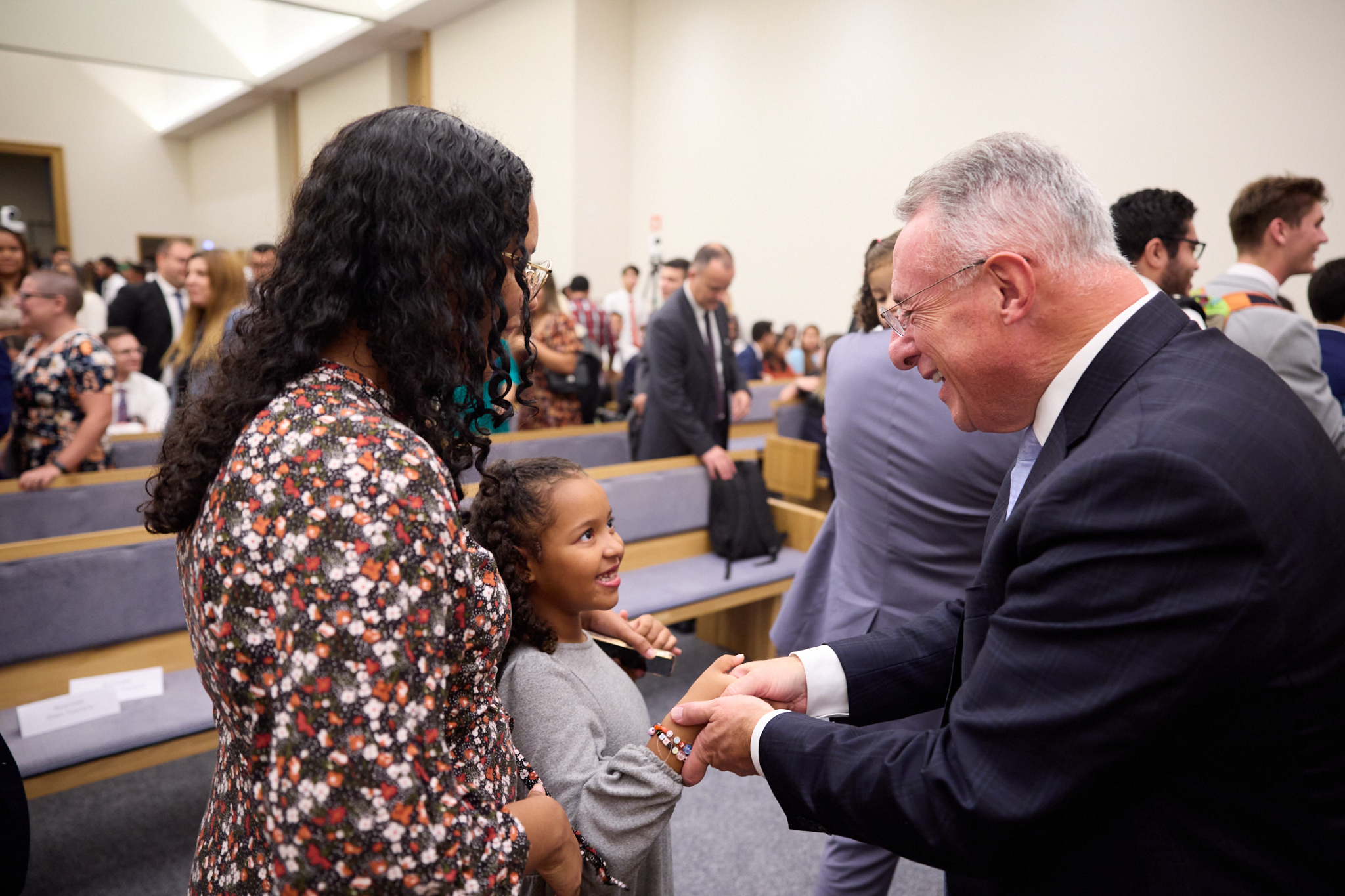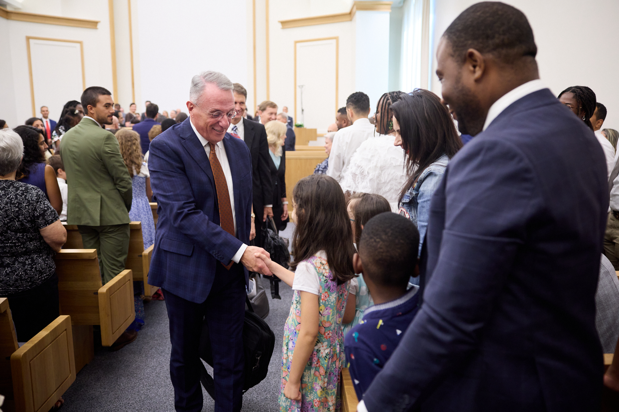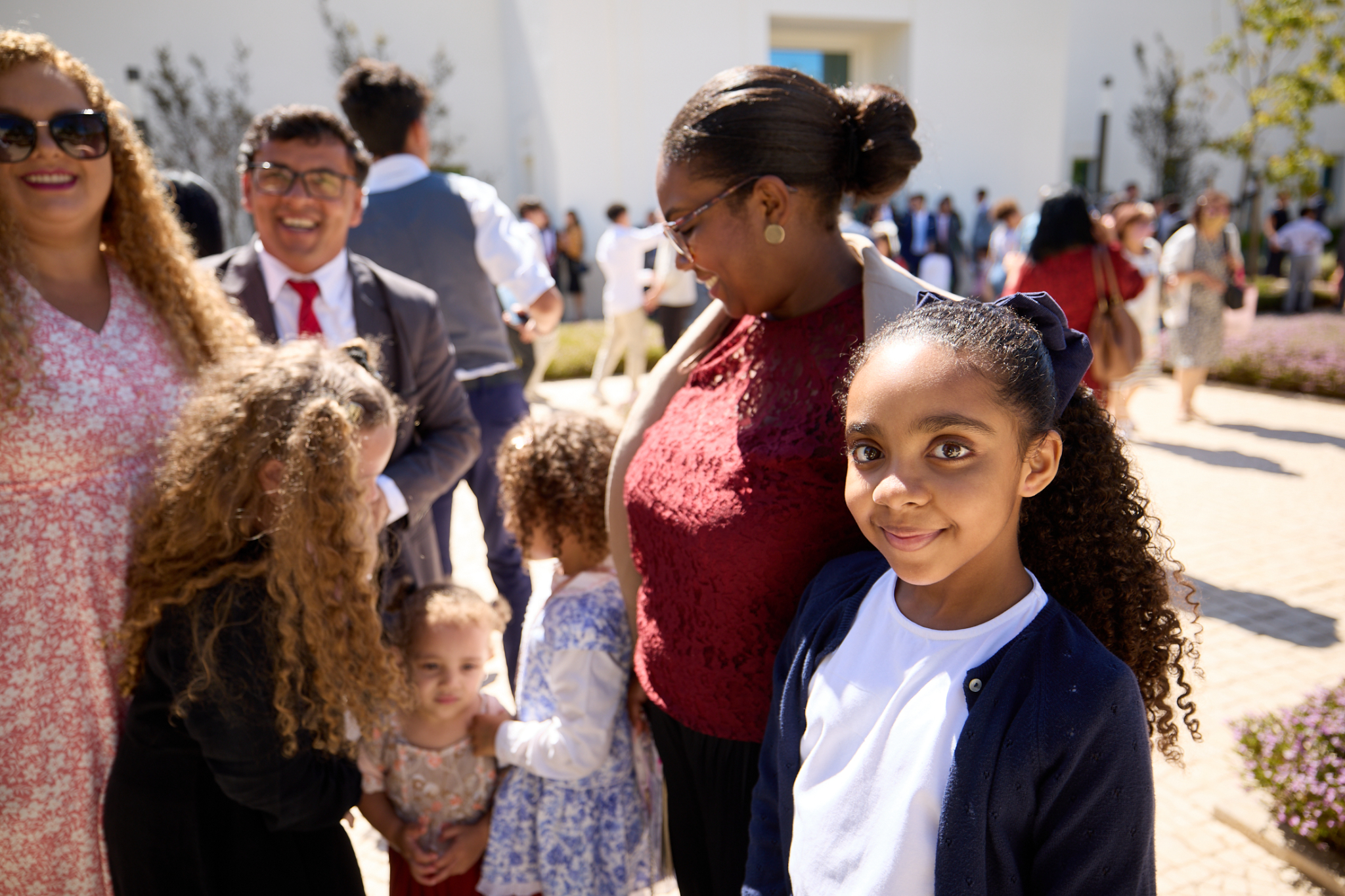 Elder Ulisses Soares of the Quorum of the Twelve Apostles greets a young girl at a special stake conference in Lisbon, Portugal on Sunday, September 11, 2022. 2022 by Intellectual Reserve, Inc. All rights reserved.“It was beautiful to see how my grandparents kept their culture of embracing each other and supporting each other even out of their own country,” Elder Soares said. “They made their little country there in Brazil. And that’s how I grew up. That’s how I was raised by my parents that brought that piece of culture of my grandparents to me.”