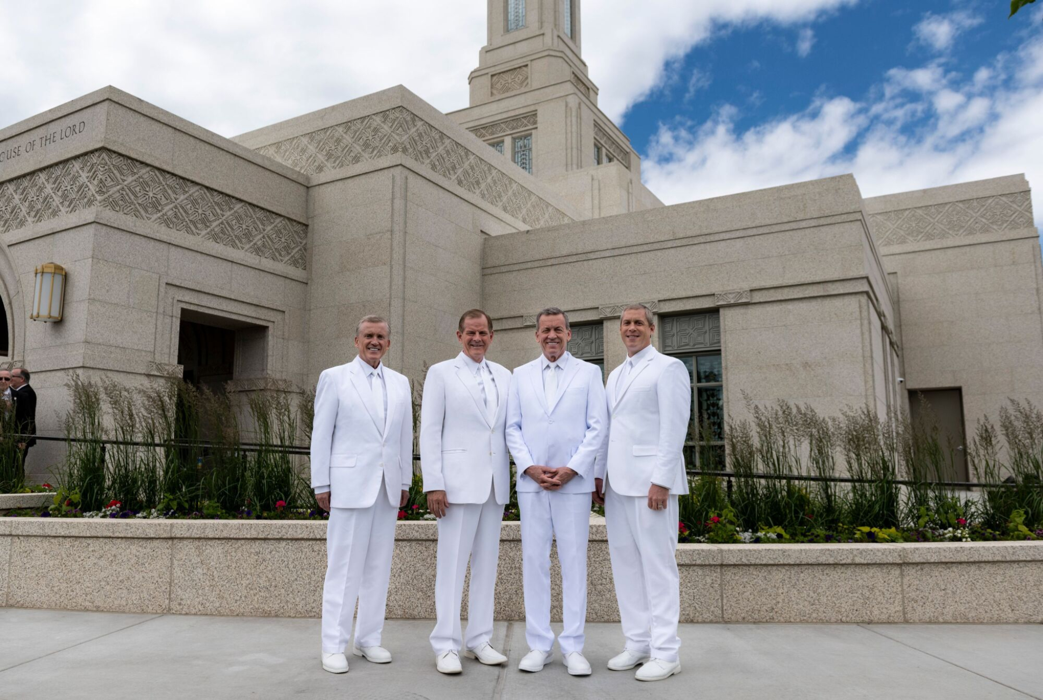 From left, Elder Kevin R. Duncan, General Authority Seventy and Temple Department executive director, and his wife, Sister Nancy Duncan; Elder Gary E. Stevenson of the Quorum of the Twelve Apostles and his wife, Sister Lesa Stevenson; Elder Randall K. Bennett, General Authority Seventy and counselor in the North America Central Area Presidency, and his wife, Sister Shelley Bennett; and Michael Suhaka, managing director of the Temple Department, and his wife, Sheri Suhaka, June 18, 2023.