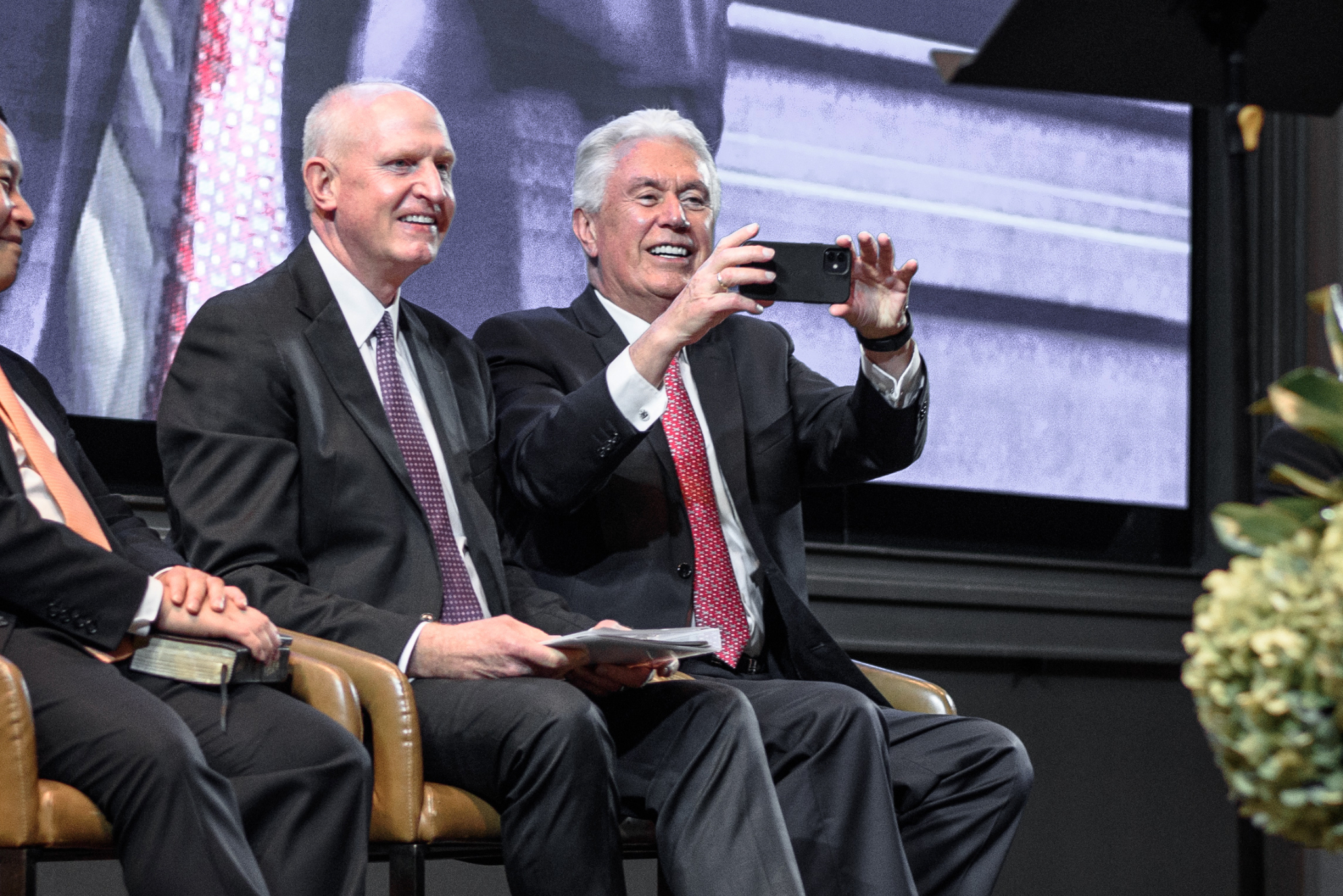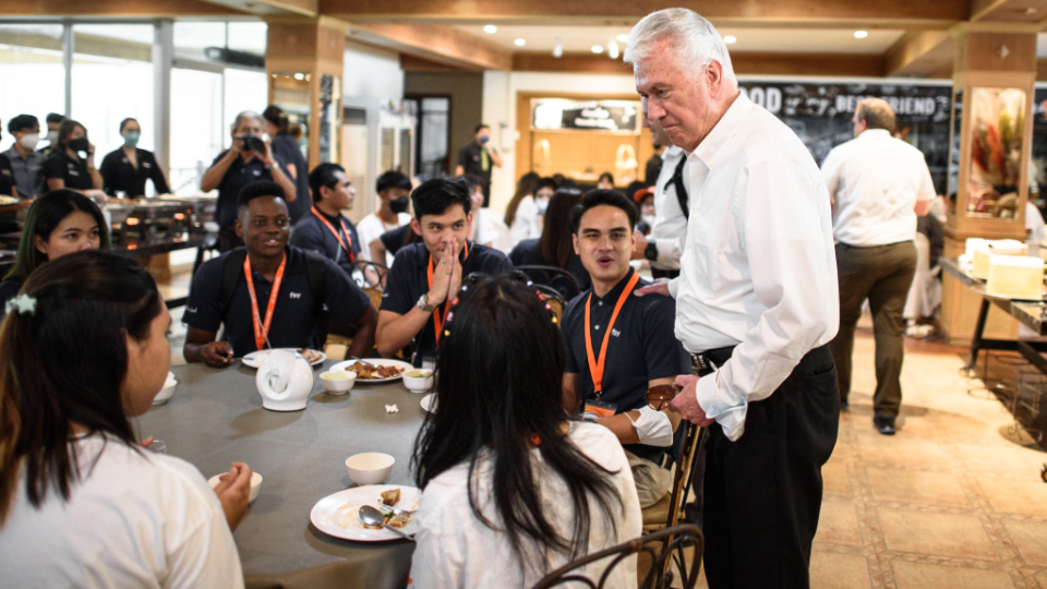 Elder Dieter F. Uchtdorf of the Quorum of the Twelve Apostles visits with a priesthood leader in Bangkok, Thailand, on Saturday, October 22, 2022, during his ministry visit to Indonesia and Thailand.2022 by Intellectual Reserve, Inc. All rights reserved.Elder Uchtdorf encouraged devotional attendees to focus on what they could do in their current circumstances and not on what they couldn’t do. He said, “You are the message. You are the testimony. You are the strength. And your choices will make all the difference.”