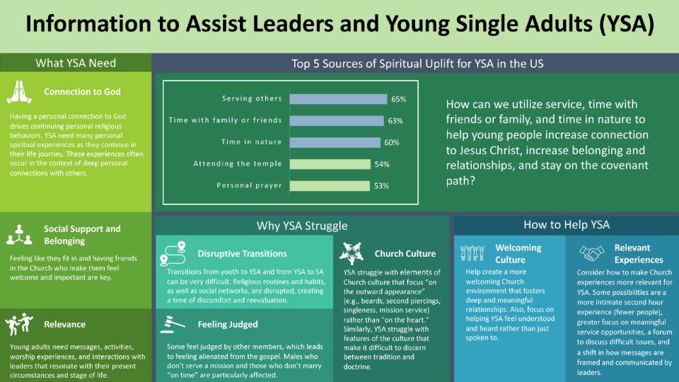 Recently, the Church produced an infographic to assist leaders as they listen to and seek to understand the experiences of members who are single. The graphic below describes what these members have said about what they need, why they struggle, where they find spiritual strength and how leaders can help them. For example, connecting with God, having social support, and engaging in relevant experiences are paramount for them.