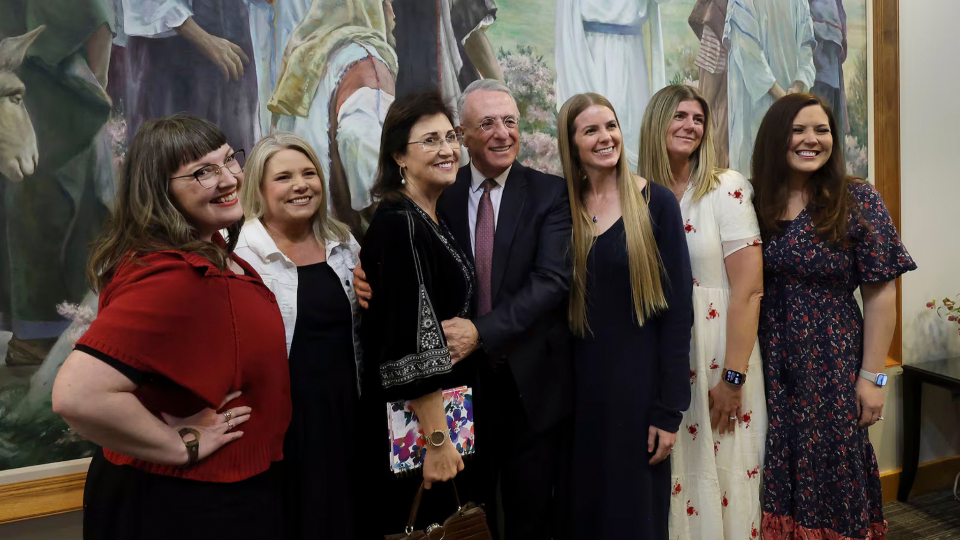 Elder Ulisses Soares of the Quorum of the Twelve Apostles and his wife, Rosana, pose for a photo with five of their former missionaries from the Portugal Porto Mission after a devotional at the Provo Missionary Training Center in Provo, Utah, on Tuesday, March 10, 2026. Photo by Jeffrey D. Allred, courtesy of Church News.Copyright 2026 Deseret News Publishing Company.Centered on Christ