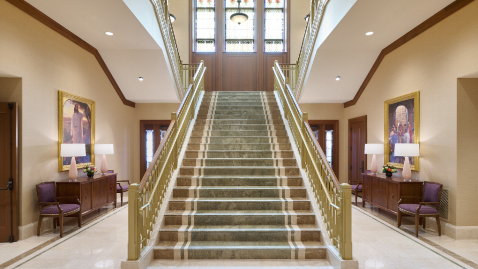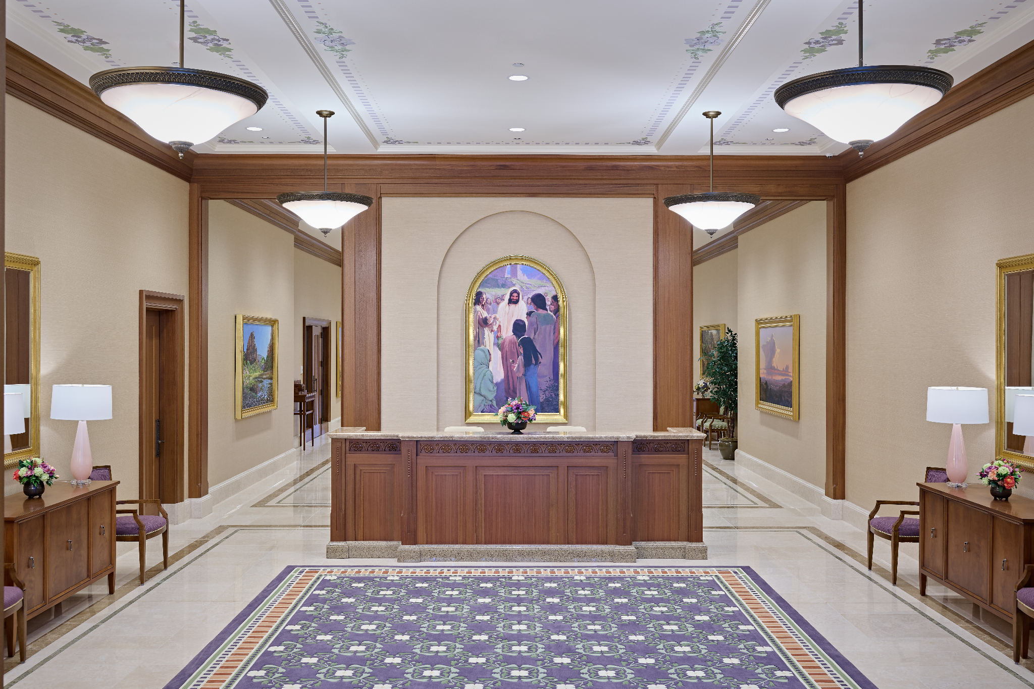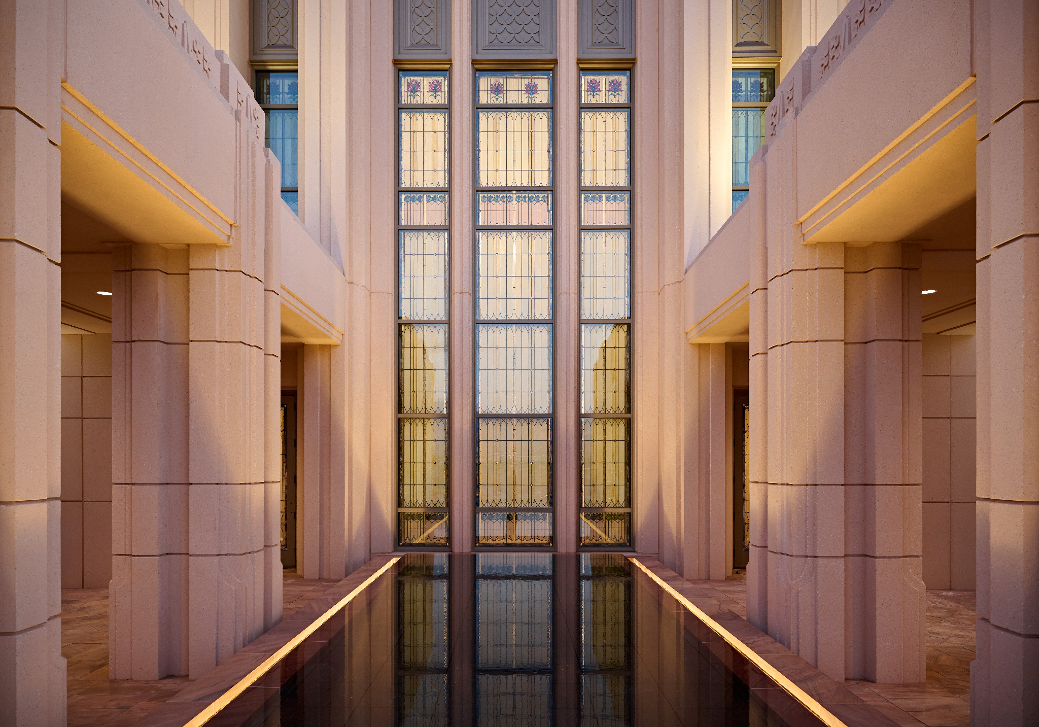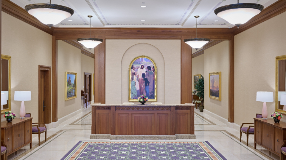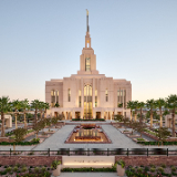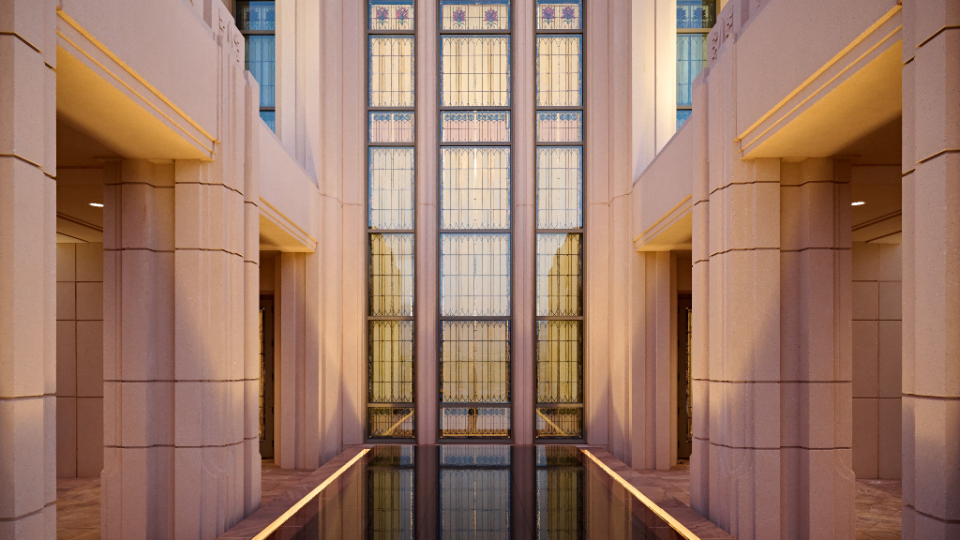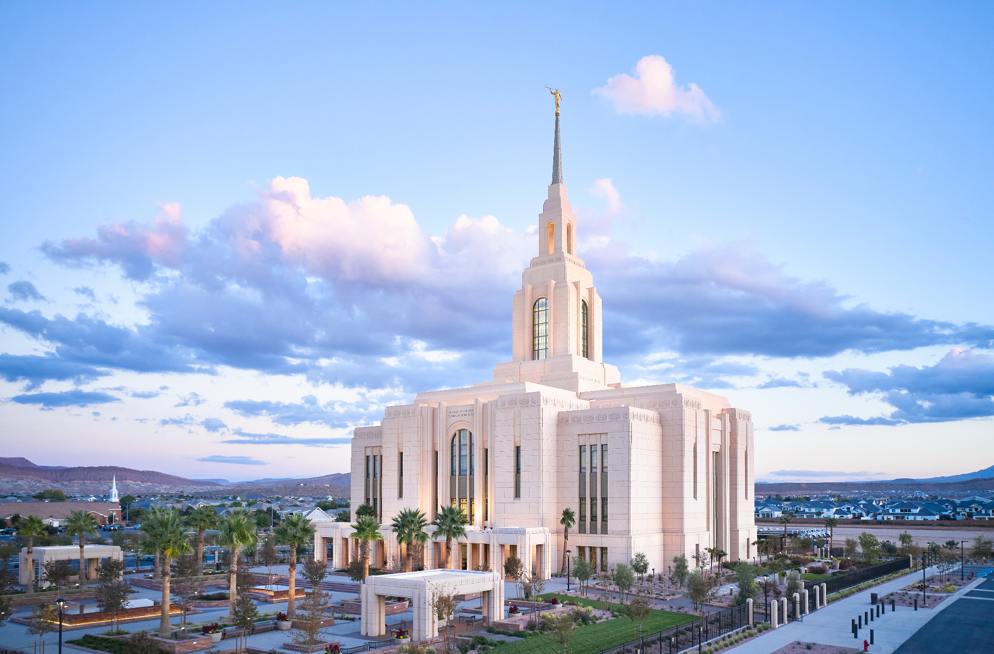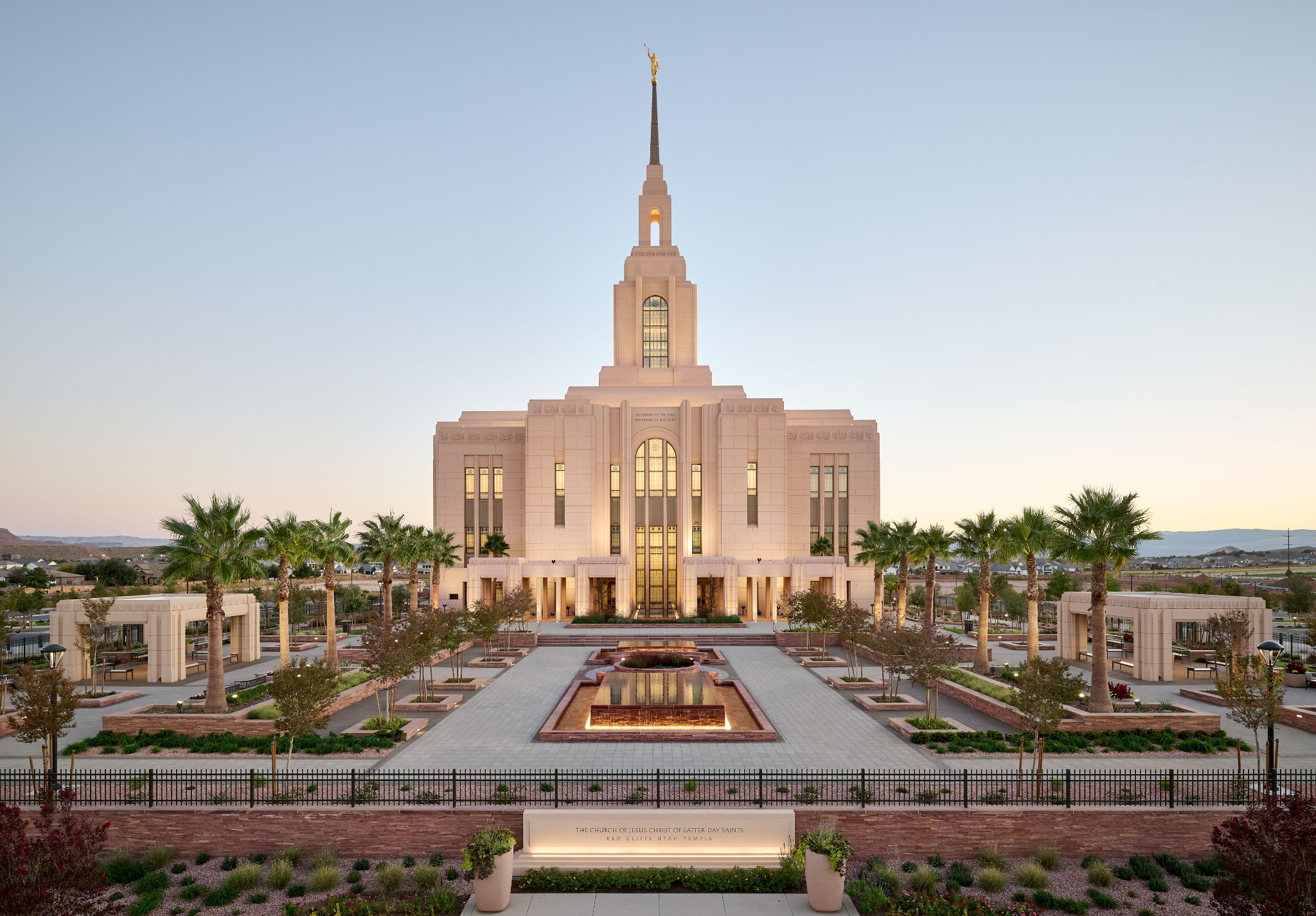 The temple’s interior and exterior motifs resemble the environment surrounding the St. George area and were inspired by Southern Utah’s grand cottonwood trees and its numerous mountains and canyons. A palm tree-lined entrance leads to the sacred edifice. This house of the Lord stands against the scenic Red Cliff mountains as a beacon of serenity and peace for all who enter.