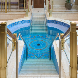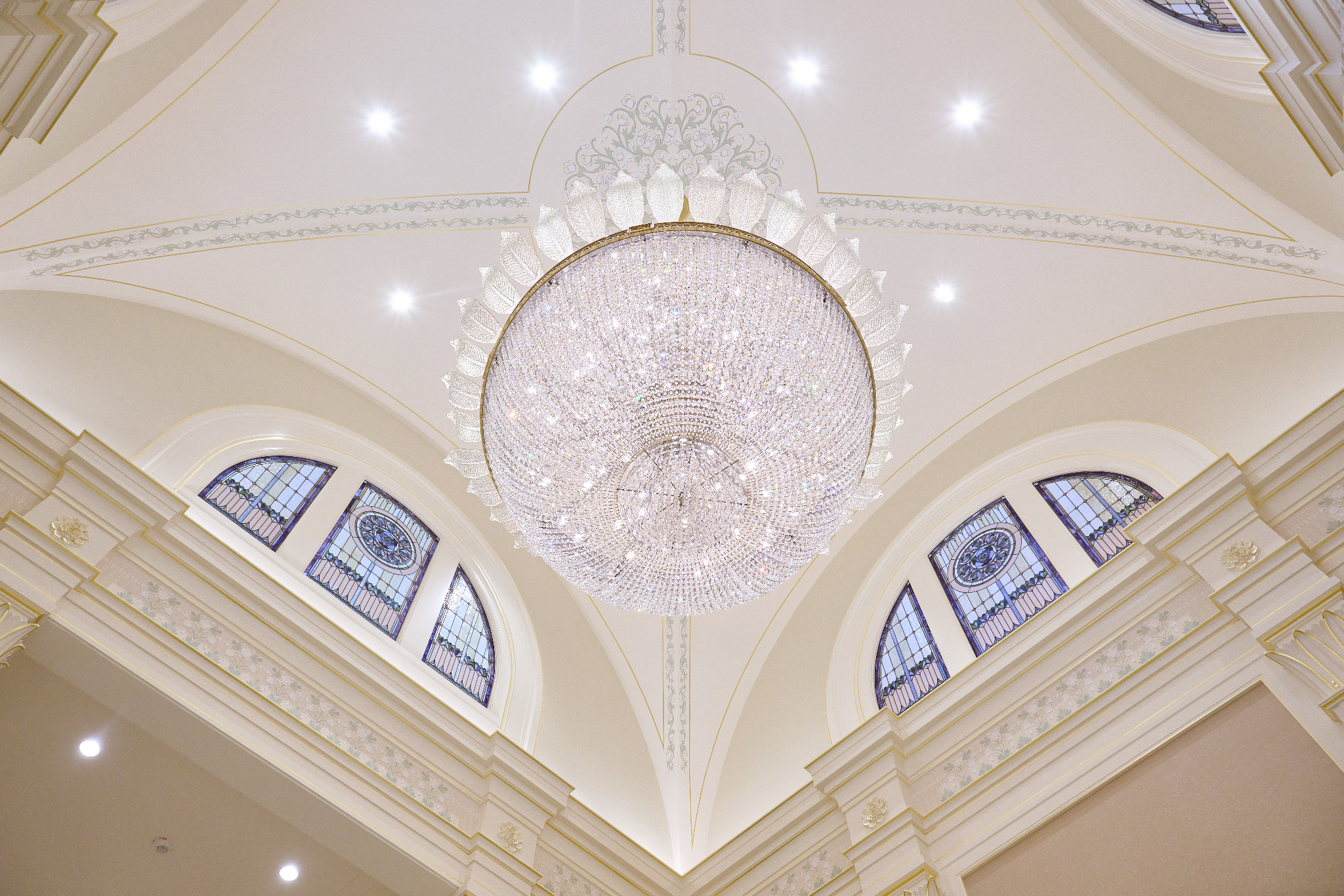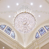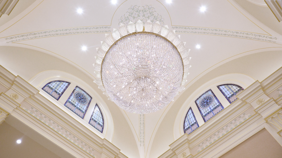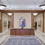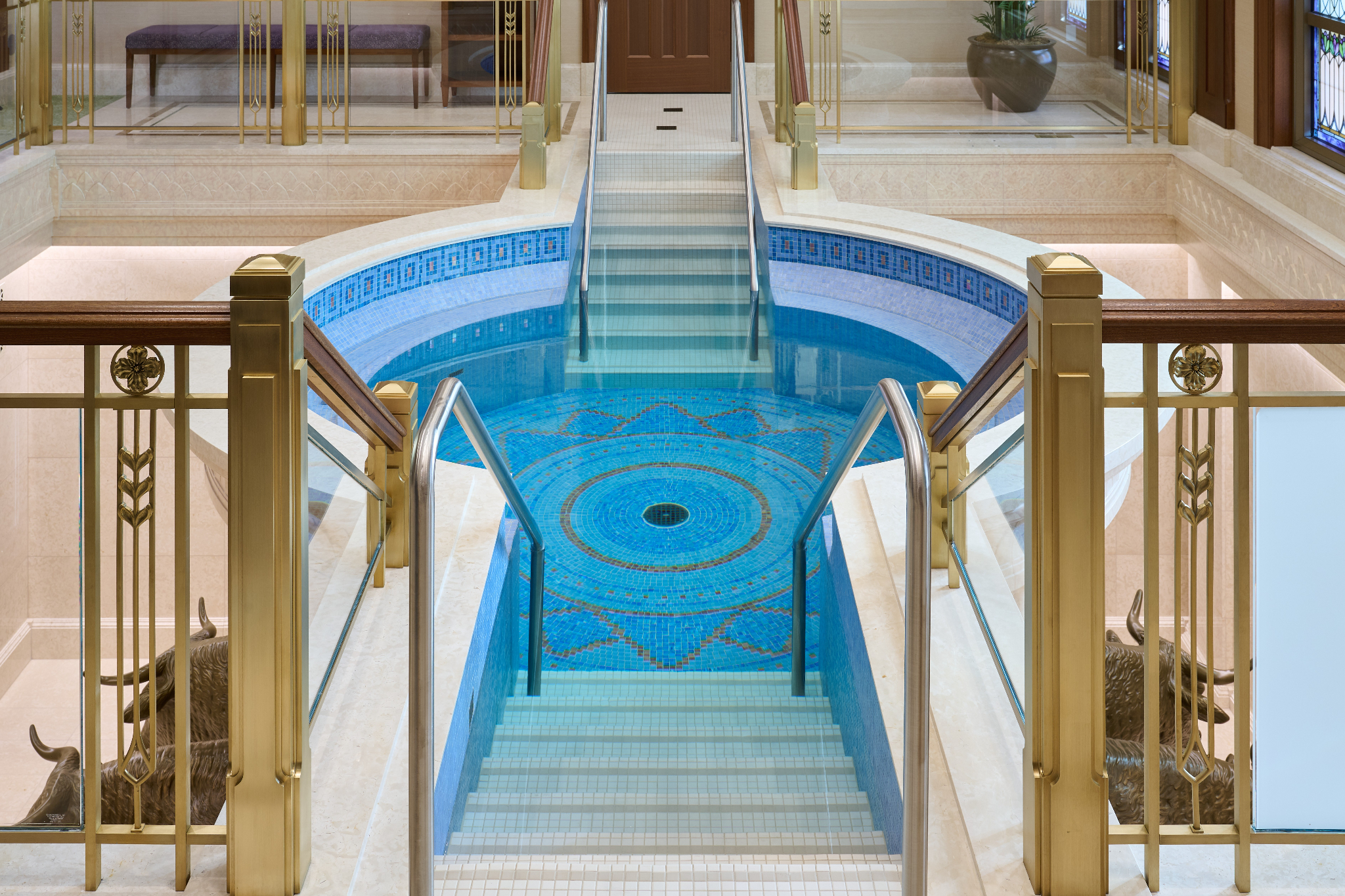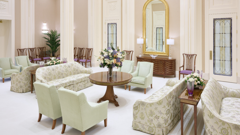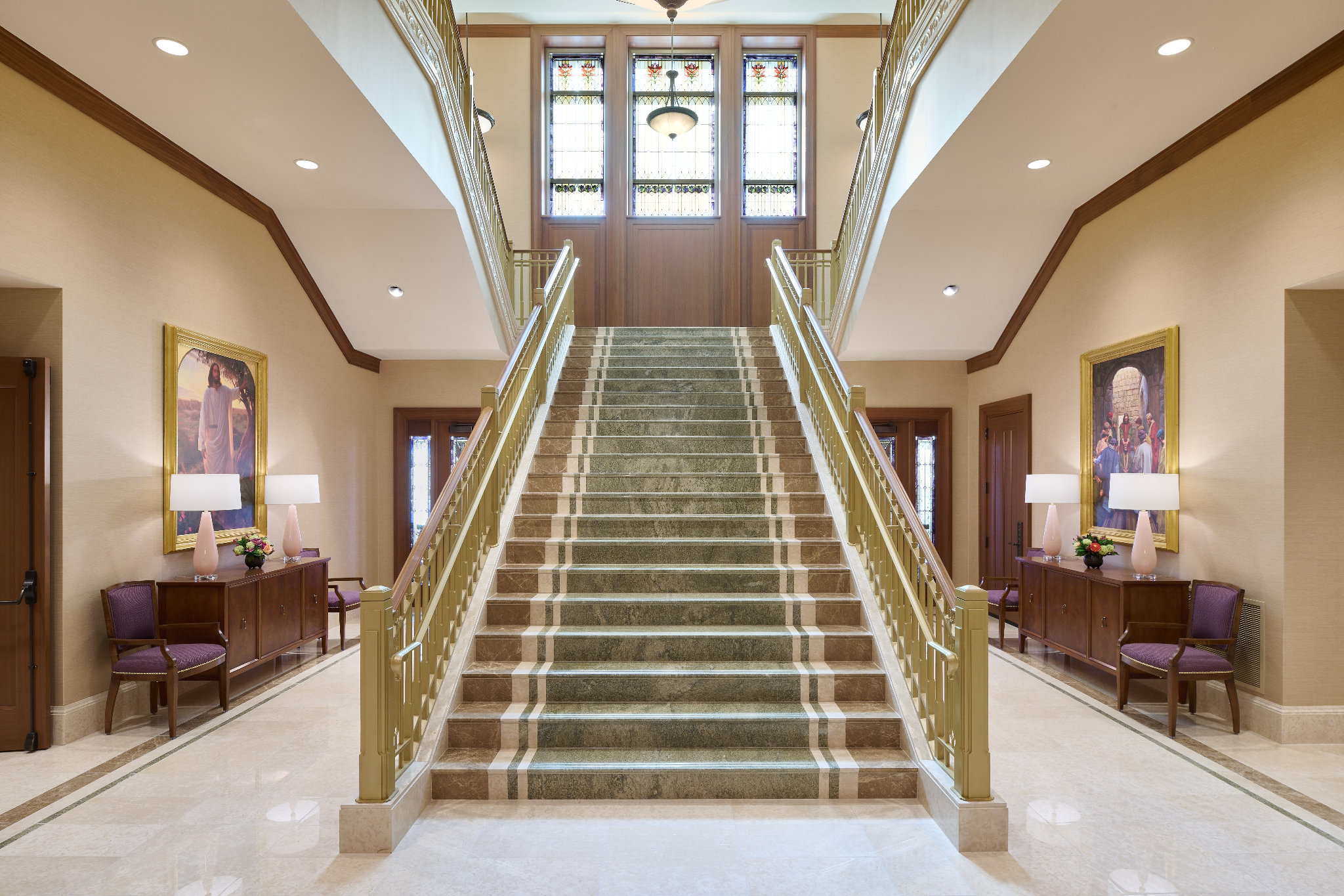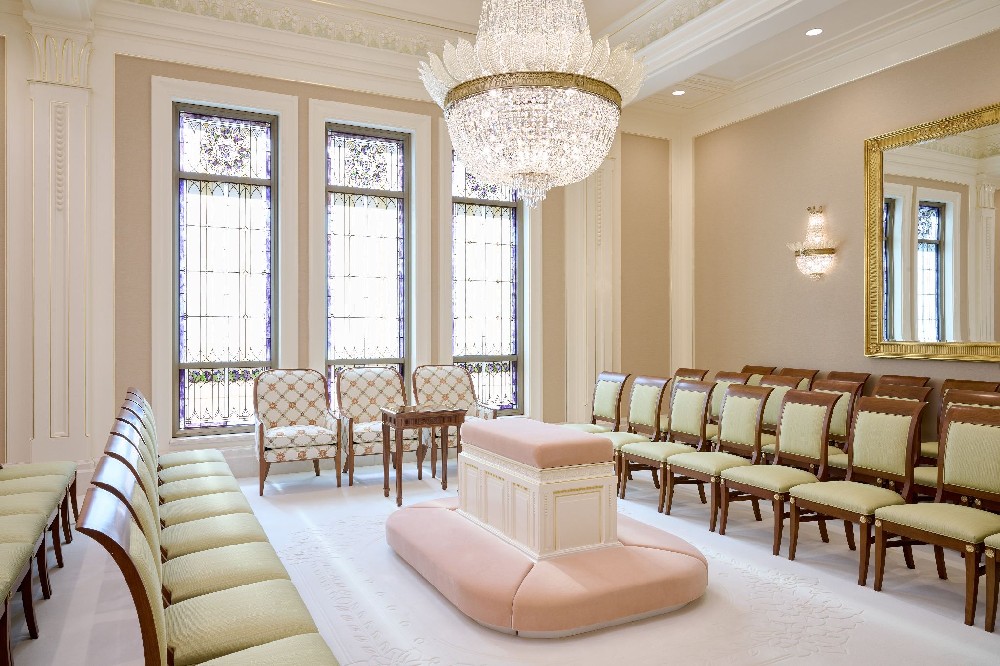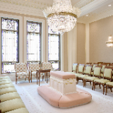 The temple’s interior and exterior motifs resemble the environment surrounding the St. George area and were inspired by Southern Utah’s grand cottonwood trees and its numerous mountains and canyons. A palm tree-lined entrance leads to the sacred edifice. This house of the Lord stands against the scenic Red Cliff mountains as a beacon of serenity and peace for all who enter.