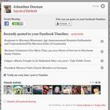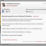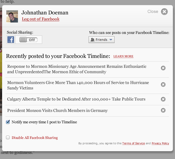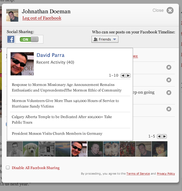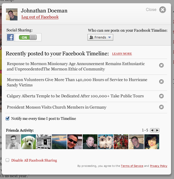 (Coming soon) Once you are logged into Facebook, a new window will display information on your recent activity as well as your friends’ activity on MormonNewsroom.org. Note: Frictionless sharing will only be turned on for you on MormonNewsroom.org.
