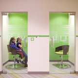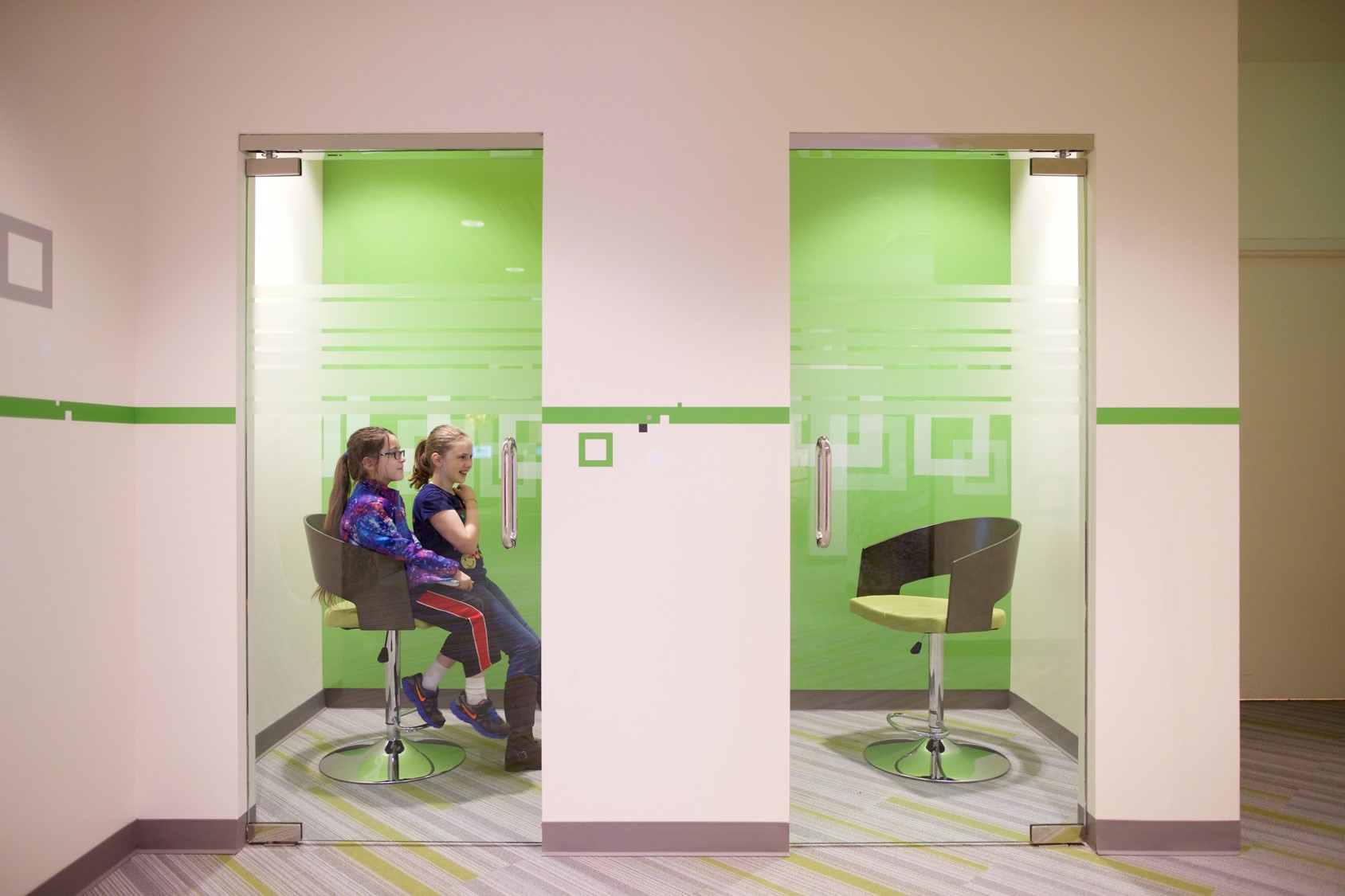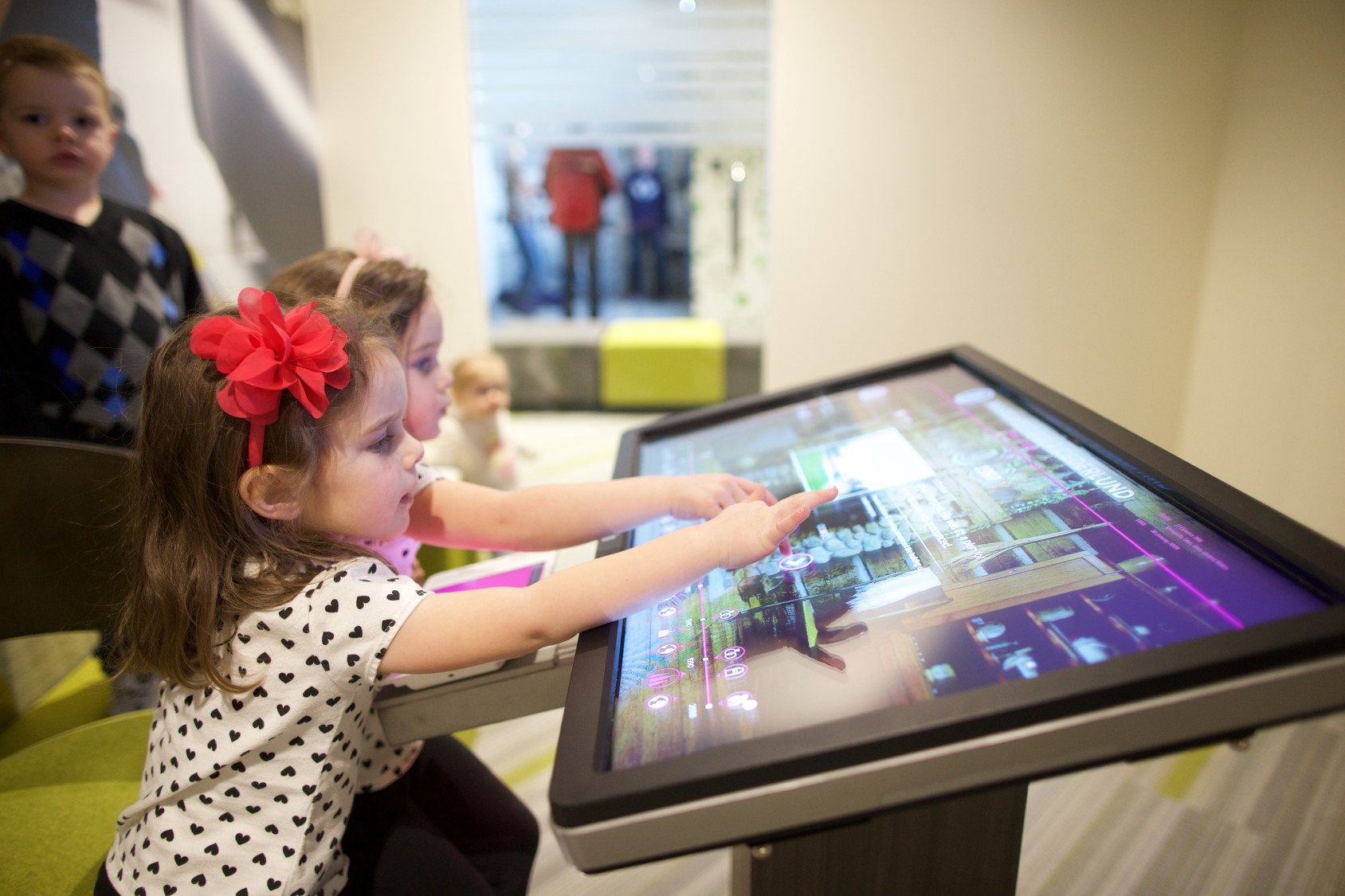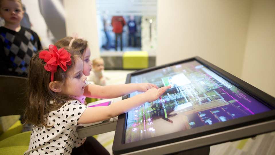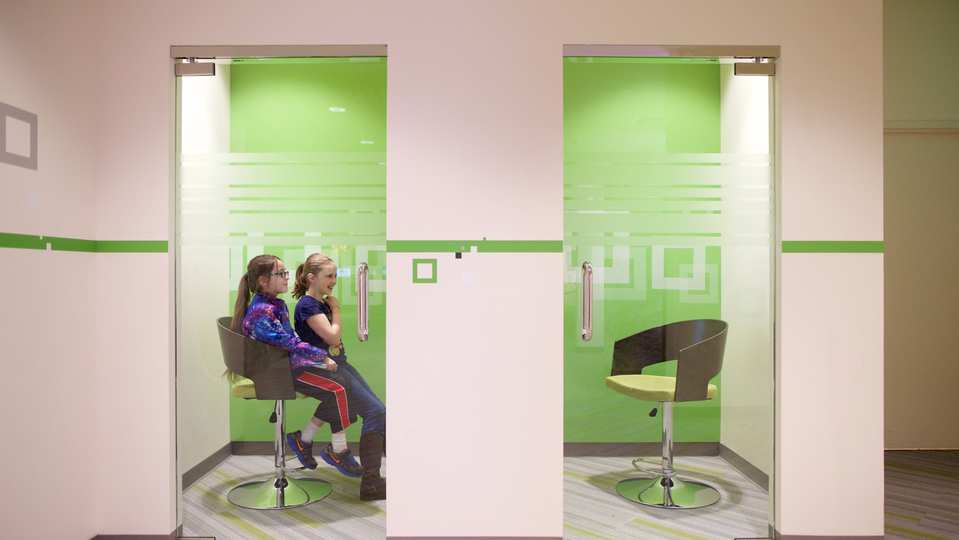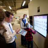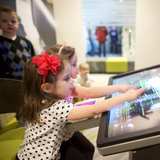 On the main floor, youth can enjoy the life-sized, touch-screen computer monitors for some of the interactive stations. At a fun green screen, guests can choose from a variety of themed backgrounds to create a lasting photo memory of their visit to the discovery experiences. In addition, there is an enclosed play space for parents with small children.