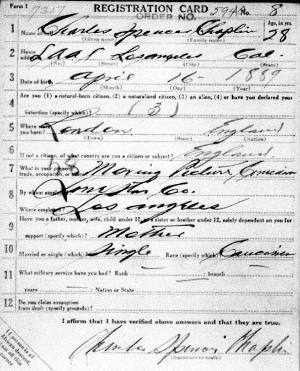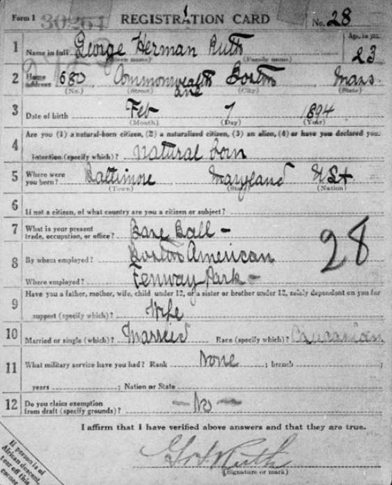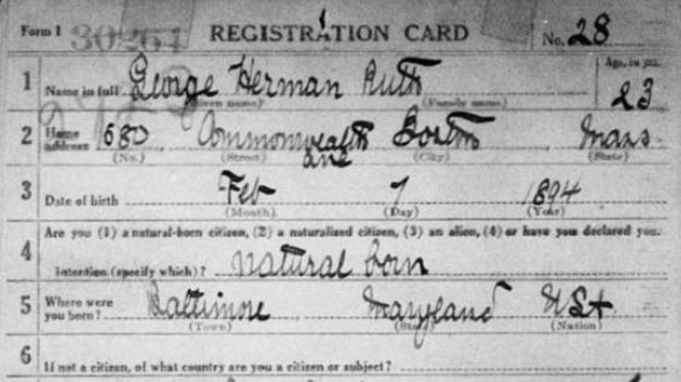 Nelson said the draft registration cards include notables such as baseball great Babe Ruth, entertainer and musician George M. Cohan, immigrant Metropolitan tenor Enrico Caruso and silent film star Charlie Chaplin, who was a British enrollee.