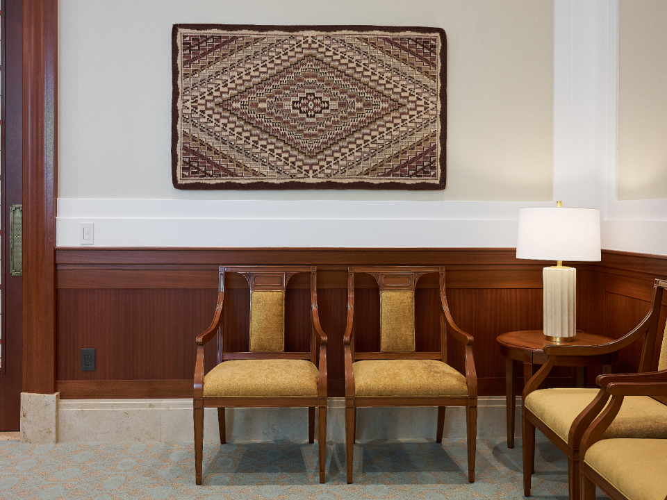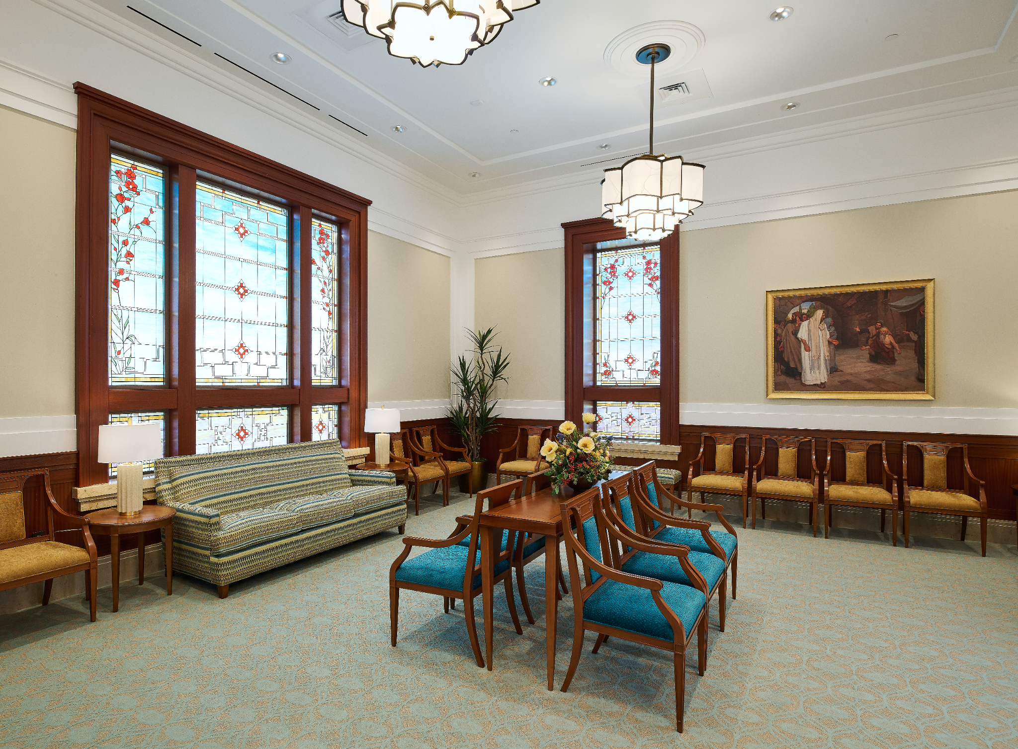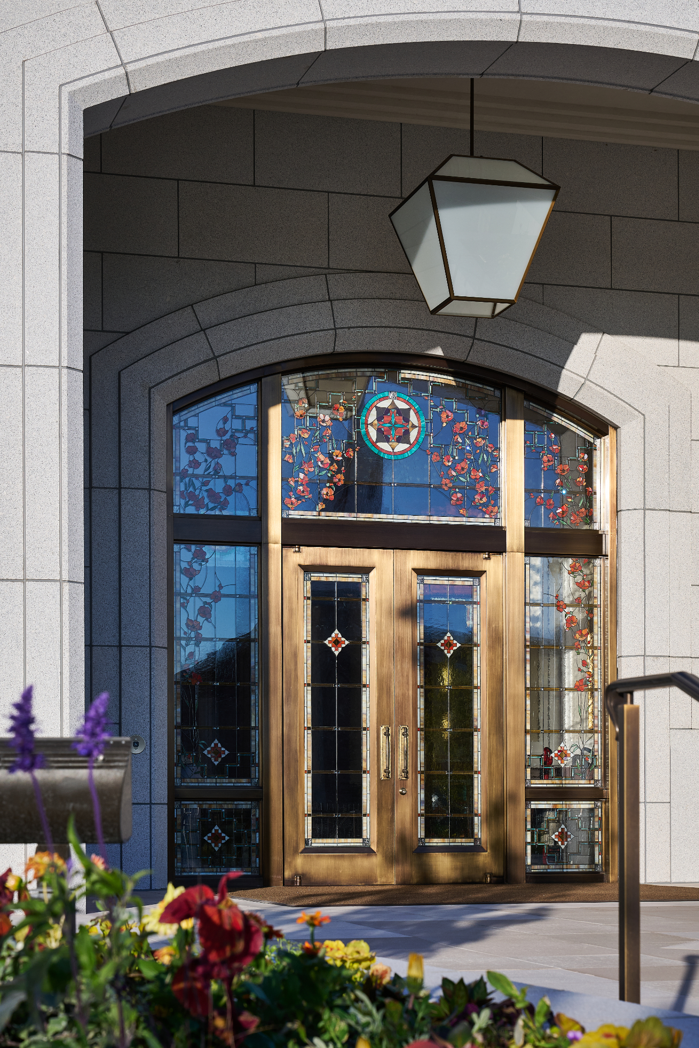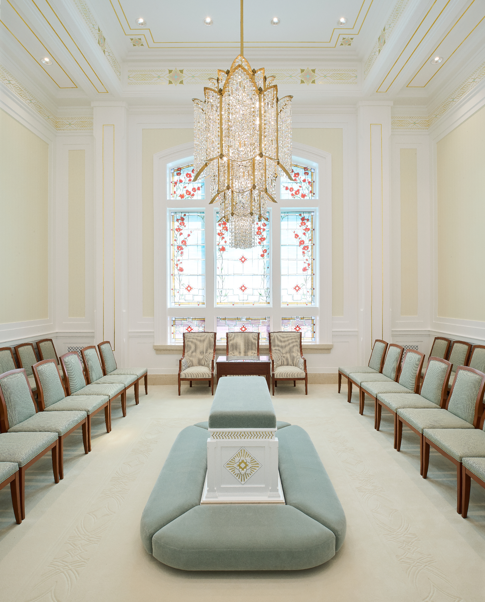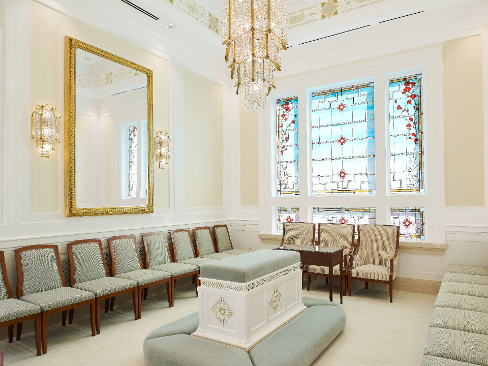 The Farmington Temple’s interior design motifs draw inspiration from local Native American influence, featuring feather patterns, organic chevron and diamond running patterns, geometric line work, and stepped pyramid shapes. Depictions of native flora such as the piñon pinecone and globemallow flower can also be seen throughout the temple.