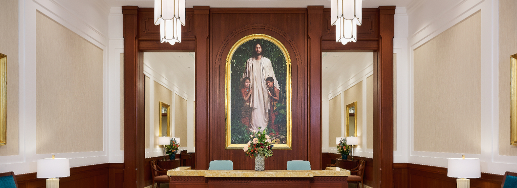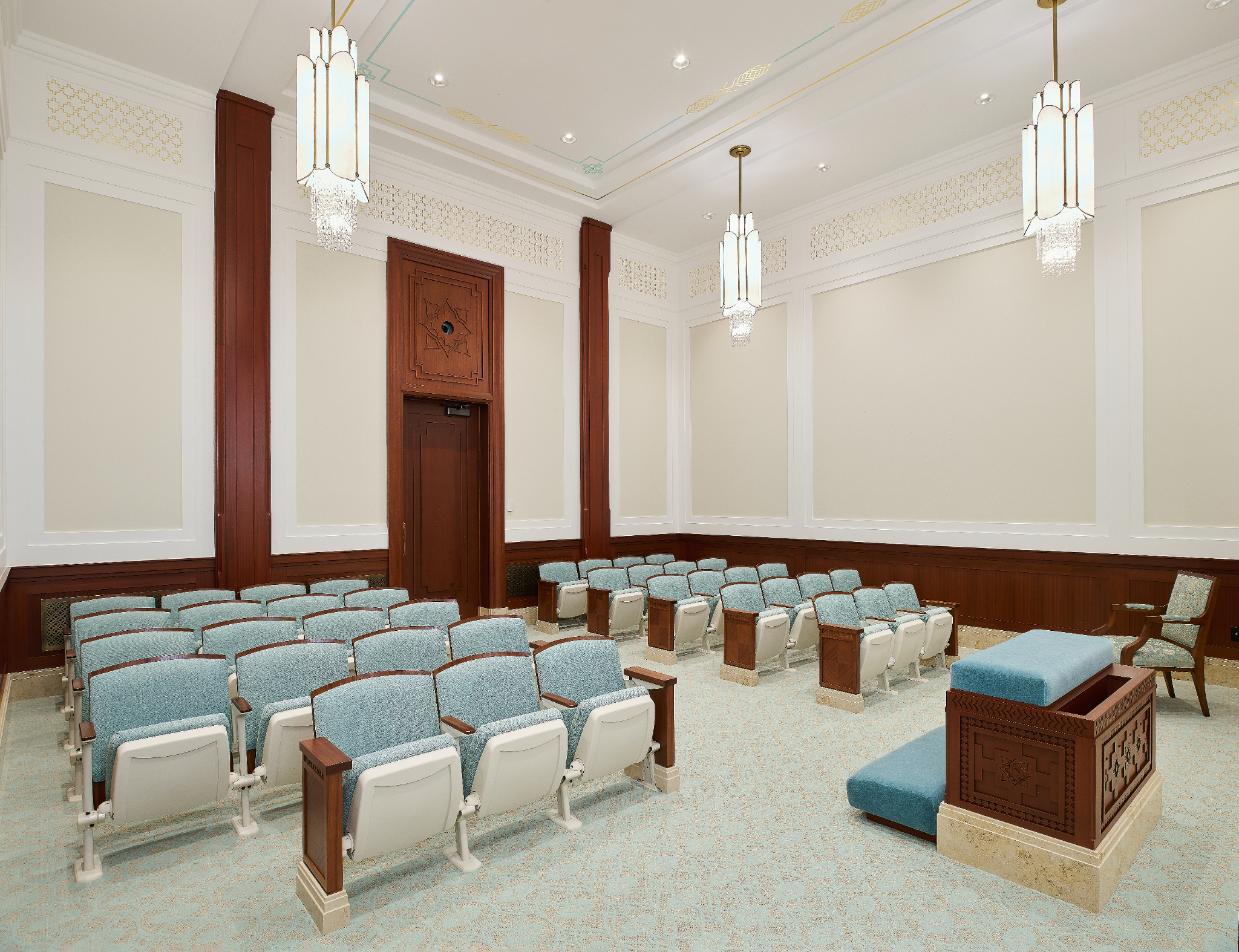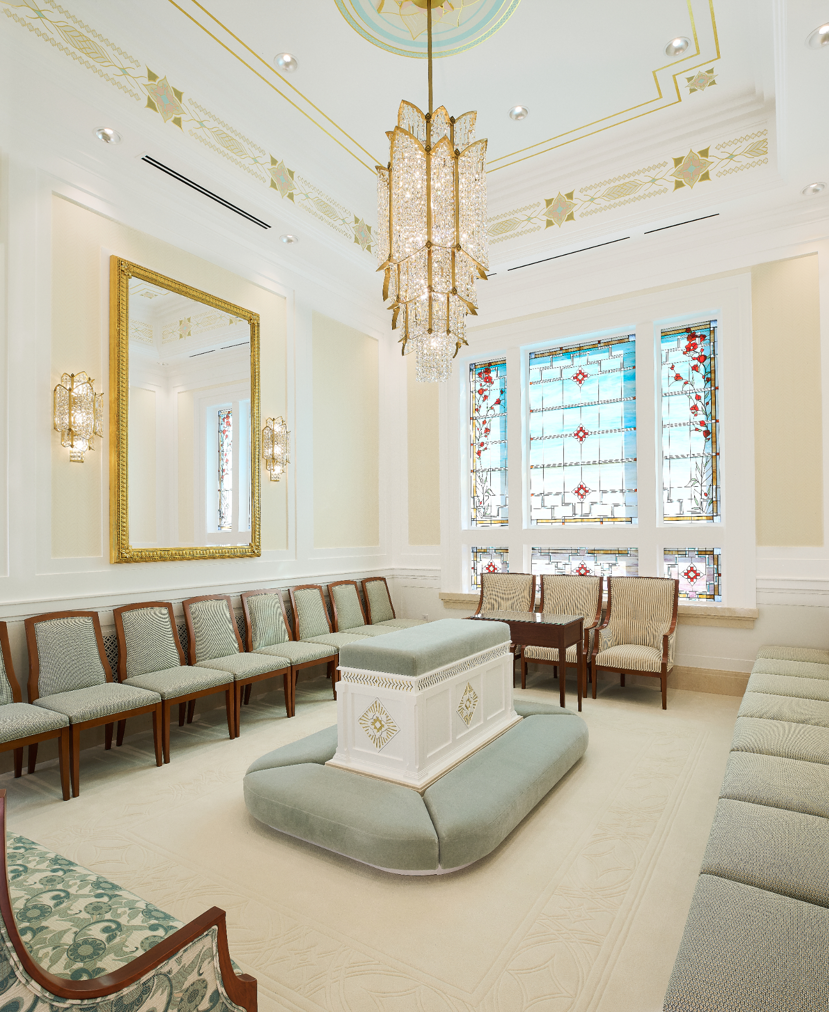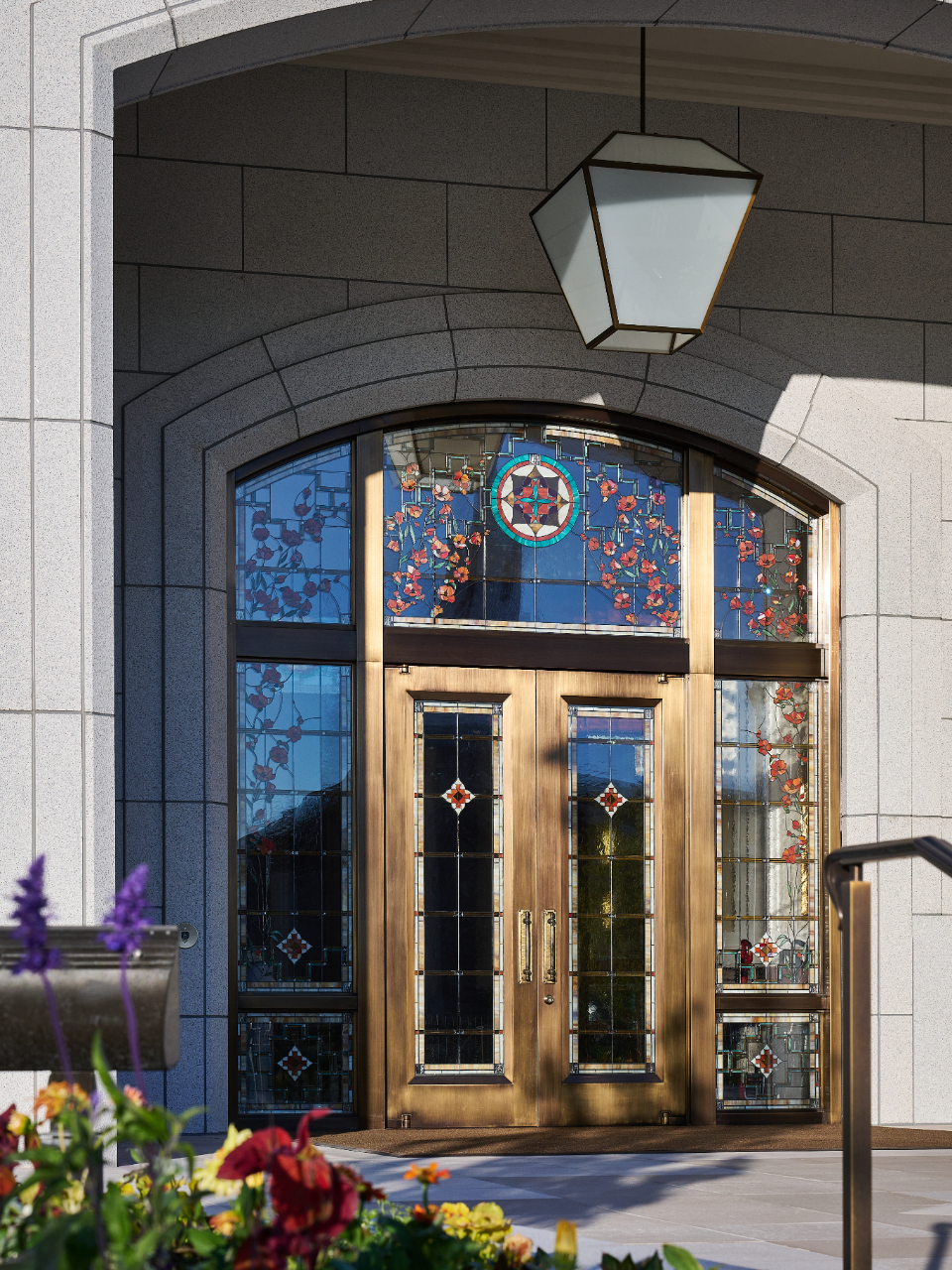 The Farmington Temple’s interior design motifs draw inspiration from local Native American influence, featuring feather patterns, organic chevron and diamond running patterns, geometric line work, and stepped pyramid shapes. Depictions of native flora such as the piñon pinecone and globemallow flower can also be seen throughout the temple.