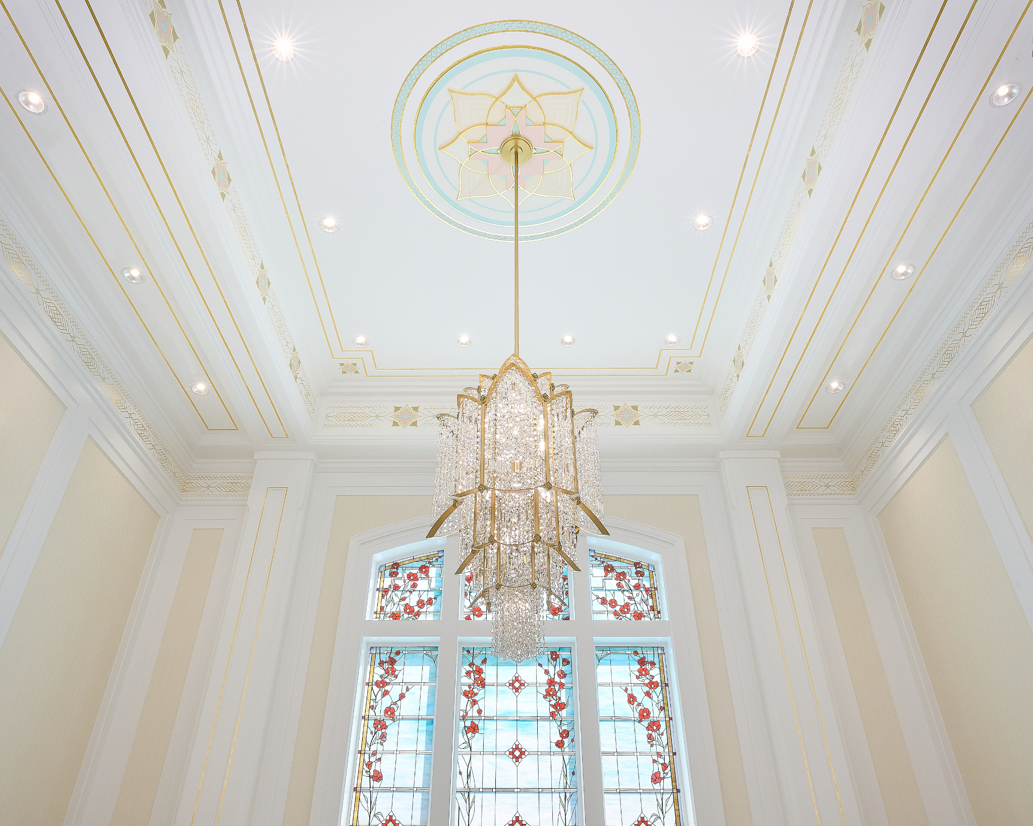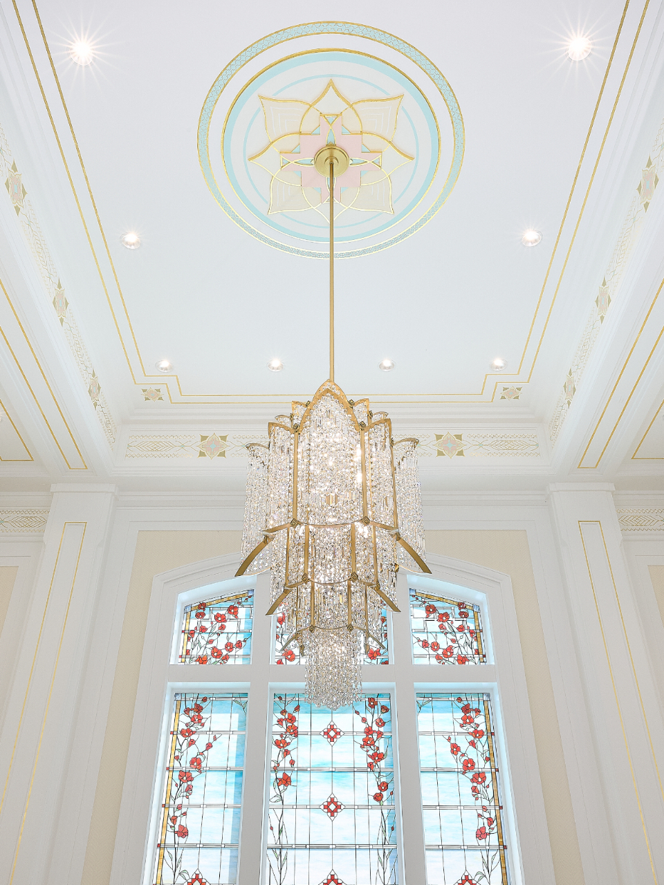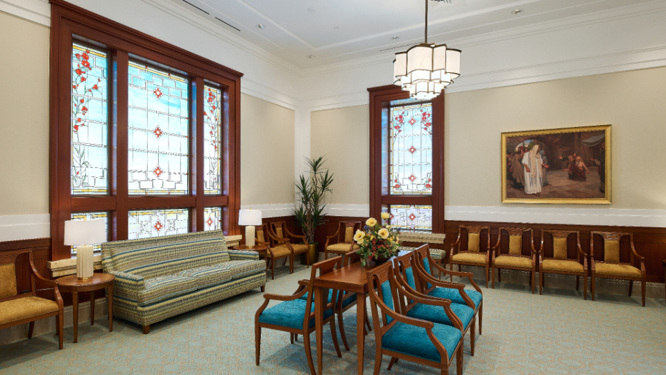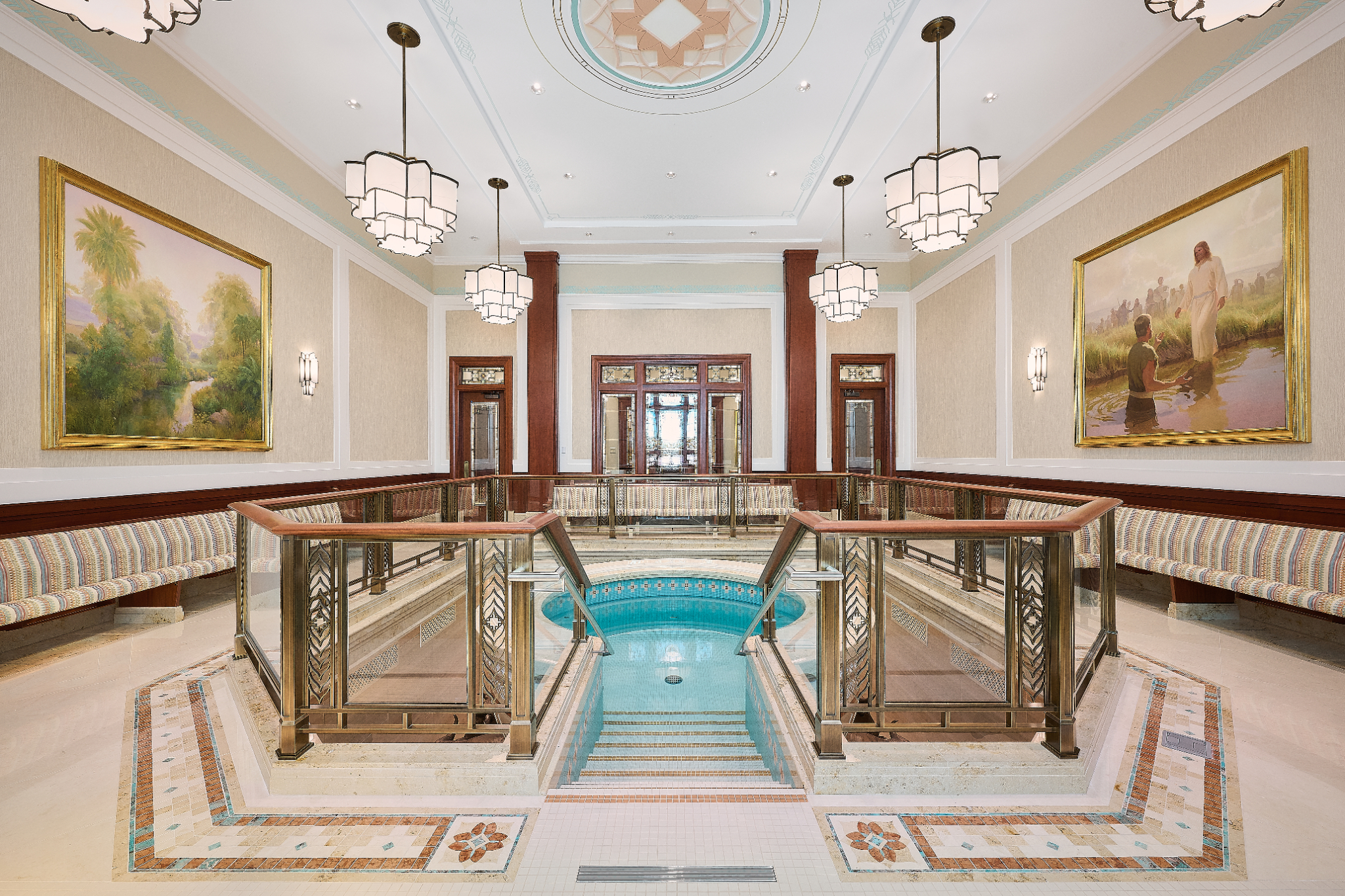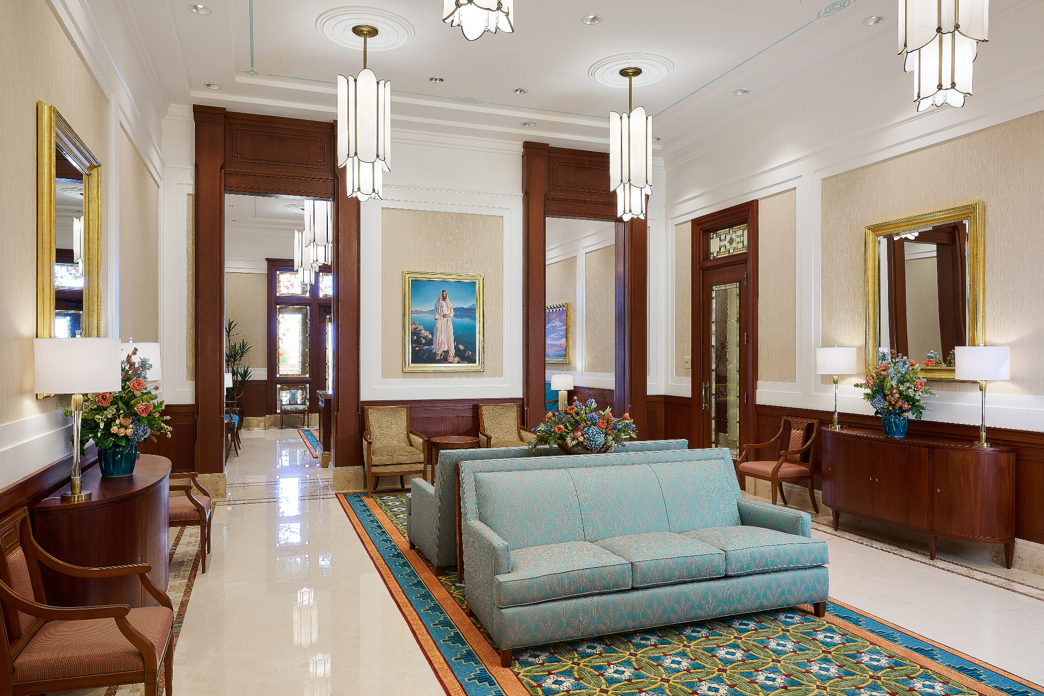 The Farmington Temple’s interior design motifs draw inspiration from local Native American influence, featuring feather patterns, organic chevron and diamond running patterns, geometric line work, and stepped pyramid shapes. Depictions of native flora such as the piñon pinecone and globemallow flower can also be seen throughout the temple.