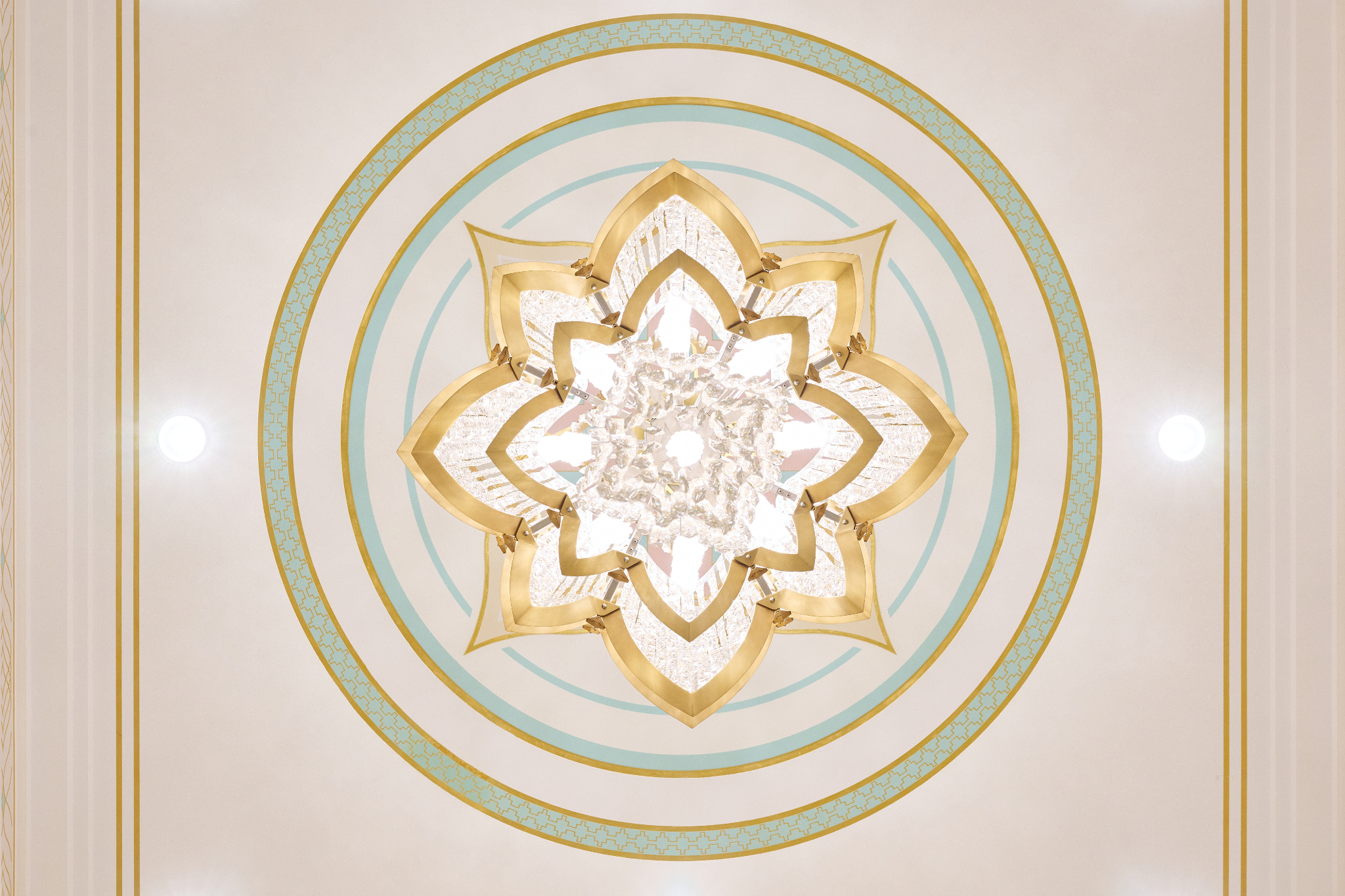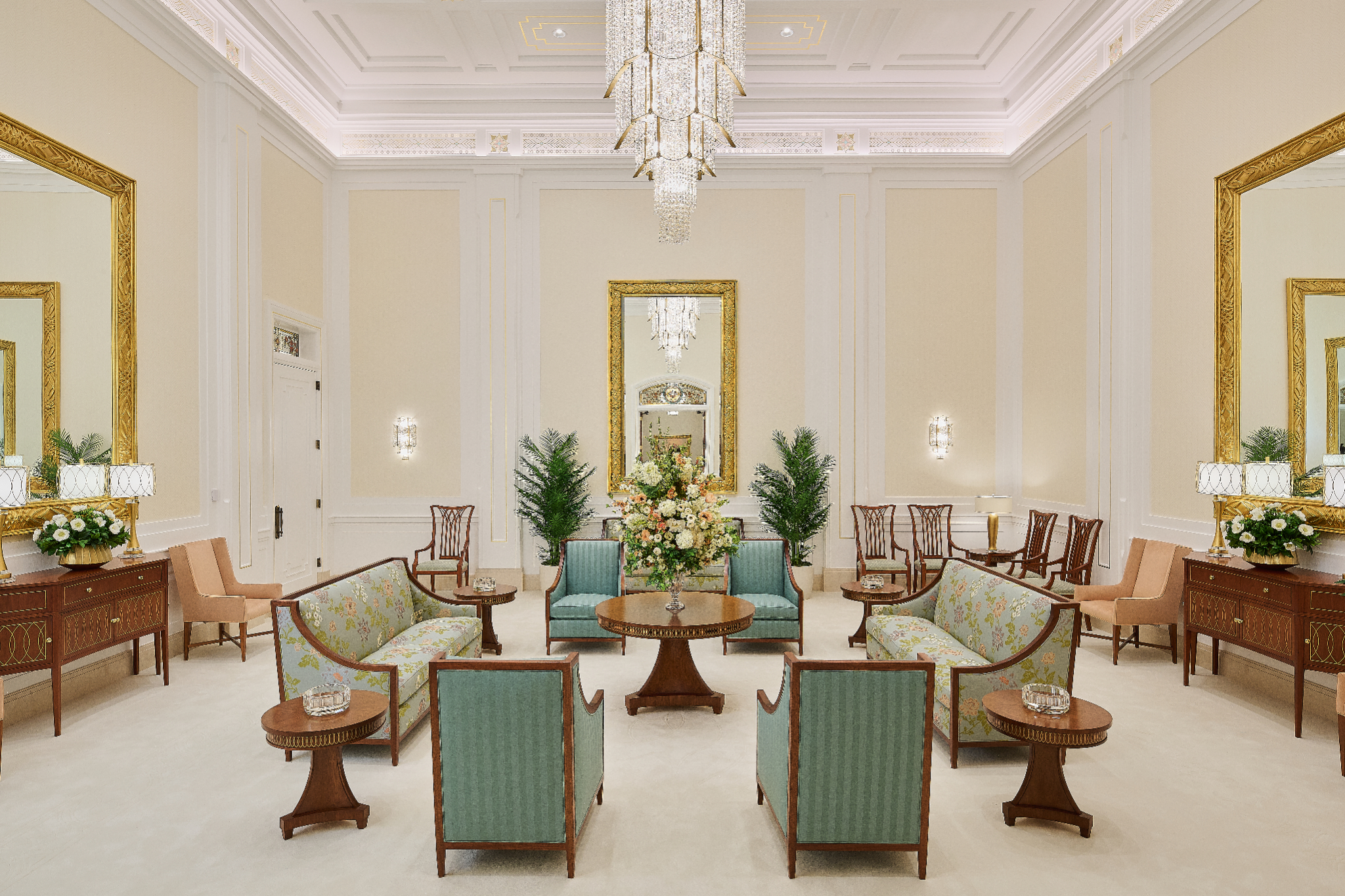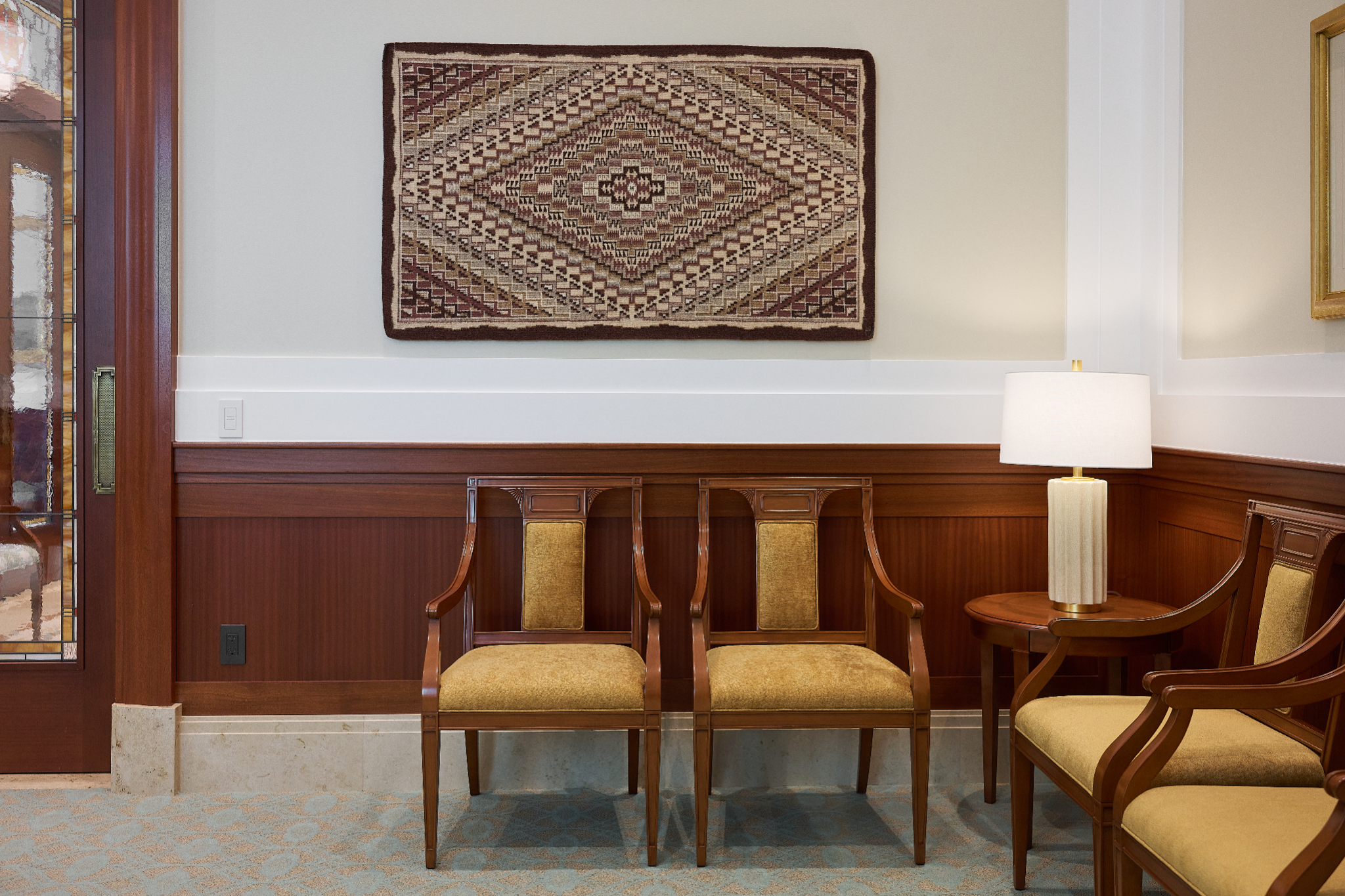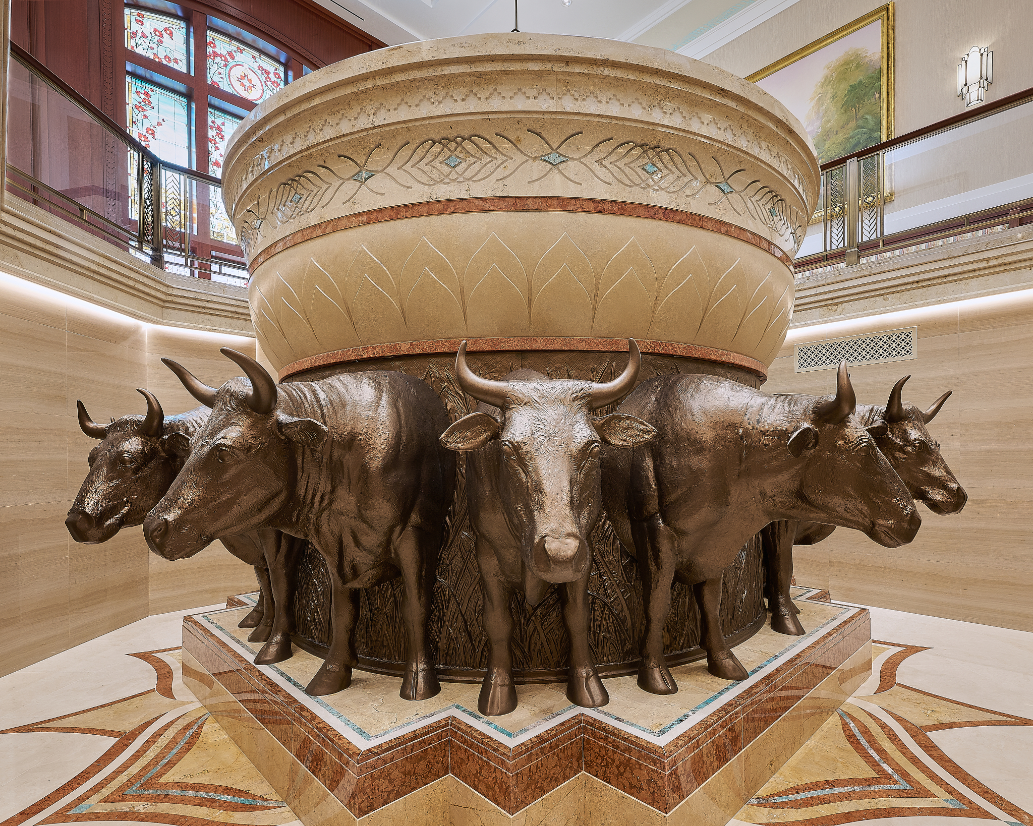 The Farmington Temple’s interior design motifs draw inspiration from local Native American influence, featuring feather patterns, organic chevron and diamond running patterns, geometric line work, and stepped pyramid shapes. Depictions of native flora such as the piñon pinecone and globemallow flower can also be seen throughout the temple.