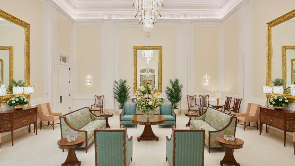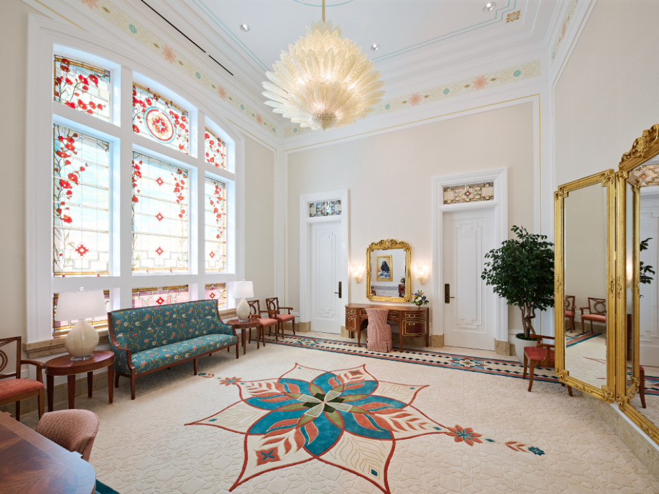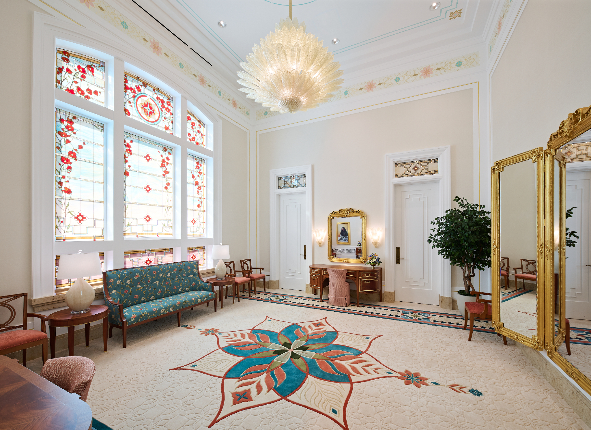 The interior’s vibrant colors, including coral, turquoise, green, orange and warm cream, reflect the richness and beauty of Farmington’s culture and landscape. The bride’s room features a Murano glass chandelier.