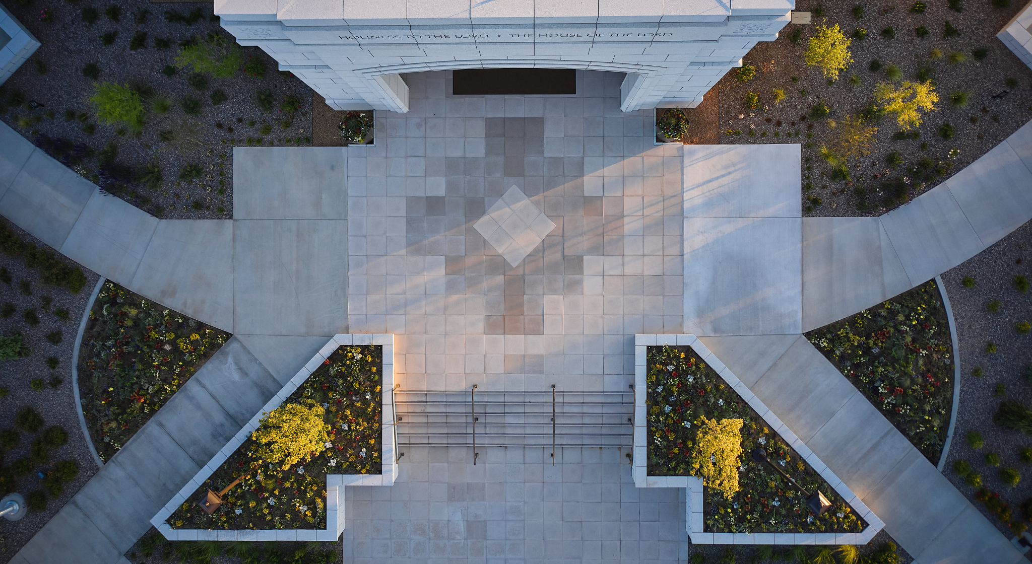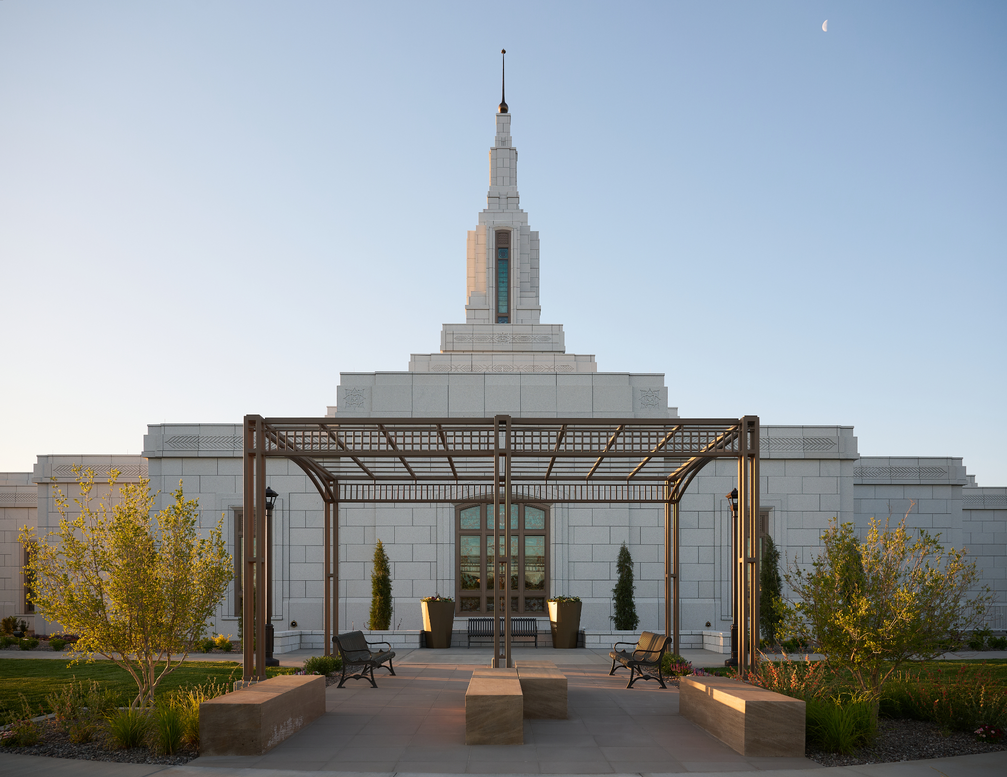 The exterior stone of the Farmington Temple is a warm Portuguese white granite. The landscape design is influenced by the geometric shapes and architecture of other buildings in the area.