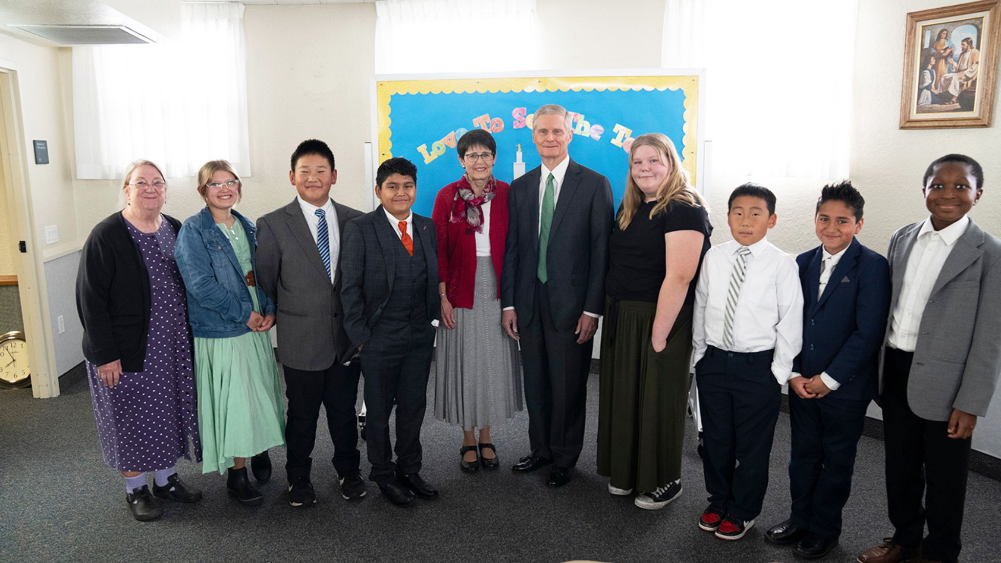 Elder David A. Bednar of the Quorum of the Twelve Apostles and his wife, Susan, stand with members of a Valiant-age Primary class who were featured in a Friend to Friend broadcast on Saturday, February 15, 2025.© 2024 by Intellectual Reserve, Inc. All rights reserved.When the children met again with Elder Bednar and Sister Bednar, Lucy Howcroft said she learned that service “could be something simple and still be fun.”