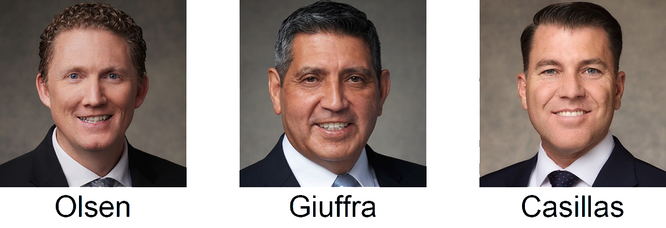 The Central America Area Presidency for 2025–2026, from left to right: Elder Ryan K. Olsen, First Counselor; Elder Patricio M. Guiffra, President; and Elder Gregorio E. Casillas, Second Counselor.