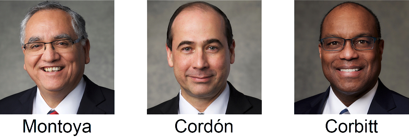 The Caribbean Area Presidency for 2025–2026, from left to right: Elder Hugo Montoya, First Counselor; Elder Valeri V. Cordón, President; and Elder Ahmad S. Corbitt, Second Counselor.
