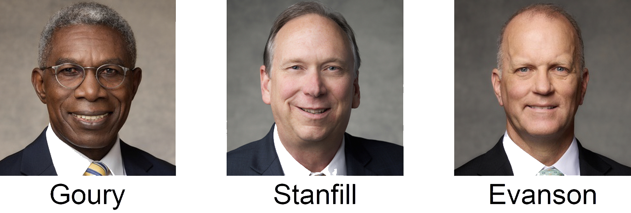 The Canada Area Presidency for 2025–2026, from left to right: Elder D. Martin Goury, First Counselor; Elder Vern P. Stanfill, President; and Elder James E. Evanson, Second Counselor.