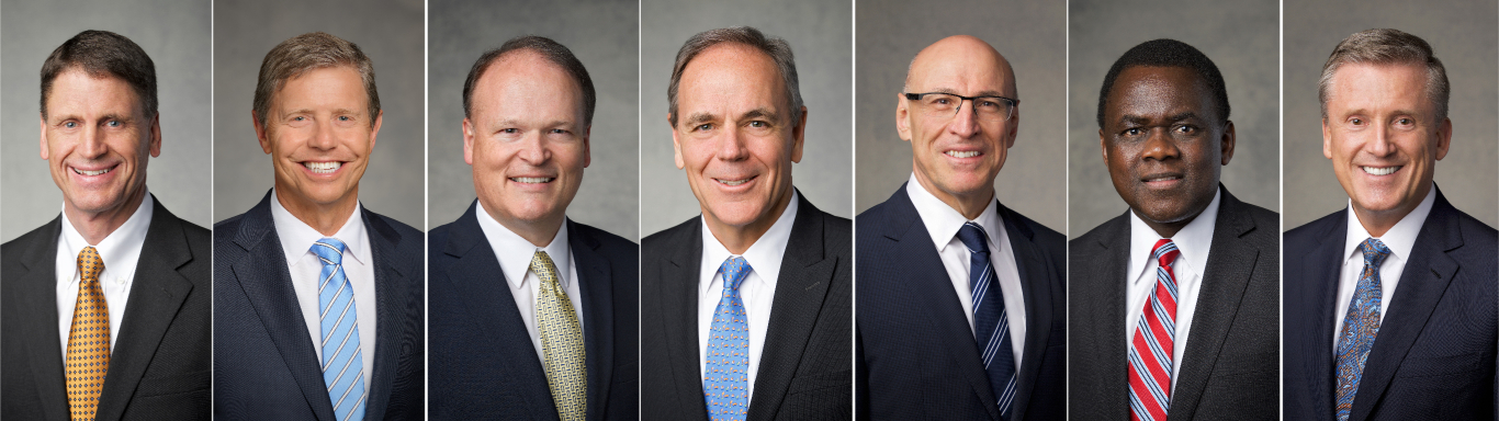 The Presidency of the Seventy for 2025–2026, from left to right below: Elder Carl B. Cook, Elder S. Mark Palmer, Elder Marcus B. Nash, Elder Michael T. Ringwood, Elder Arnulfo Valenzuela, Elder Edward Dube and Elder Kevin R. Duncan.