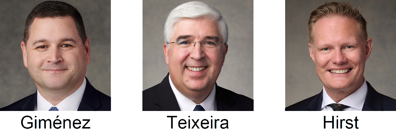 The United States Central Area Presidency for 2025–2026, from left to right: Elder Ricardo P. Giménez, First Counselor; José A. Teixeira, President; and Elder Karl D. Hirst, Second Counselor.
