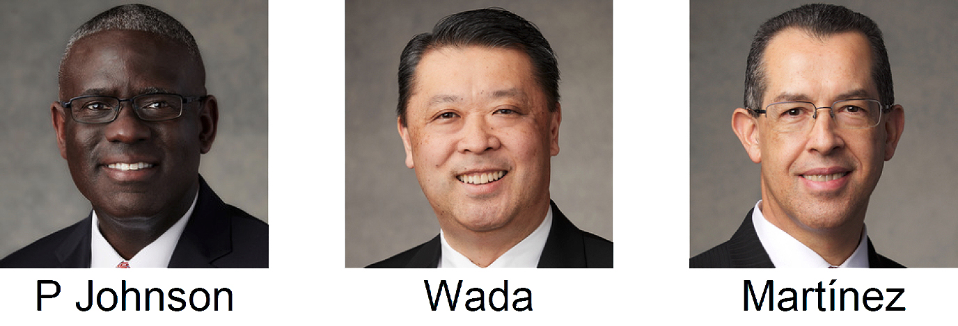 The United States West Area Presidency for 2025–2026, from left to right: Elder Peter M. Johnson, First Counselor; Elder Takashi Wada, President; and Elder Hugo E. Martínez, Second Counselor.
