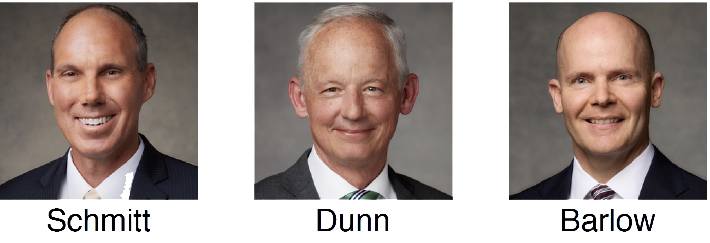 The United States Southwest Area Presidency for 2025–2026, from left to right: Elder Jonathan S. Schmitt, , First Counselor; Elder Michael A. Dunn, President; and Elder Steven C. Barlow, Second Counselor.