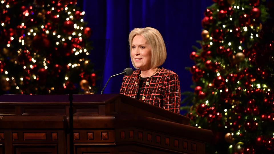 In her eight-minute address to begin the devotional, the global leader of the Church’s organization for children illustrated the perfection of Christ’s gift through her parents’ example of endless giving to her, her siblings and others during a Christmas in her youth.